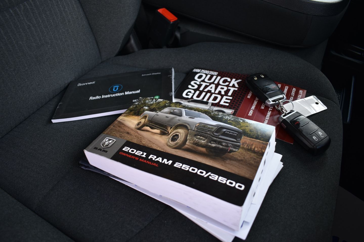 You are looking at a 2021 Dodge Ram 2500 Crew Cab . It is powered with a 6.4L HEMI V8 and automatic transmission. It is equipped with power trailer mirrors, power windows, power locks, tilt, cruise, receiver hitch, and am/fm radio . Also included are the owner's manuals and one keyless remote.