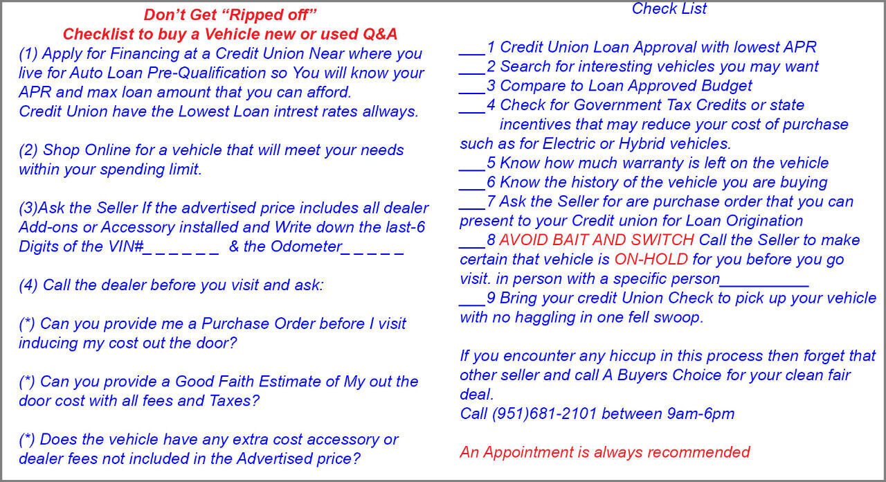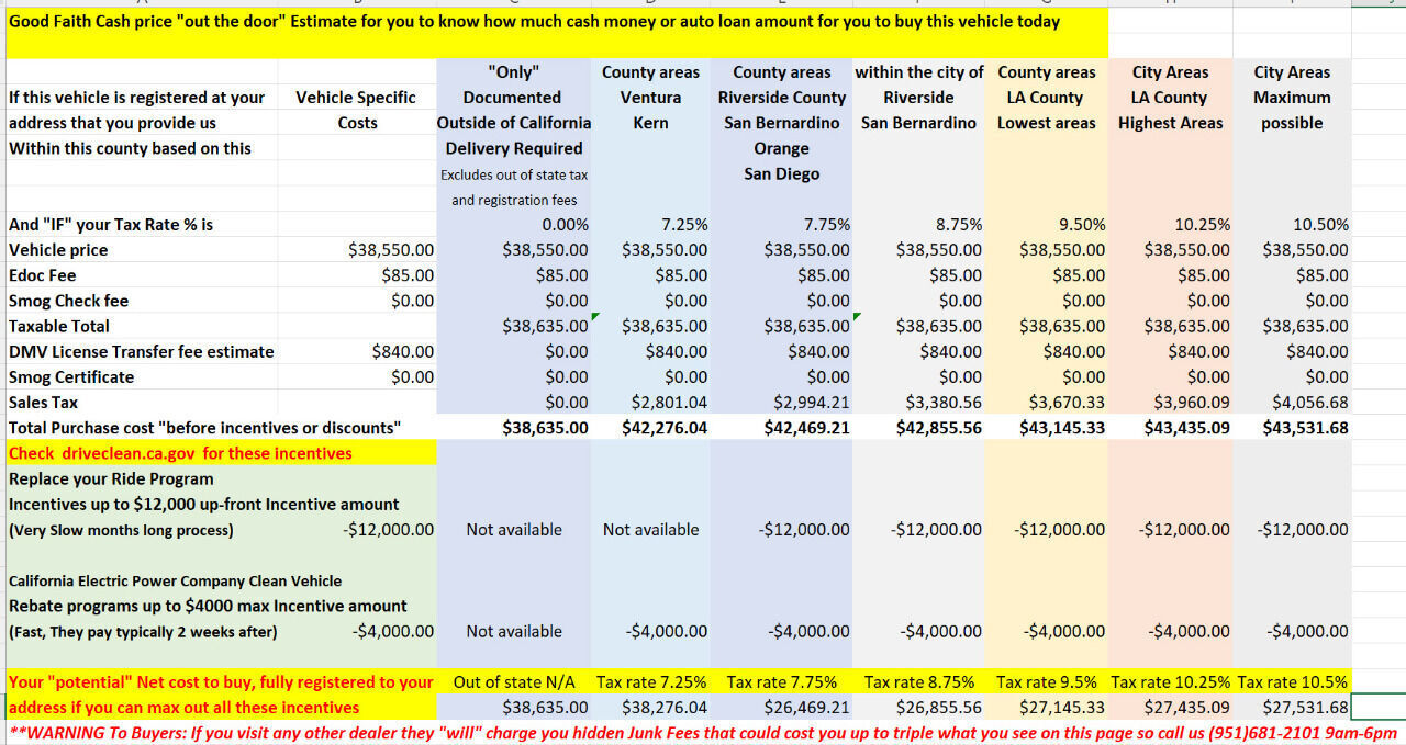 All Buyers should call the seller between 9am-7pm pacific time to ask for a Good Faith out the door cost Estimate of any and all fees based on the exact intended purchase amount and delivery intended.