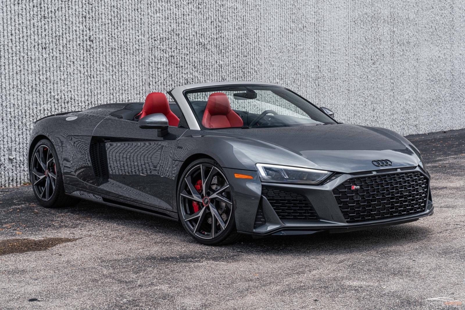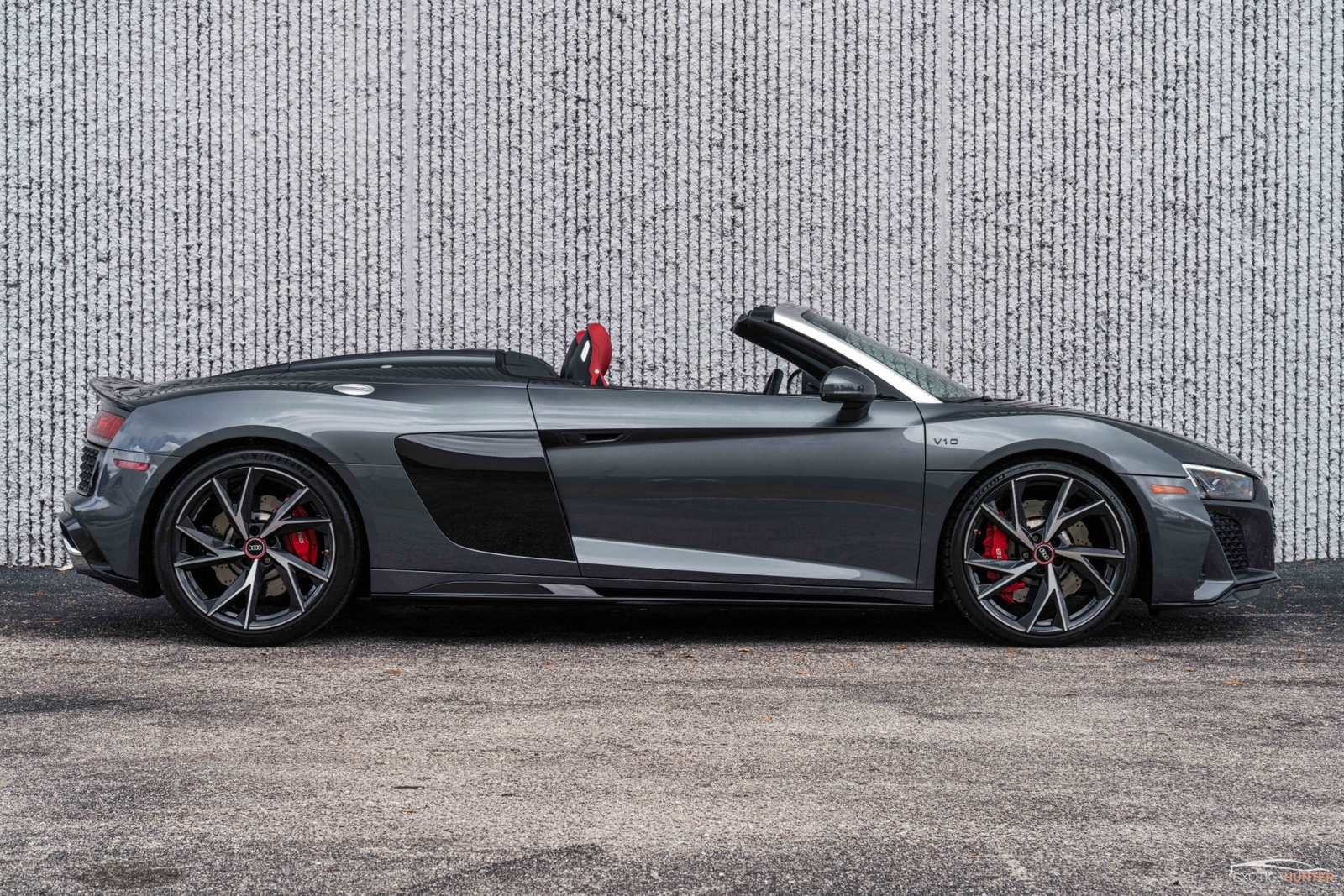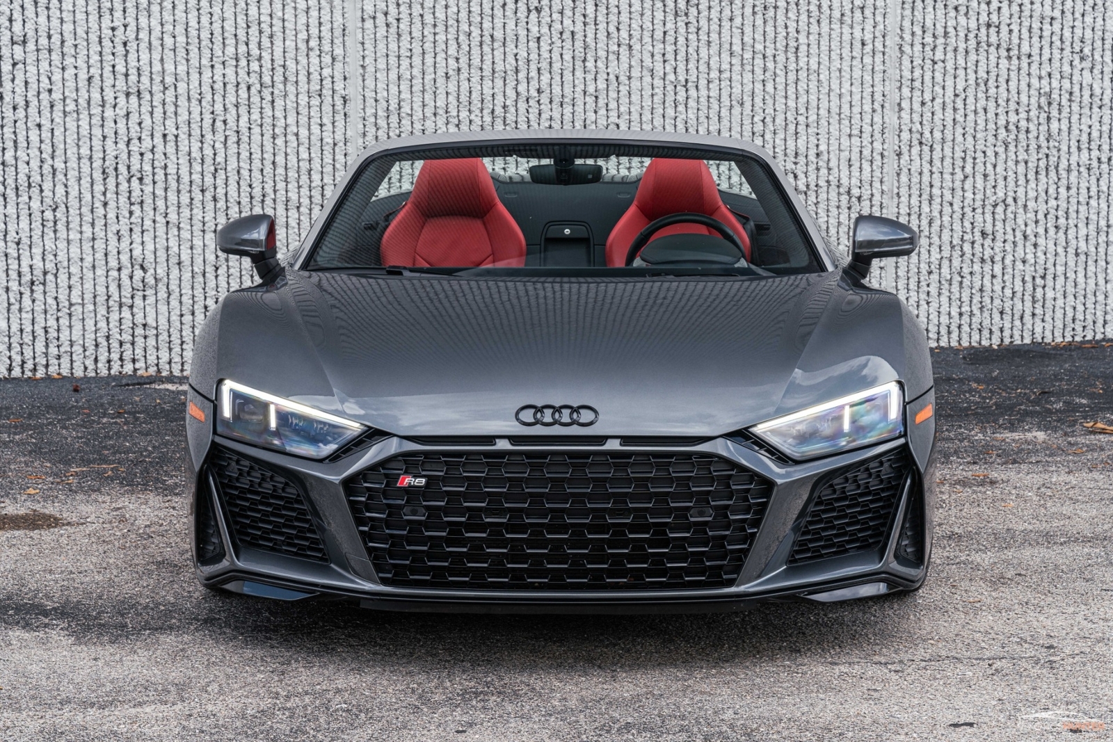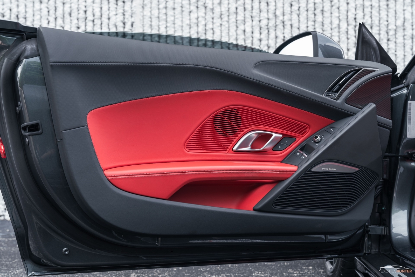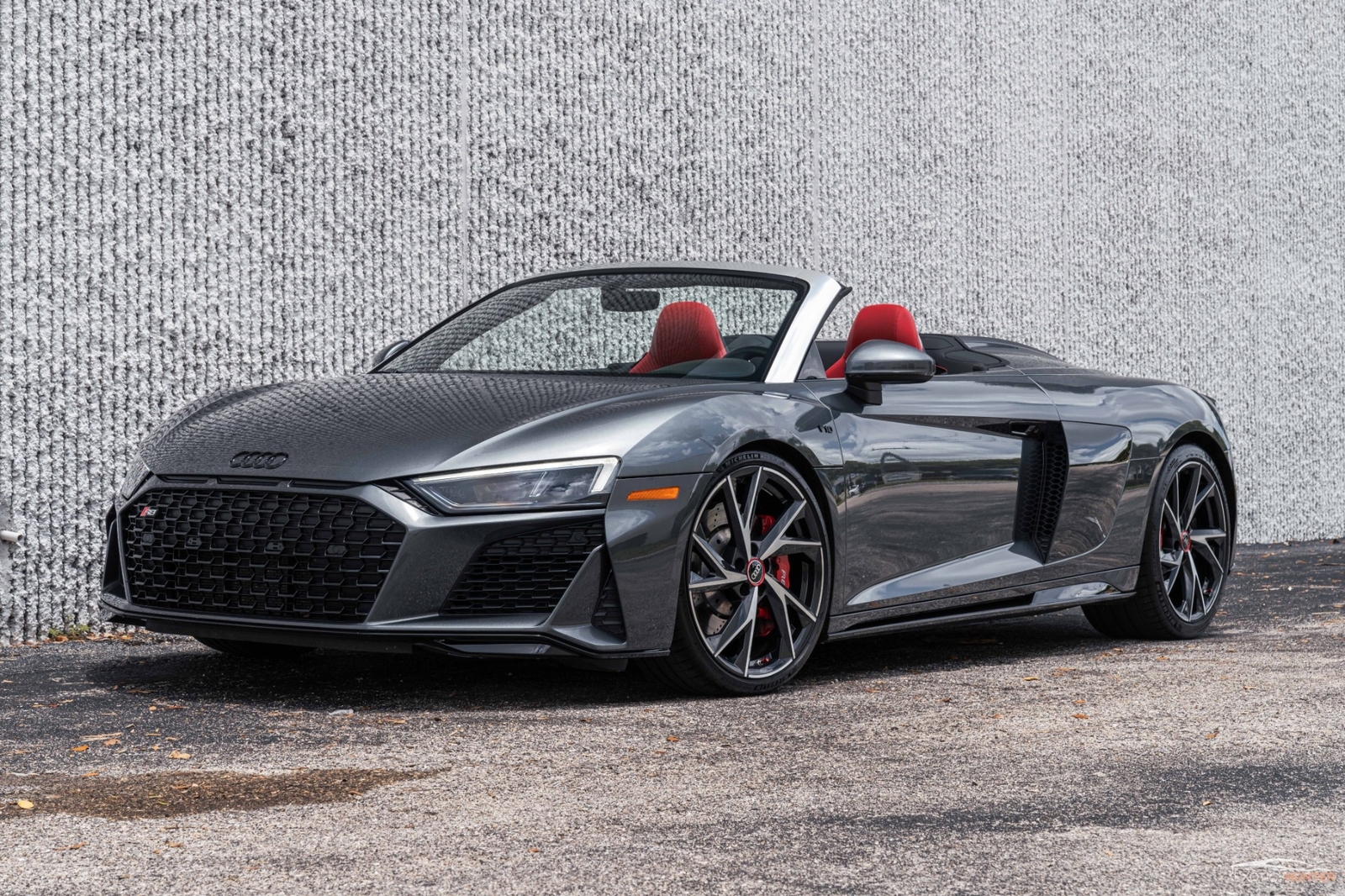 We are thrilled to offer this '21 R8 V10 Spyder in iconic Daytona Grey Pearl paint. This impeccable spec features the premium package including premium B&O sound, extended leather, illuminated door sills, and more. On top of the premium pack, the carbon interior package has also been commissioned onto this spec from the factory. Don't miss the opportunity to make this stunning spec your own.