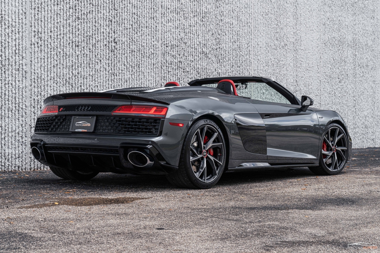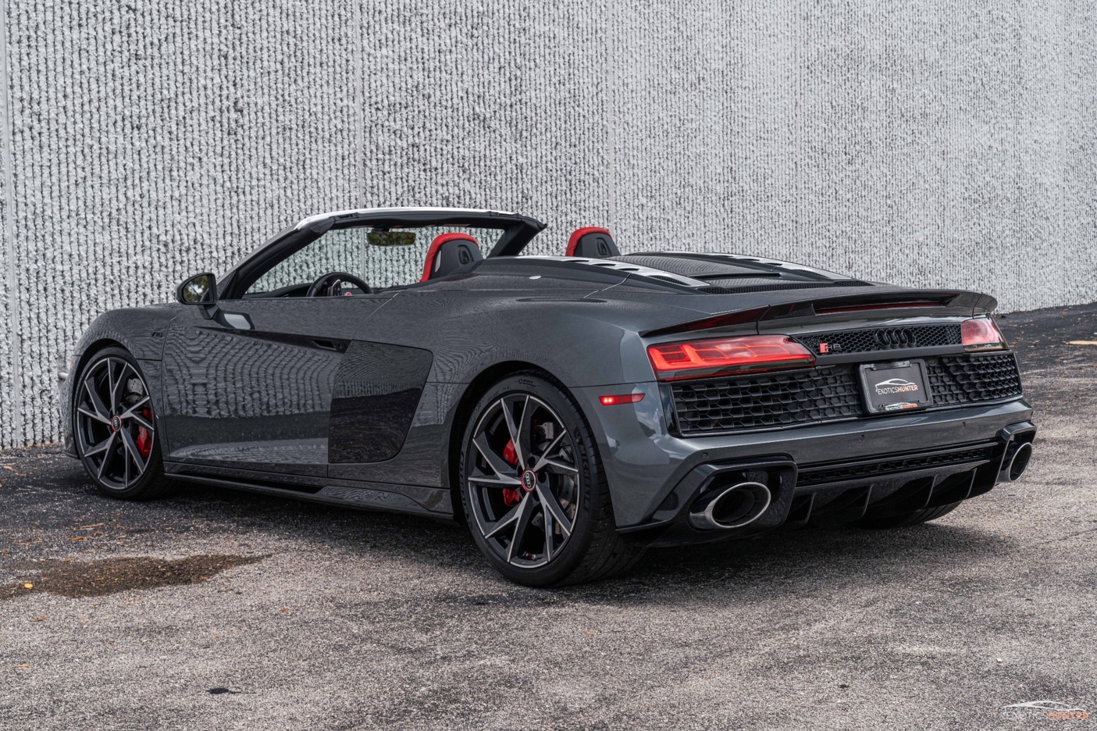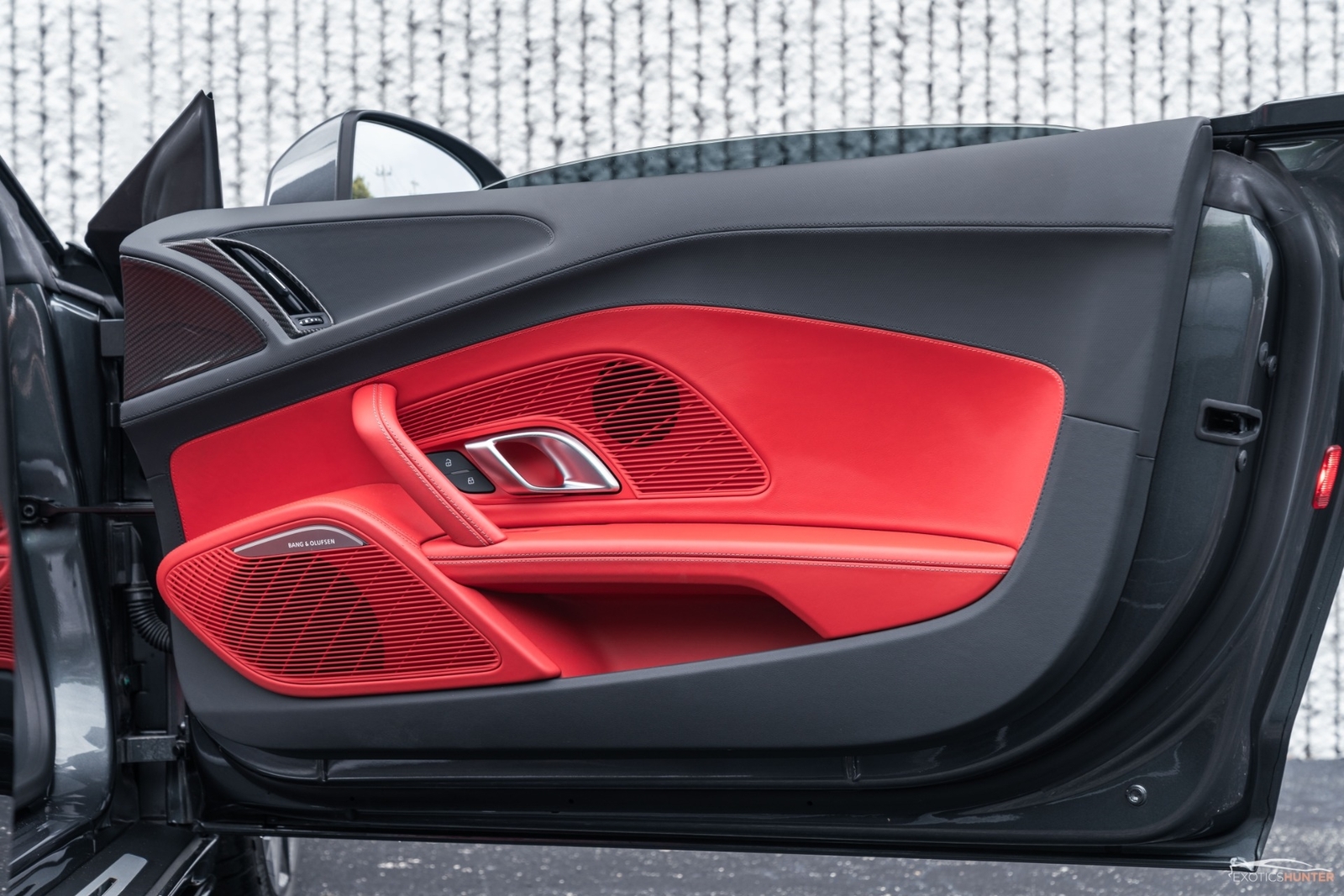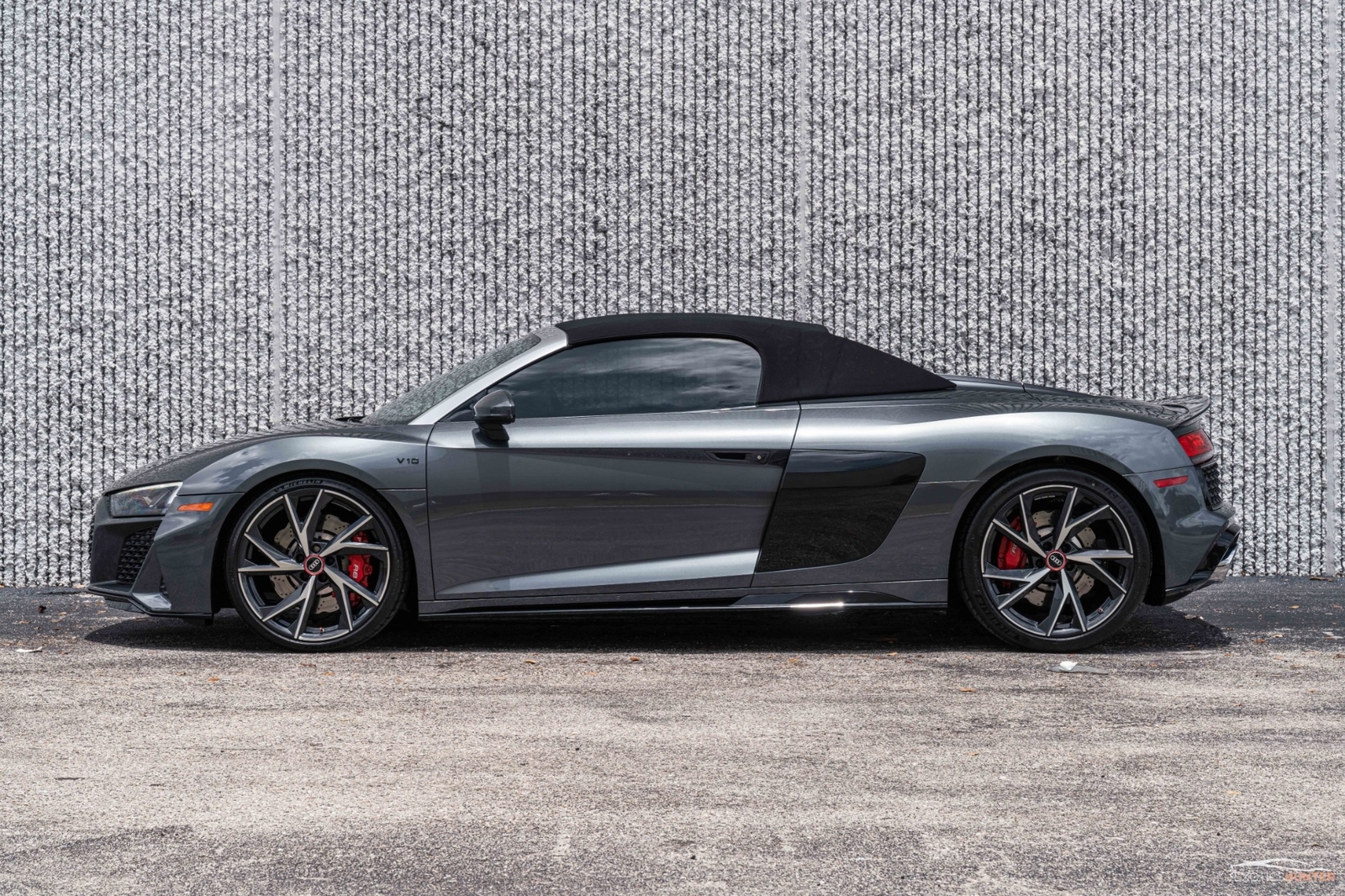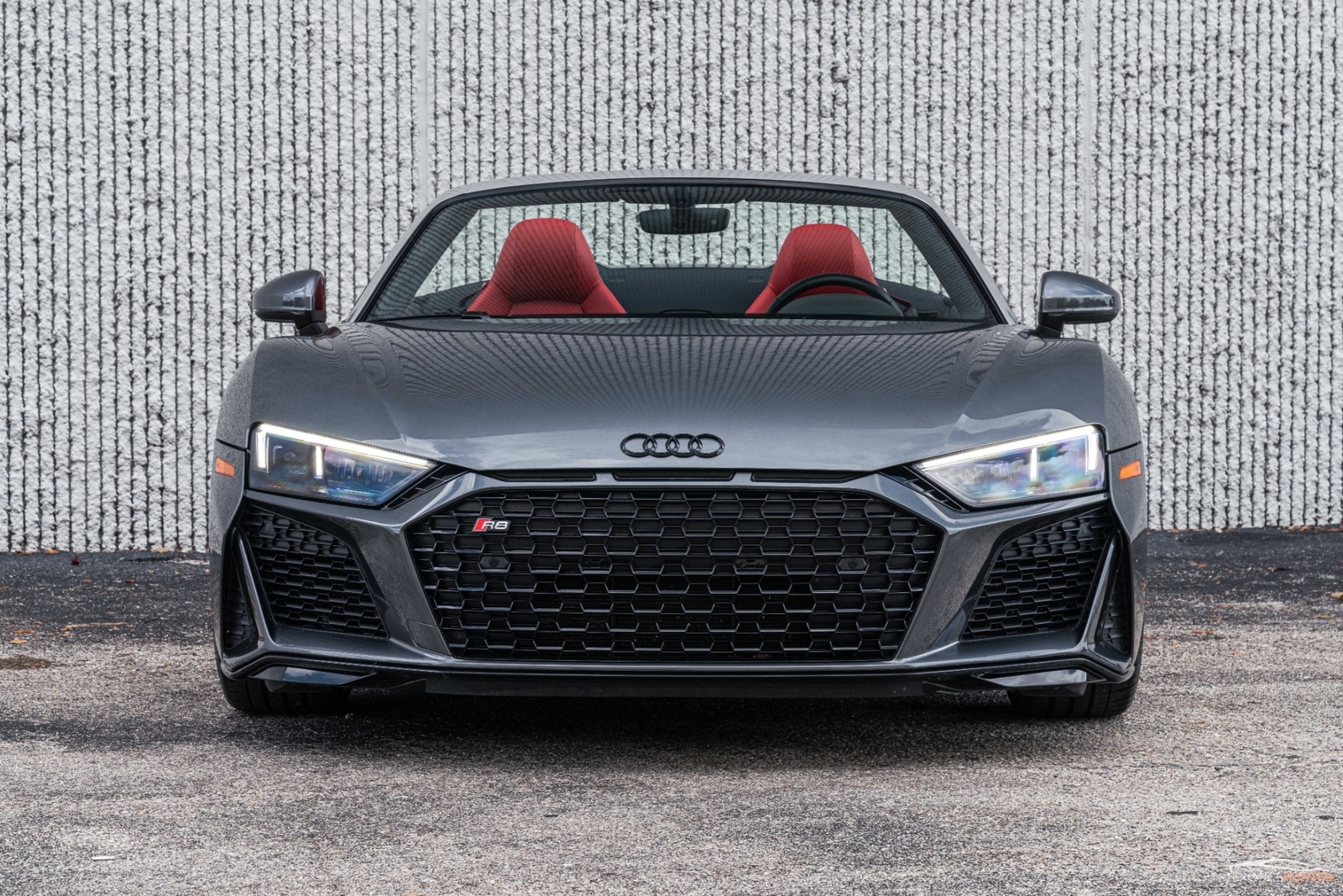 We are thrilled to offer this '21 R8 V10 Spyder in iconic Daytona Grey Pearl paint. This impeccable spec features the premium package including premium B&O sound, extended leather, illuminated door sills, and more. On top of the premium pack, the carbon interior package has also been commissioned onto this spec from the factory. Don't miss the opportunity to make this stunning spec your own.