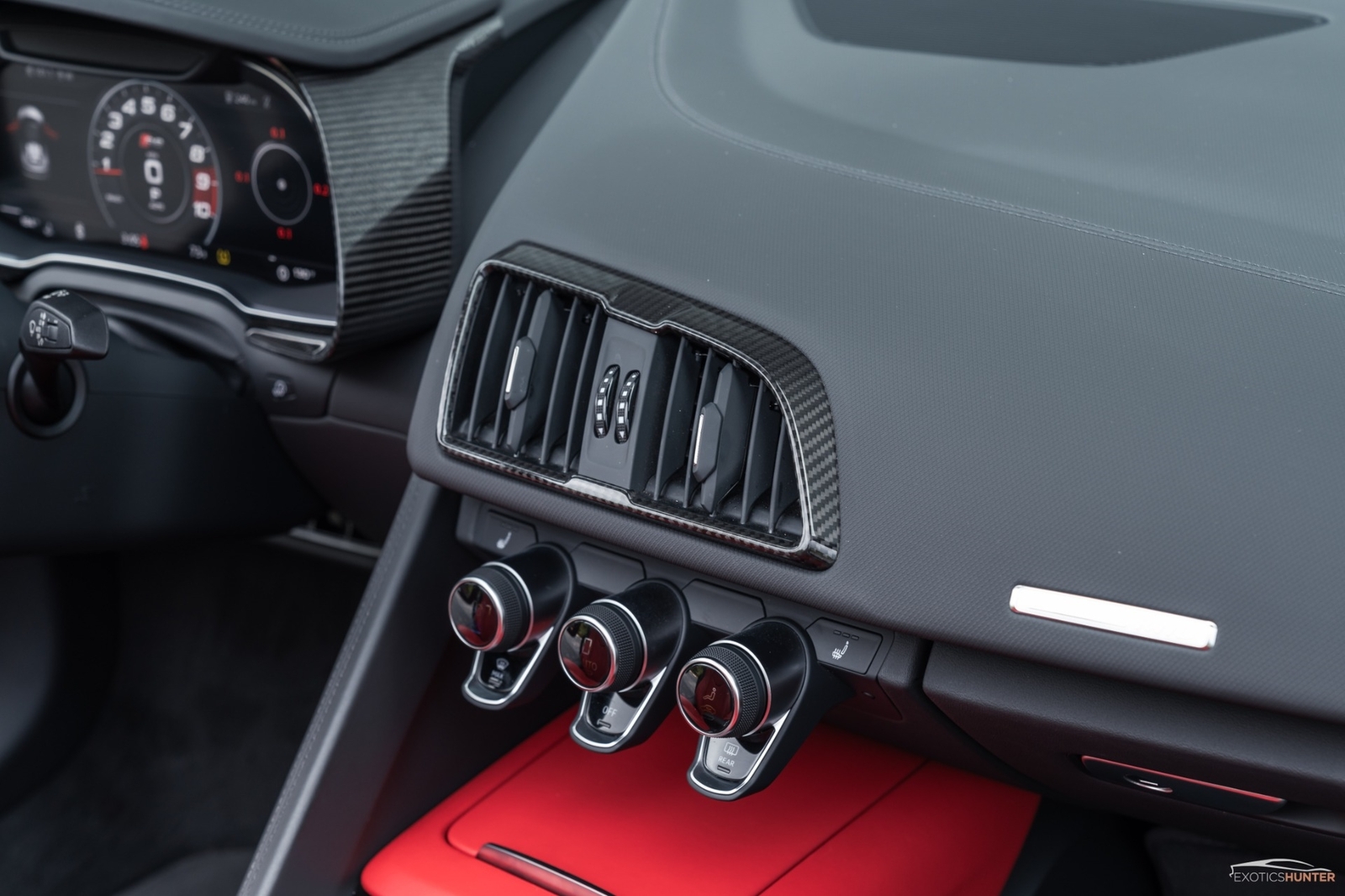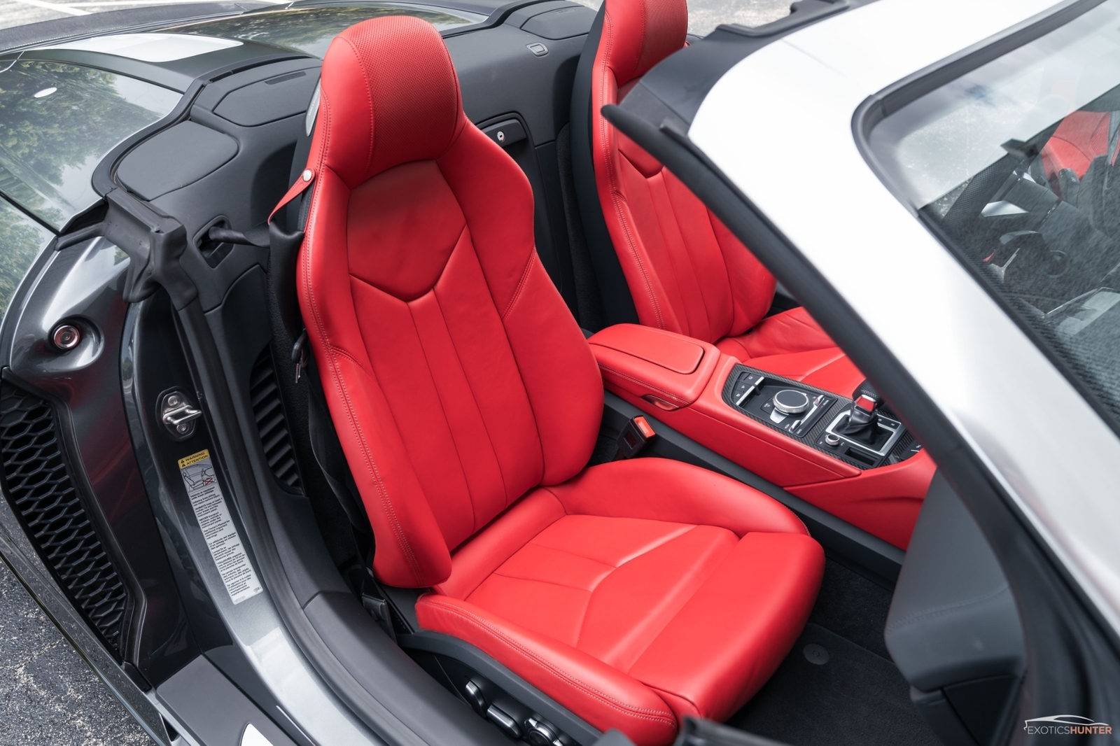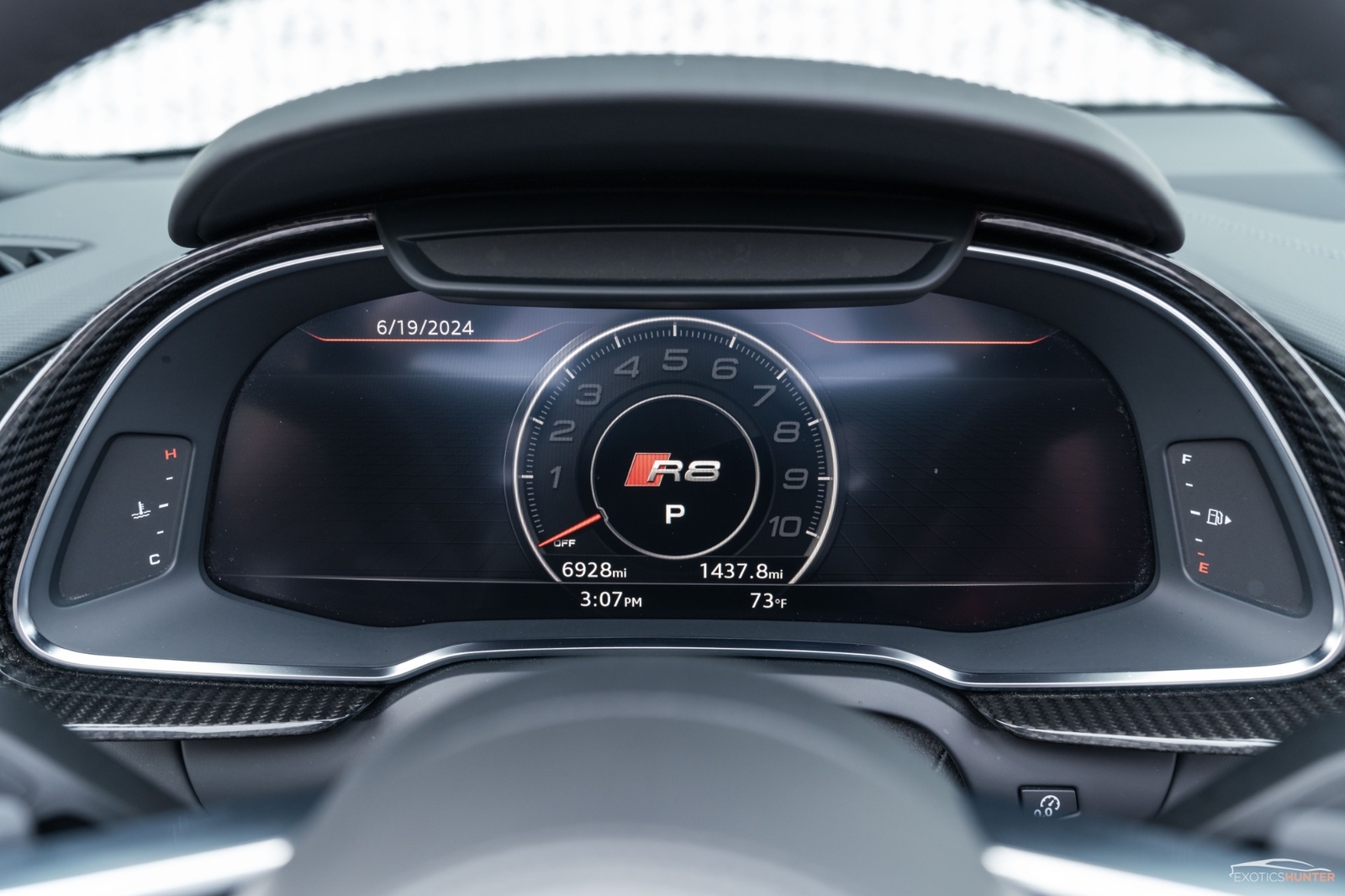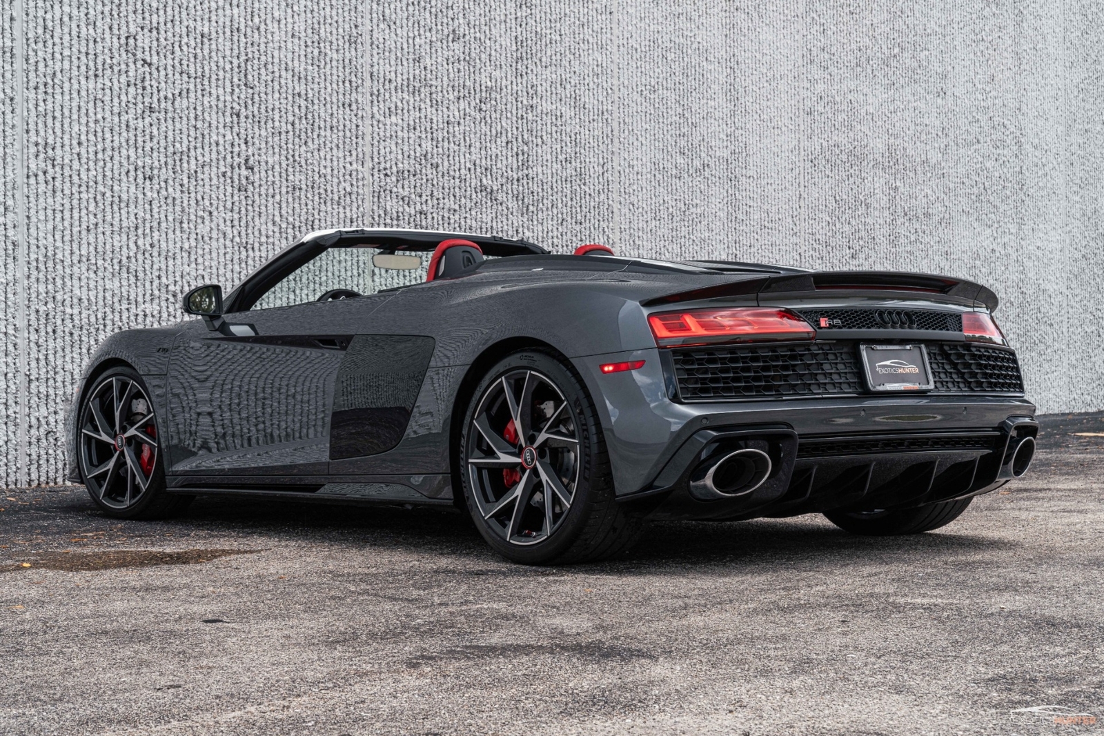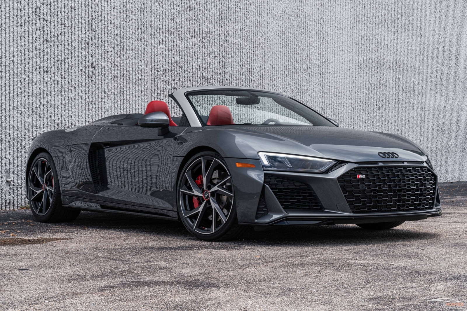 We are thrilled to offer this '21 R8 V10 Spyder in iconic Daytona Grey Pearl paint. This impeccable spec features the premium package including premium B&O sound, extended leather, illuminated door sills, and more. On top of the premium pack, the carbon interior package has also been commissioned onto this spec from the factory. Don't miss the opportunity to make this stunning spec your own.