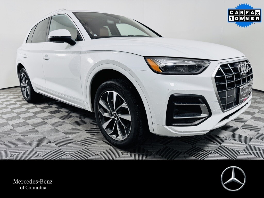 CARFAX One-Owner. Clean CARFAX. White 2021 Audi Q5 45 Premium Plus quattro quattro 7-Speed Automatic S tronic 2.0L Turbocharged GPS Navigation, Back Up Camera, Moonroof, Leather, Heated Seats, Q5 45 Premium Plus quattro, 4D Sport Utility, 2.0L Turbocharged, 7-Speed Automatic S tronic, quattro, White, Okapi Brown w/Leather Seating Surfaces, Adaptive Cruise Control w/Traffic Jam Assist, Audi Active Lane Assist, Audi Advanced Key, Audi Connect PRIME & PLUS, Audi Phone Box, Audi Virtual Cockpit Plus, Auto-Dimming Power Folding Exterior Mirrors, Convenience Package, Driver Seat Memory, Exterior Parking Camera Rear, Hands-On Detection Steering Wheel, Heated front seats, Heated Steering Wheel, Leatherette Covered Center Console & Door Armrests, MMI Navigation Plus, Navigation Package, Navigation System, Panoramic Sunroof, Power Liftgate, Premium Plus Package, SiriusXM All Access Service, Top View Camera System, Wheels: 19 5-Double-Arm Design Bi-Color Finish.
