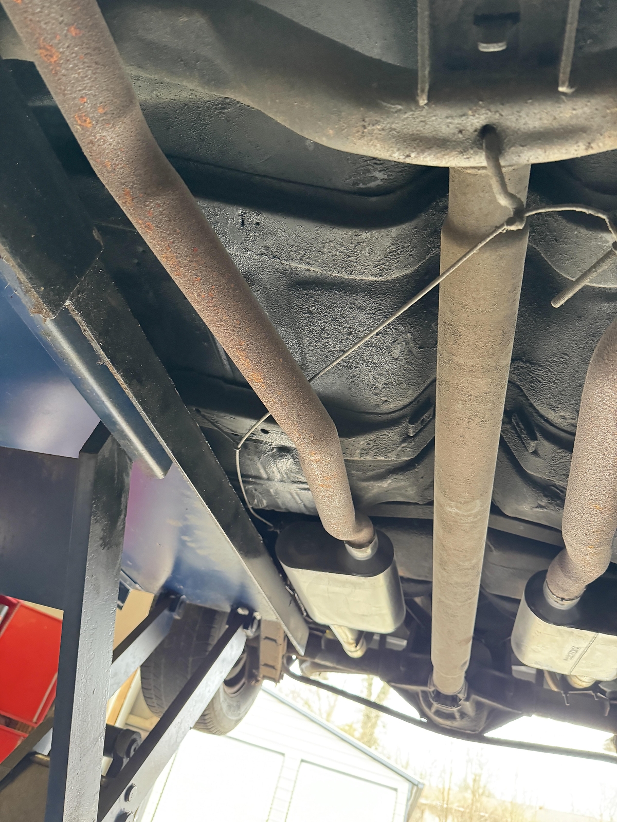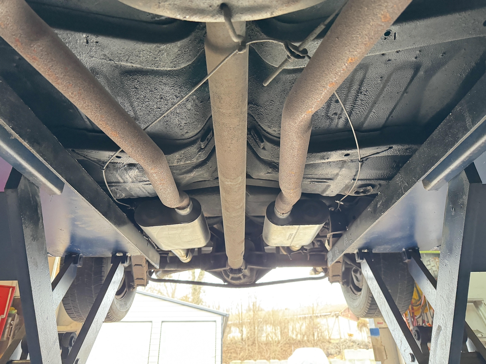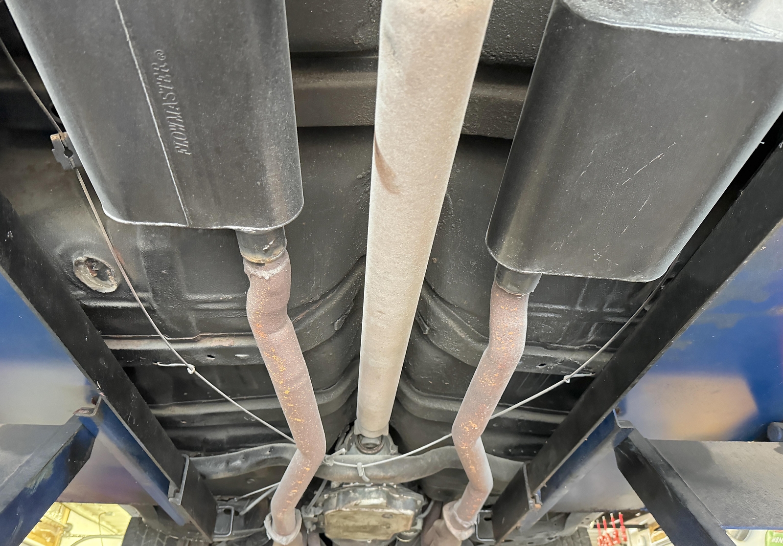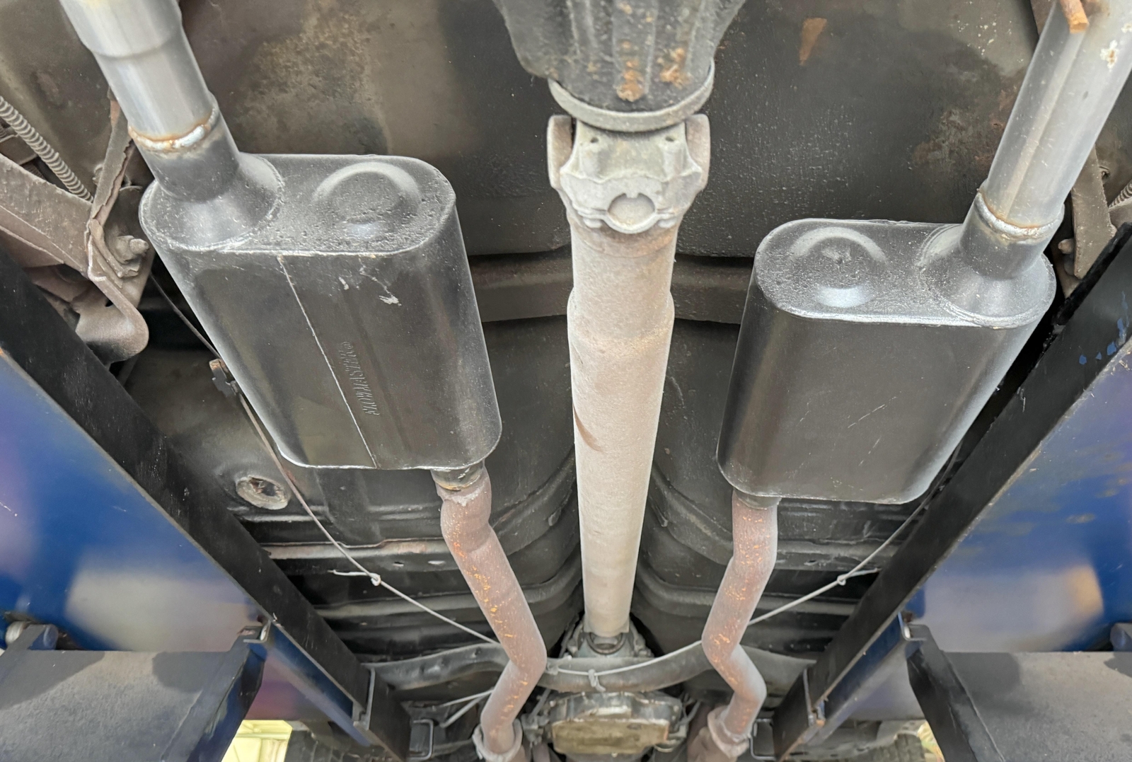 DUAL EXHAUST WITH FLOWMASTER MUFFLERS …..ALL WAY OUT BACK WITH CORRECT CHROME TIPS……SOUNDS AWESOME!
