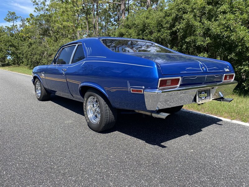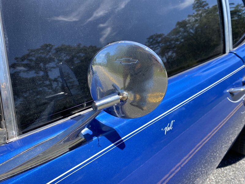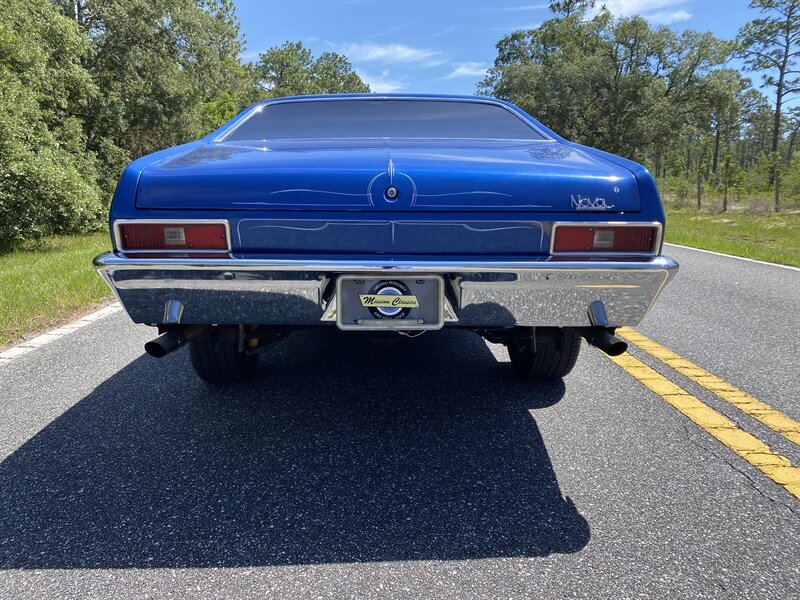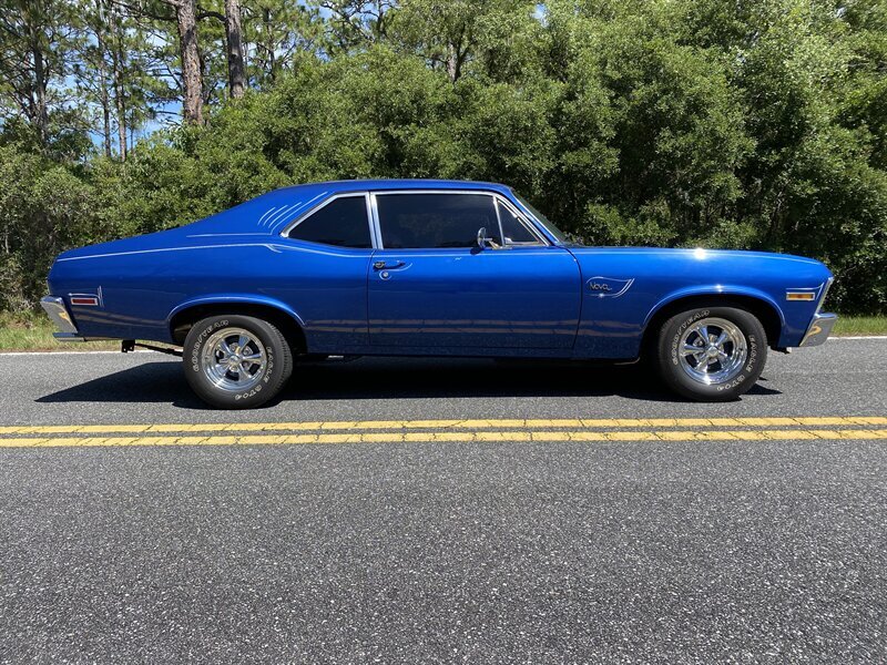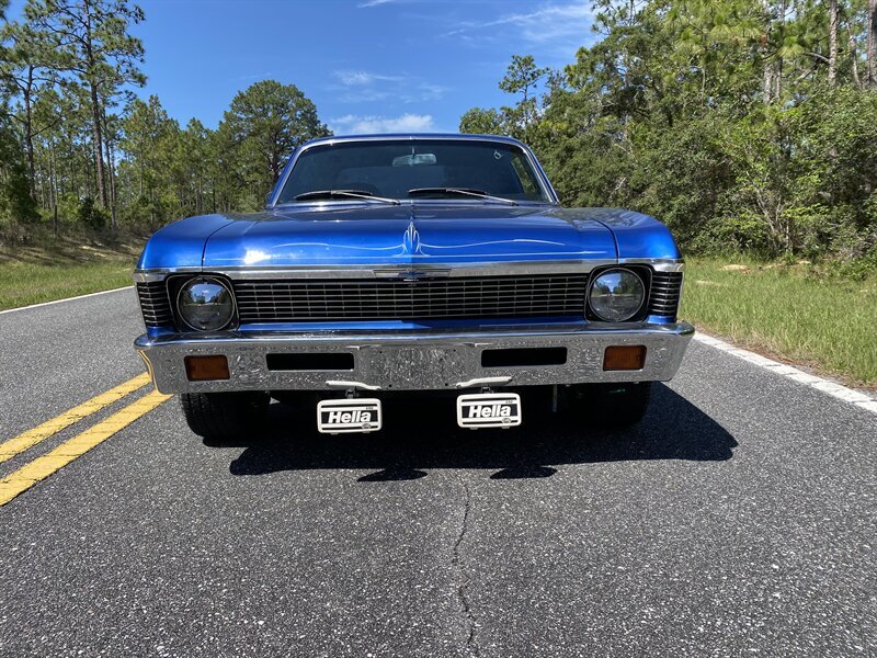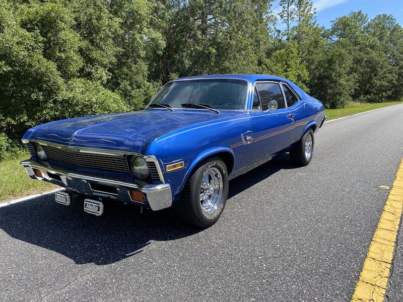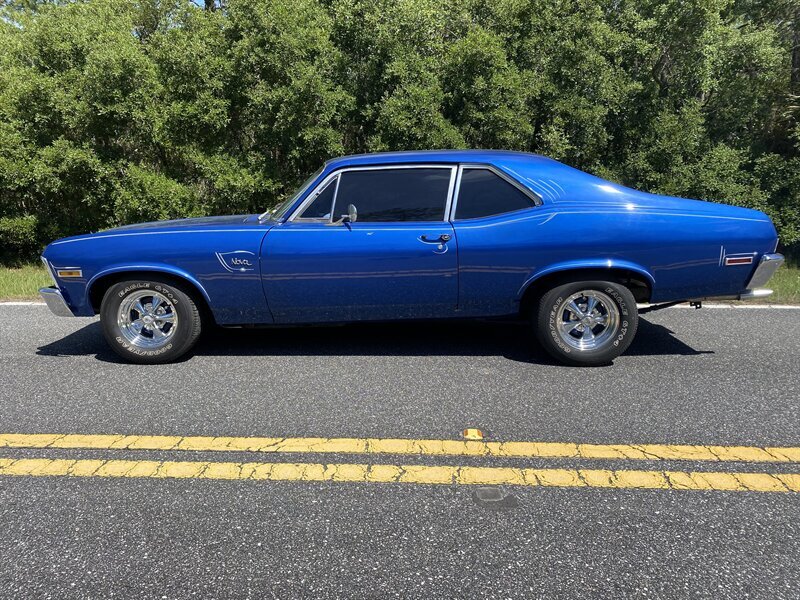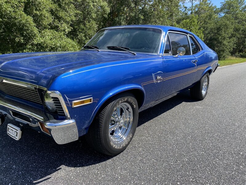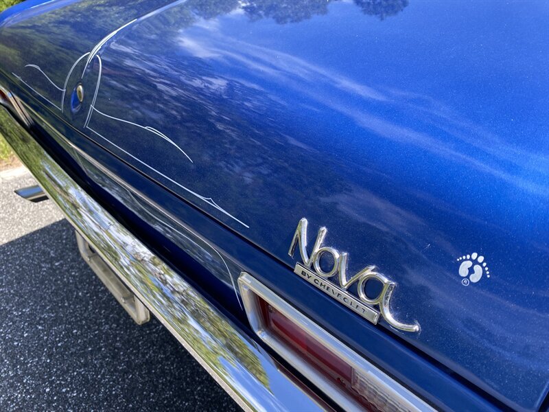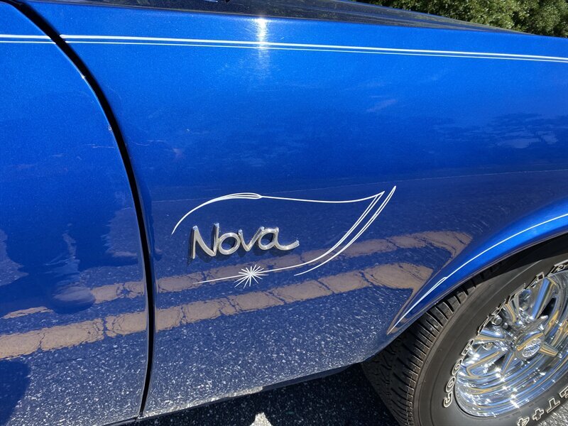 Finished in a custom blue with custom pinstriping, the car’s paint and trim look great. This generation of Nova came with a 111.1-inch wheelbase, and drove like a much larger car. The chrome bumpers fit tightly to the body and the engine bay is very tidy.