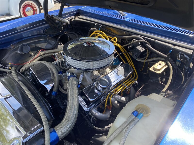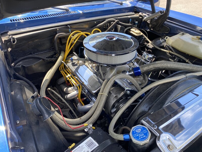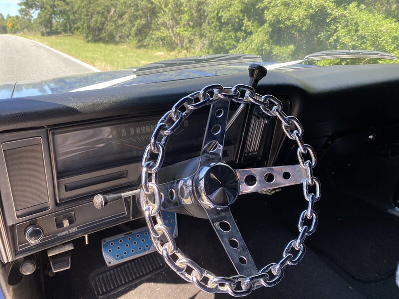 Under the hood is a rebuilt 350 CID V-8 engine with dual exhausts. The motor is backed by a Turbo Hydramatic 350 three-speed automatic transmission with a shift kit. Driver convenience features include power steering and Hella fog lights. This car has four-wheel drum brakes.