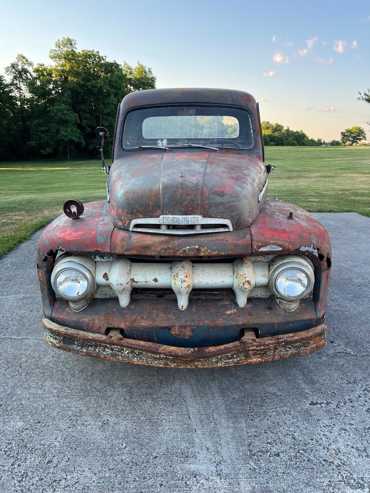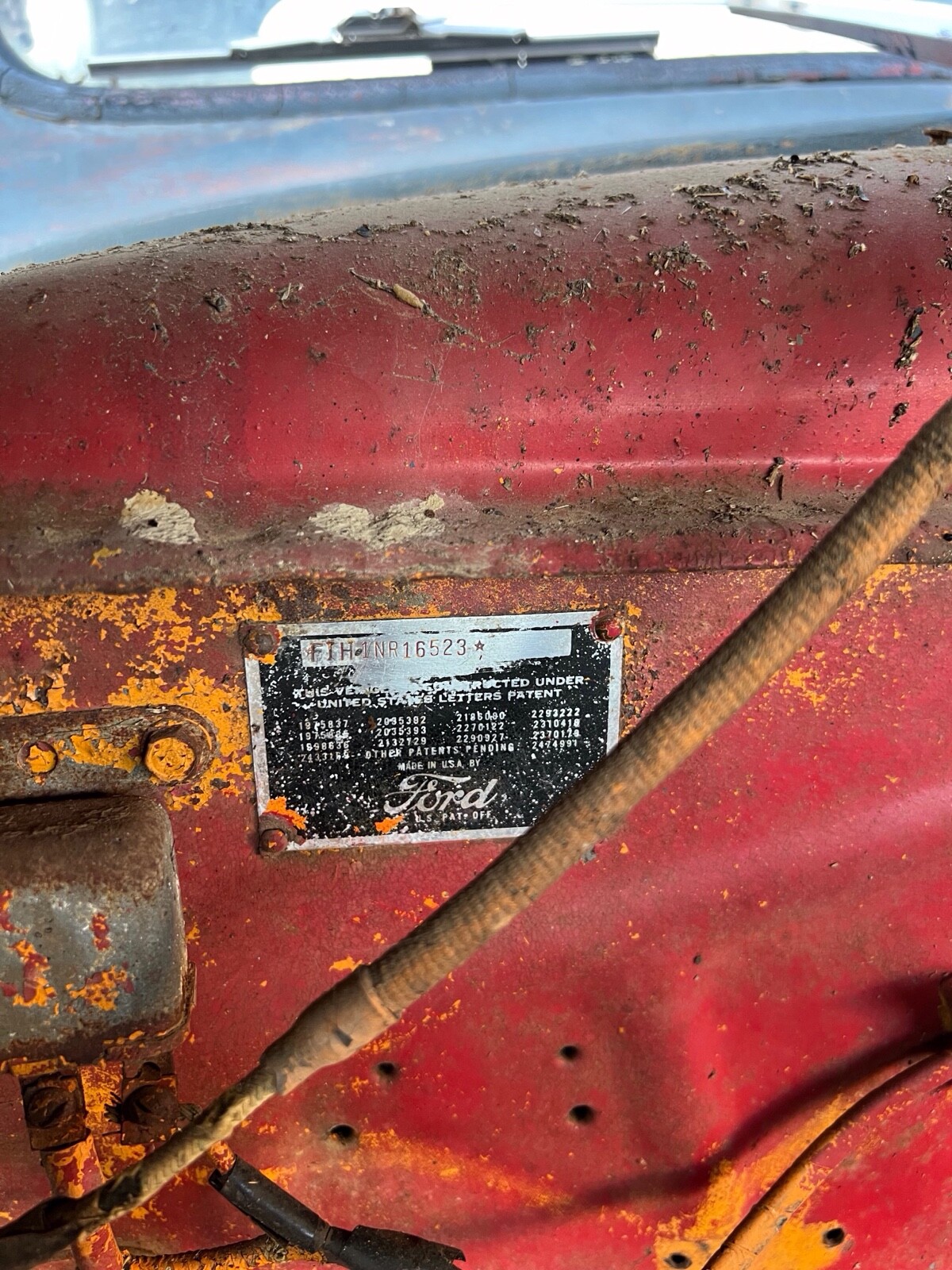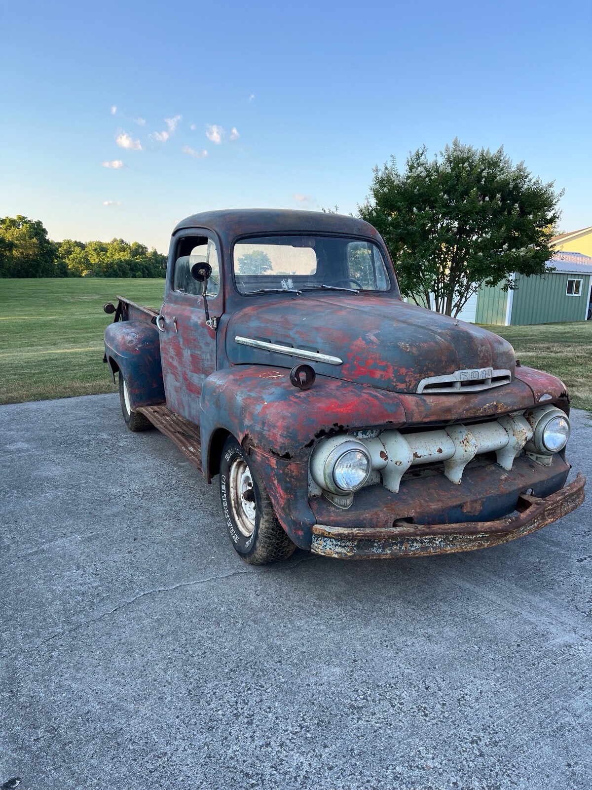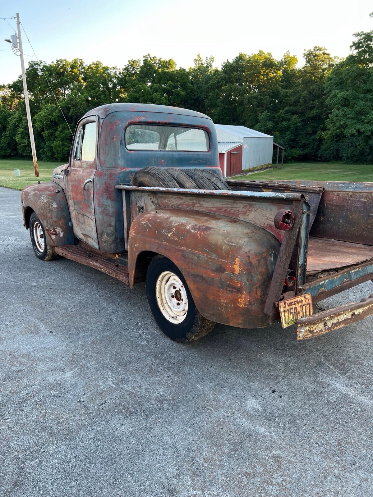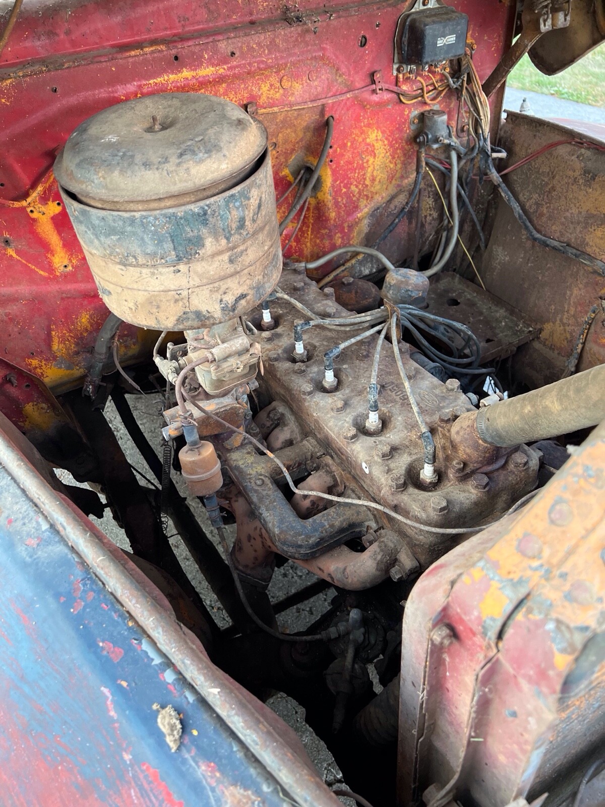1951 Ford F-1. Purchased several years ago from someone who purchased it from an estate sale near Culpeper, Virginia. It was on a farm and had not been on the road since 1971. Guessing from the colors it had been painted as seen under the hood I am guessing it may have belonged to a fire department in its early years. It was built in Norfolk Va and I believe it has always been in Virginia. I am unsure of the condition of the engine and drivetrain. It has the usual Ford truck rusty spots. Pretty solid truck overall for the year. Great project.