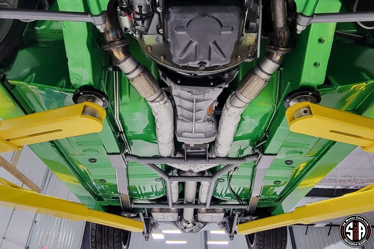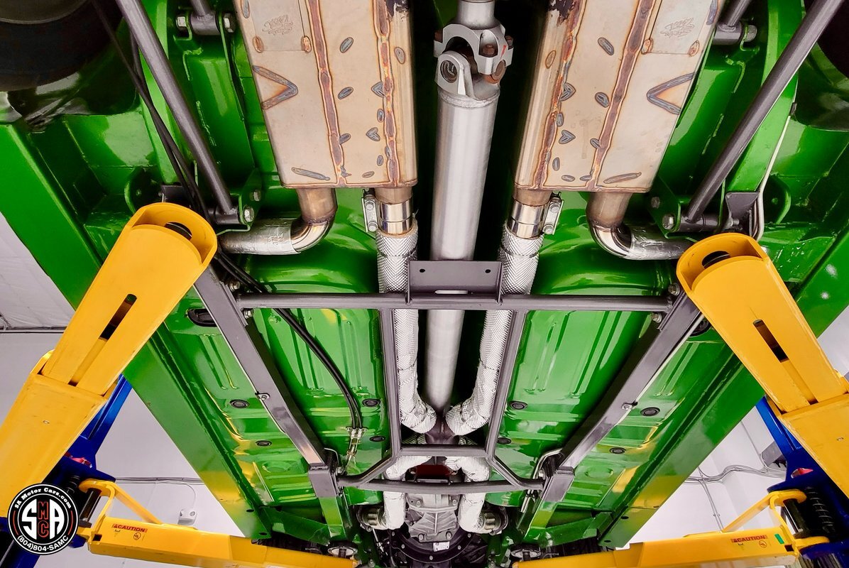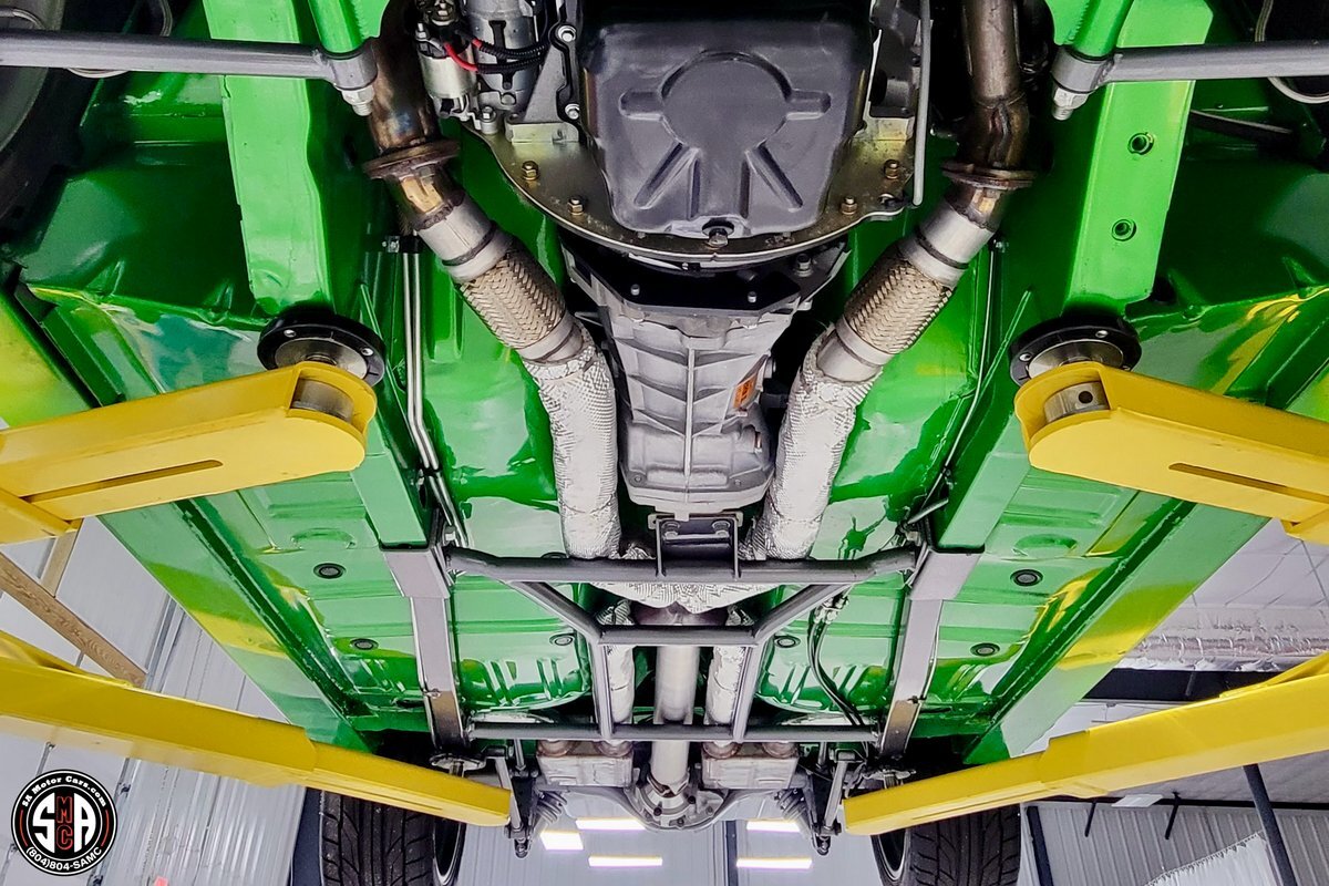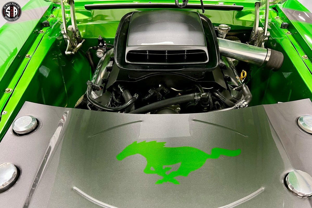 Powering this Ford is an Electrically Fuel Injected Ford 5.0L Gen 2 Coyote V8 Engine with a Cold Air Intake and Stainless-Steel Exhaust Headers! The engine bay of this Mustang is completely customized! An Aluminum Radiator that's paired with Dual Electric Cooling Fans keeps this powerplant running nice and cool. Coyote power is sent to the rear tires through a Tremec T56 6-Speed Manual Transmission, an Aluminum Driveshaft, and a Moser 9'' Posi Rear End with approximately 3.55:1 Gears! This Mustang is loaded with Air Conditioning, Power Rack and Pinion Steering, and Wilwood 4-Wheel Power Disc Brakes with Drilled and Slotted Rotors! The underside of this '70 features Body Color Painted Floorboards along with a multitude of custom components! You won't hesitate to place a set of mirrors underneath this Ford any day of the week to display the nice condition of the Frame Members with Frame Ties and Custom Bracing, Painted Fuel Tank, Heidts Independent Front Suspension with Tubular Upper and Lower Control Arms, 4-Link Rear Suspension, Coilover Shocks Front and Rear, along with the Stainless Steel Dual Exhaust System that's fitted with an X-Pipe, SpinTech Mufflers, and Thermal Insulation!