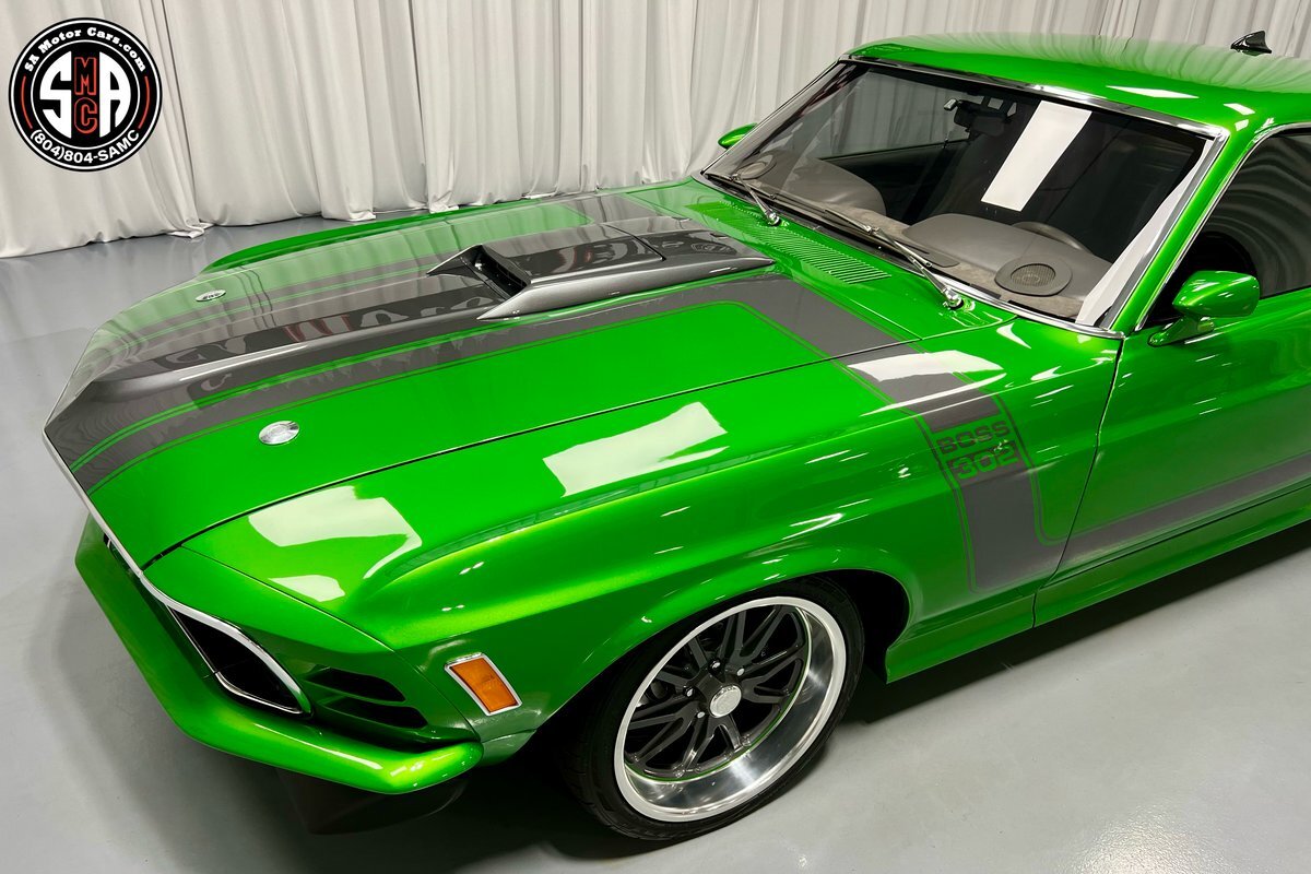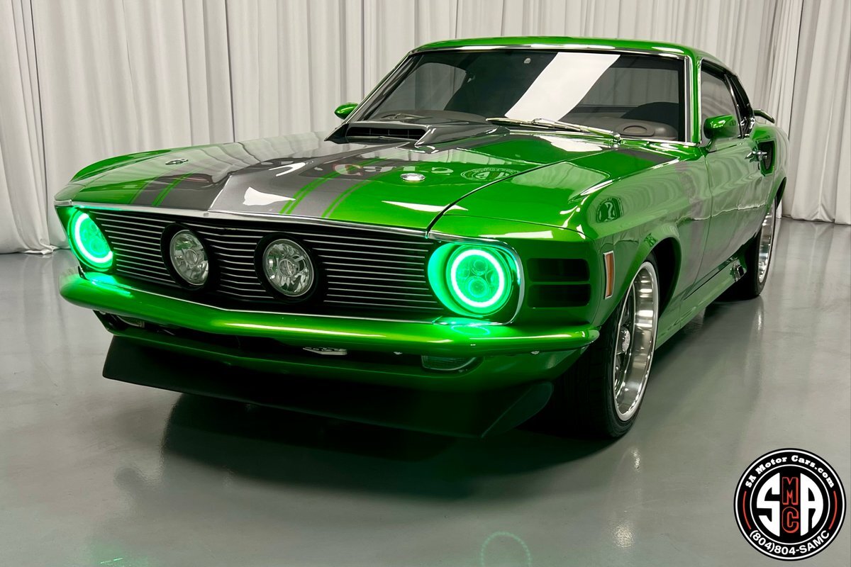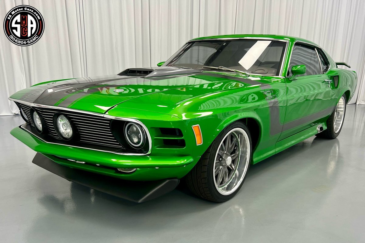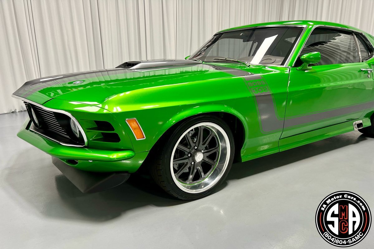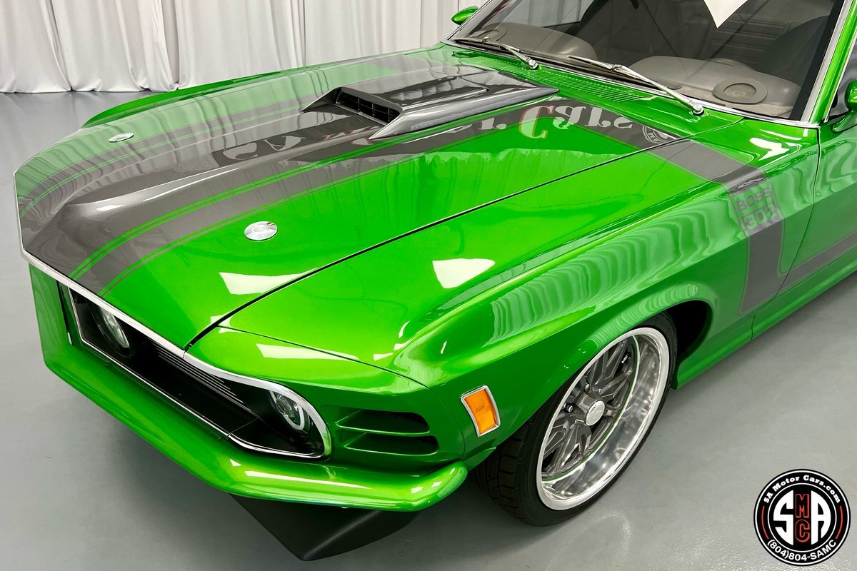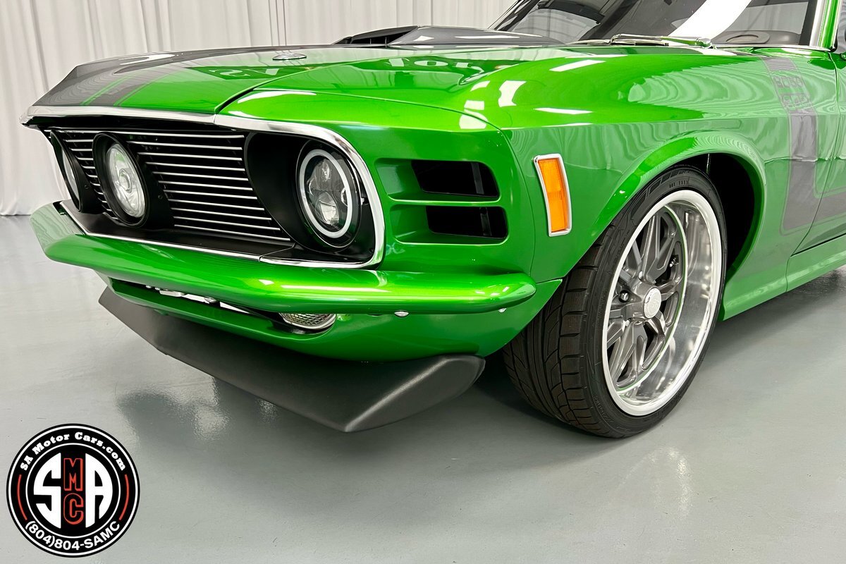 Check out this stunning 1970 Ford Mustang Fastback Restomod! This Mustang has undergone a complete Rotisserie Build and lots of customizations and performance upgrades that have been added! Take a look at these sweeping body lines, Green Exterior Paint with Painted Boss 302 Stripes, Custom Shaker Hood with a Hood Scoop and Hood Pins, Custom Metal Ground Effects, Front and Rear spoilers, Back Up Camera, 18'' U.S. Mags Aluminum Wheels with Polished Lips, LED Halo Headlights, Custom Grille with Front Fog Lights, Shelby Style LED Taillights, Custom 3rd Brake Light, Painted Bumpers with a Tucked and Smoothed Rear bumper, along with the Side-Exit Exhaust Tips! Inside, this Ford is sporting Power Windows, Tilt Steering Column, Custom 4-Spoke Steering Wheel, TMI Front Bucket Seating, Rear Bench Seating, Gray Leather and Suede Upholstery throughout, Gray Carpeting with Embroidered Floor Mats, Dakota Digital Dashboard Gauges, Custom Center Console with Cup Holders with an USB Input, Custom Shifter, Machined Air Vents, Custom Audio System with a Pioneer Bluetooth Capable Head Unit, Rockford Fosgate and Kicker Audio Components, along with a Spare Tire that's located in the Custom Upholstered Trunk!