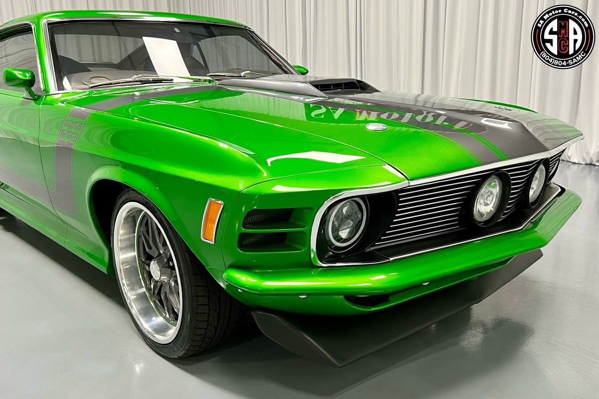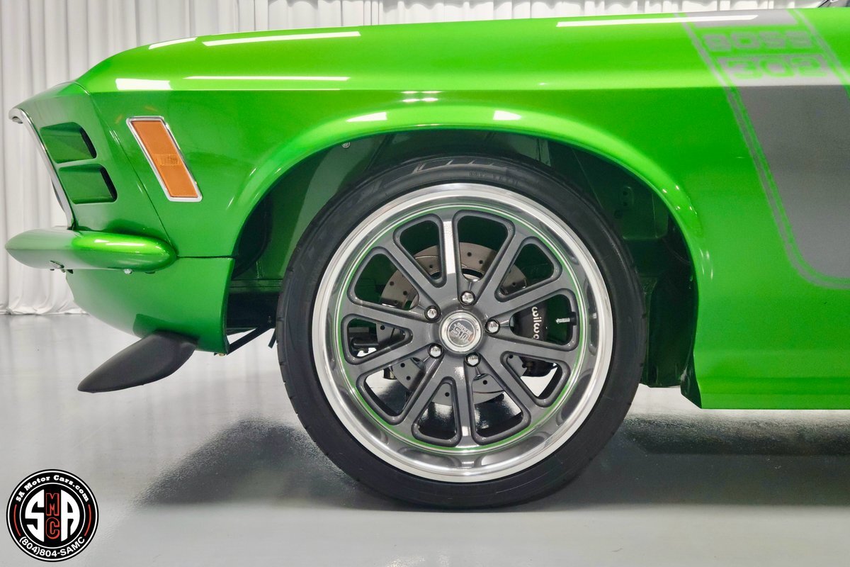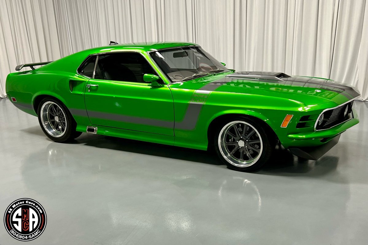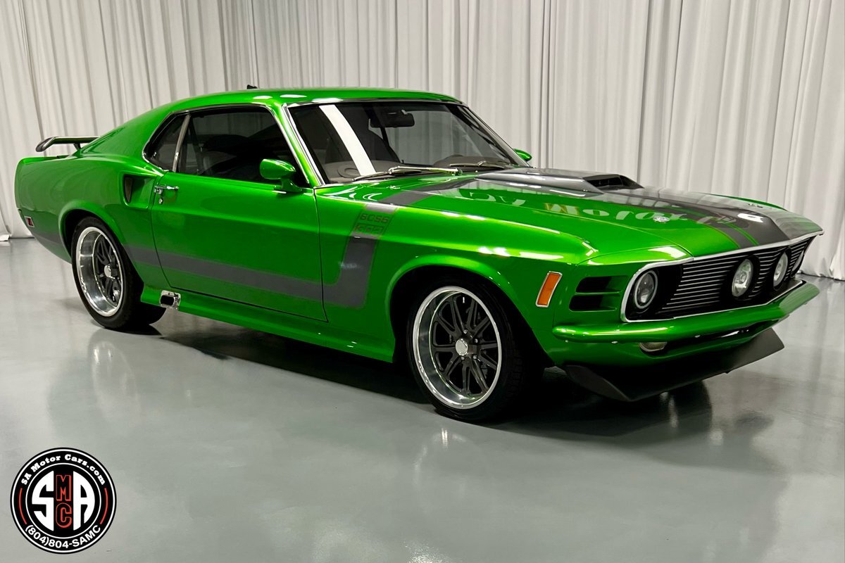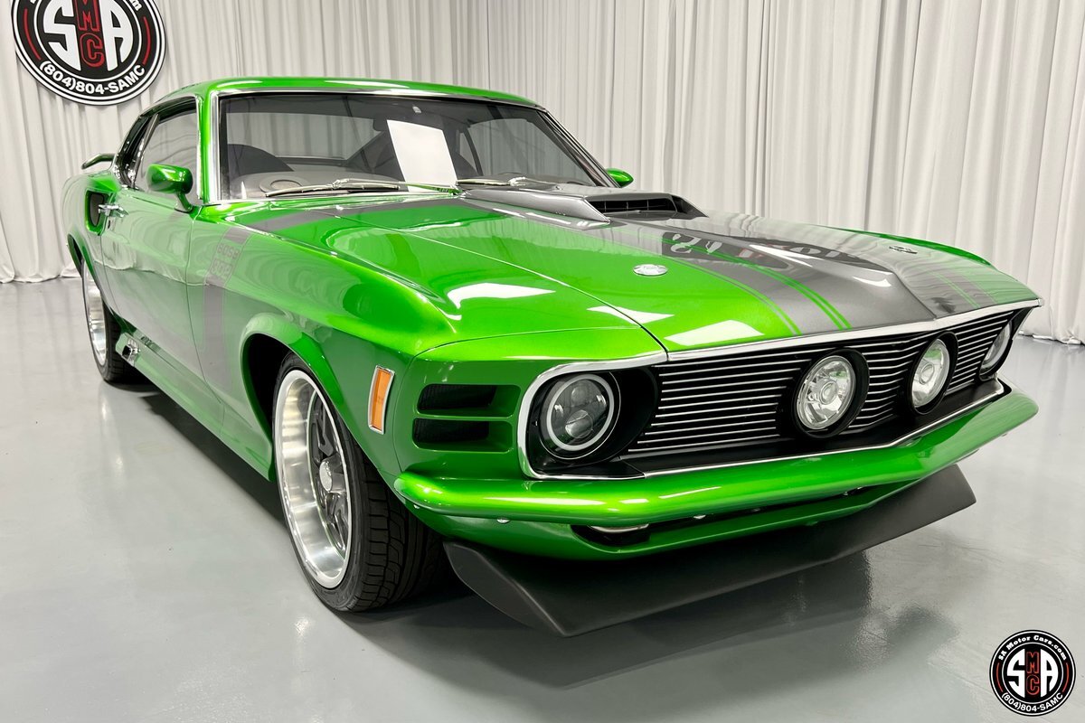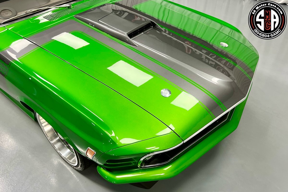 Check out this stunning 1970 Ford Mustang Fastback Restomod! This Mustang has undergone a complete Rotisserie Build and lots of customizations and performance upgrades that have been added! Take a look at these sweeping body lines, Green Exterior Paint with Painted Boss 302 Stripes, Custom Shaker Hood with a Hood Scoop and Hood Pins, Custom Metal Ground Effects, Front and Rear spoilers, Back Up Camera, 18'' U.S. Mags Aluminum Wheels with Polished Lips, LED Halo Headlights, Custom Grille with Front Fog Lights, Shelby Style LED Taillights, Custom 3rd Brake Light, Painted Bumpers with a Tucked and Smoothed Rear bumper, along with the Side-Exit Exhaust Tips! Inside, this Ford is sporting Power Windows, Tilt Steering Column, Custom 4-Spoke Steering Wheel, TMI Front Bucket Seating, Rear Bench Seating, Gray Leather and Suede Upholstery throughout, Gray Carpeting with Embroidered Floor Mats, Dakota Digital Dashboard Gauges, Custom Center Console with Cup Holders with an USB Input, Custom Shifter, Machined Air Vents, Custom Audio System with a Pioneer Bluetooth Capable Head Unit, Rockford Fosgate and Kicker Audio Components, along with a Spare Tire that's located in the Custom Upholstered Trunk!