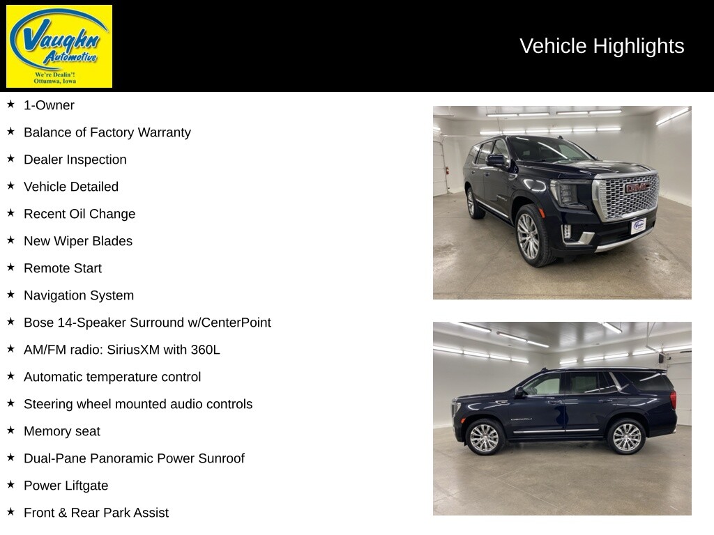 1-Owner, Balance of Factory Warranty, Dealer Inspection, Vehicle Detailed, Recent Oil Change, New Wiper Blades, Remote Start, EcoTec3 6.2L V8, 10-Speed Automatic with Overdrive, 4WD, Midnight Blue Metallic, Jet Black w/Perforated Leather Seating Surfaces, AM/FM radio: SiriusXM with 360L, Auto High-beam Headlights, Automatic temperature control, Bose 14-Speaker Surround w/CenterPoint, Dual-Pane Panoramic Power Sunroof, Front & Rear Park Assist, Garage door transmitter, HD Surround Vision, Heated & Ventilated Driver & Front Passenger Seats, Heated Steering Wheel, Hitch Guidance w/Hitch View, Memory seat, Navigation System, Power Liftgate, Rain sensing wipers, Steering wheel mounted audio controls. EcoTec3 6.2L V8 Midnight Blue Metallic 2023 GMC Yukon Denali Priced below KBB Fair Purchase Price!