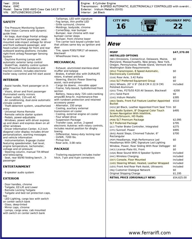 $54,625 ORIGINAL MSRP!! 2016 GMC SIERRA 1500 CREW CAB SLT SHORT BED 4X4!! 5.3L V8 ENGINE, 8 SPEED AUTOMATIC TRANSMISSION, IRIDIUM GLOSS METALLIC EXTERIOR, JET BLACK LEATHER INTERIOR, PREMIUM PACKAGE, SLT PREFERRED PACKAGE, SLIDING REAR WINDOW, HEATED STEERING WHEEL, REAR PARKING AID, 20in POLISHED WHEELS WITH ALL SEASON BLACKWALL TIRES, FULL LEATHER BUCKET HEATED FRONT SEATS, TRAILER BRAKE CONTROLLER, POWER SUNROOF, 6in CHROME TUBULAR ASSIST STEPS, 3.42 GEAR RATIO, WIRELESS CHARGING PAD, 8in COLOR TOUCH SCREEN WITH NAVIGATION, HD RADIO WITH SIRIUS XM, APPLE CARPLAY AND ANDROID AUTO, BOSE PREMIUM SURROUND SOUND SYSTEM, TRAILER HITCH, LED LIGHTING IN BED, UNIVERSAL GARAGE DOOR OPENER, BACK UP CAMERA, JUST SERVICED AND INSPECTED!! This vehicle will be reviewed by an independent certified mechanic in accordance with PA state inspection regulations. If for any reason this vehicle does not pass inspection it will be noted. !!PLEASE CONTACT OUR SALES TEAM AT 877-864-0274 WITH ANY QUESTIONS!! We are pleased to show you another great opportunity! Sky Motor Cars is in the wholesale business and that represents the majority of what we do. When we have a vehicle this nice we present it to the public. Our turn time is quick and depending on auction schedules we may end listings early and take the vehicle to a dealer-only auction. Do not hesitate if you are interested! We have supplied many detailed photos to give you an accurate sense of just how nice this one is! !!A VARIETY OF EXTENDED WARRANTY OPTIONS ARE AVAILABLE!! !!NATIONWIDE SHIPPING & FINANCING ARE AVAILABLE!! This is a previously enjoyed vehicle so there MAY be a few light scratches and small chips around the vehicle. Please study the photos provided. Anything unusual or significant will be shown in the pictures. PLEASE NOTE THAT UNLESS SPECIFIED OUR VEHICLES ARE NOT MATTE-FINISHED. THE PICTURES OFTEN SHOW THE REFLECTION OF OUR PHOTO BOOTH CURTAINS IN SHINY PAINT AND THAT CAN MAKE THE FINISH APPEAR DULL. Also, note there are many shadows cast on the vehicle due to the conditions in which the photos were taken. If you are unclear of anything please contact us PRIOR to purchasing!