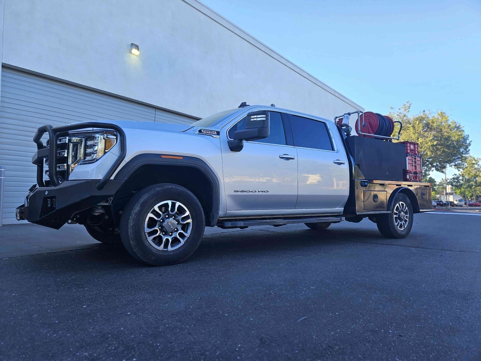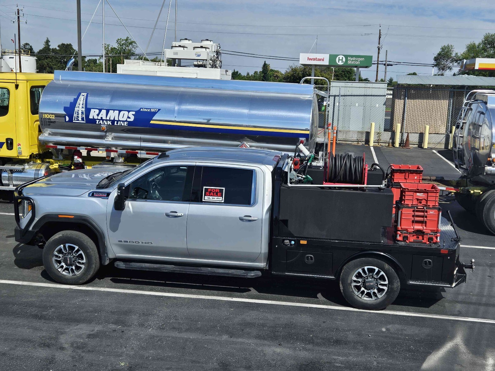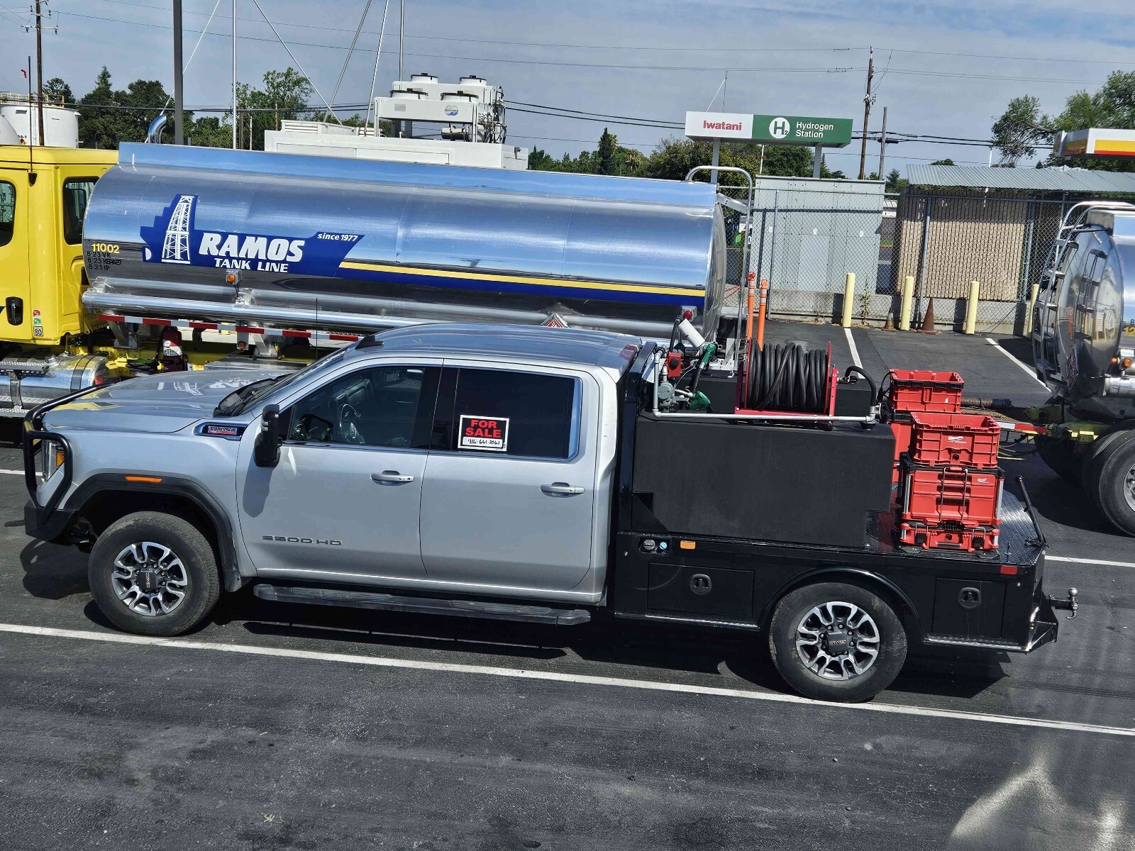 2022 GMC Sierra 3500 HD crew cab SLE pickup four-door 8 ft bed. Stable track, TNT steering wheel, exhaust brakes, traction control, Bluetooth wire less AM/FM stereo, OnStar keyless entry navigation system power door locks power seats cruise control power windows AC remote start, rear camera, f&r curtain airbags, daytime running lights, side airbags, rigid fog light lamps. To 100 gallon fuel tanks each tank has a fuel filter and 13 GPM fuel pump. Driver's tank has a fuel gallon regulator gauge. 150 ft 1 in hose on reel. Travelers winch with remote. Heavy duty front bumper. Will sell vehicle with or without fuel tanks.