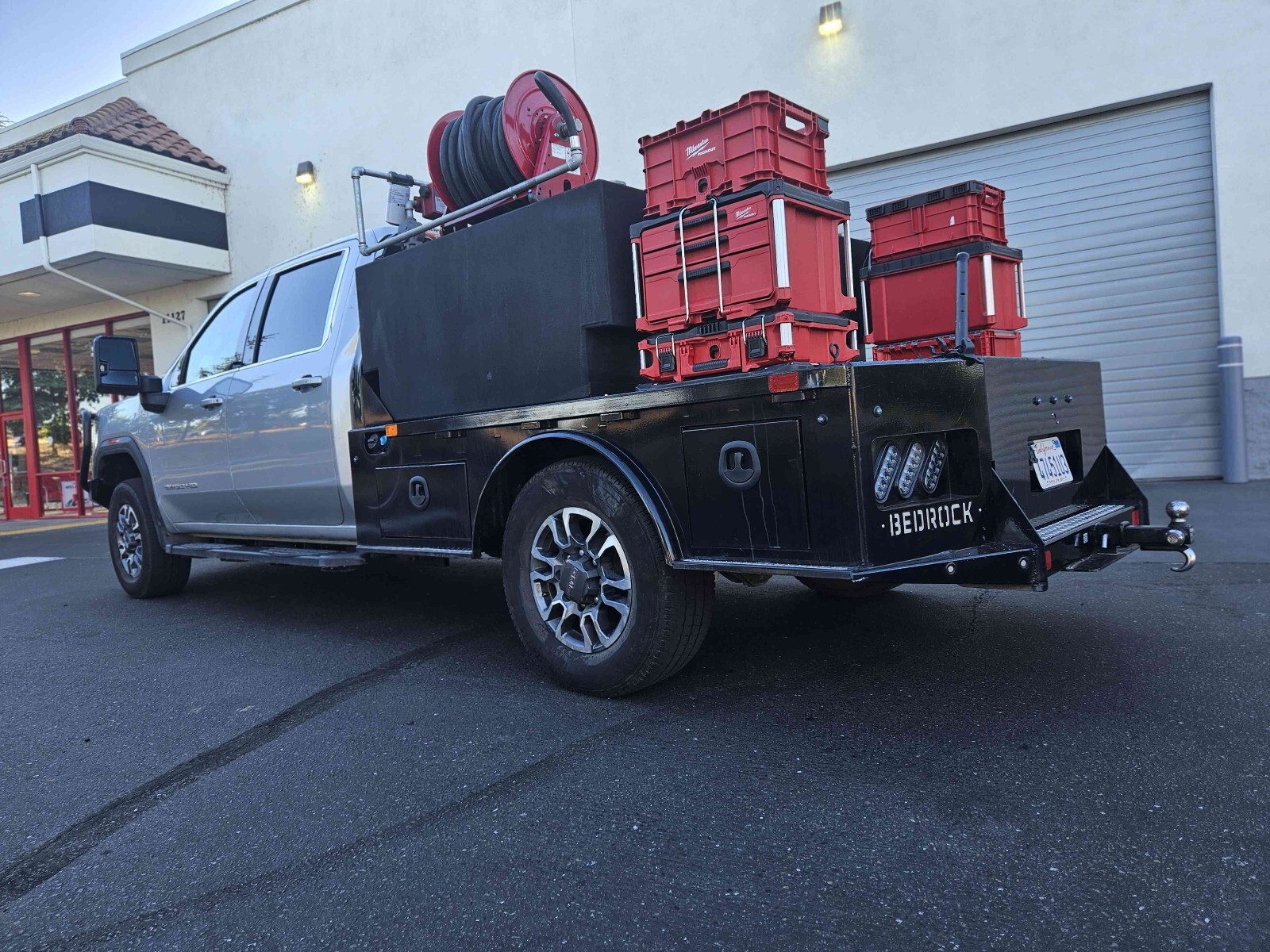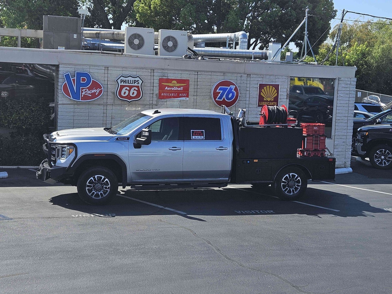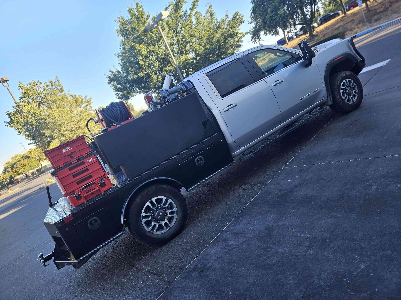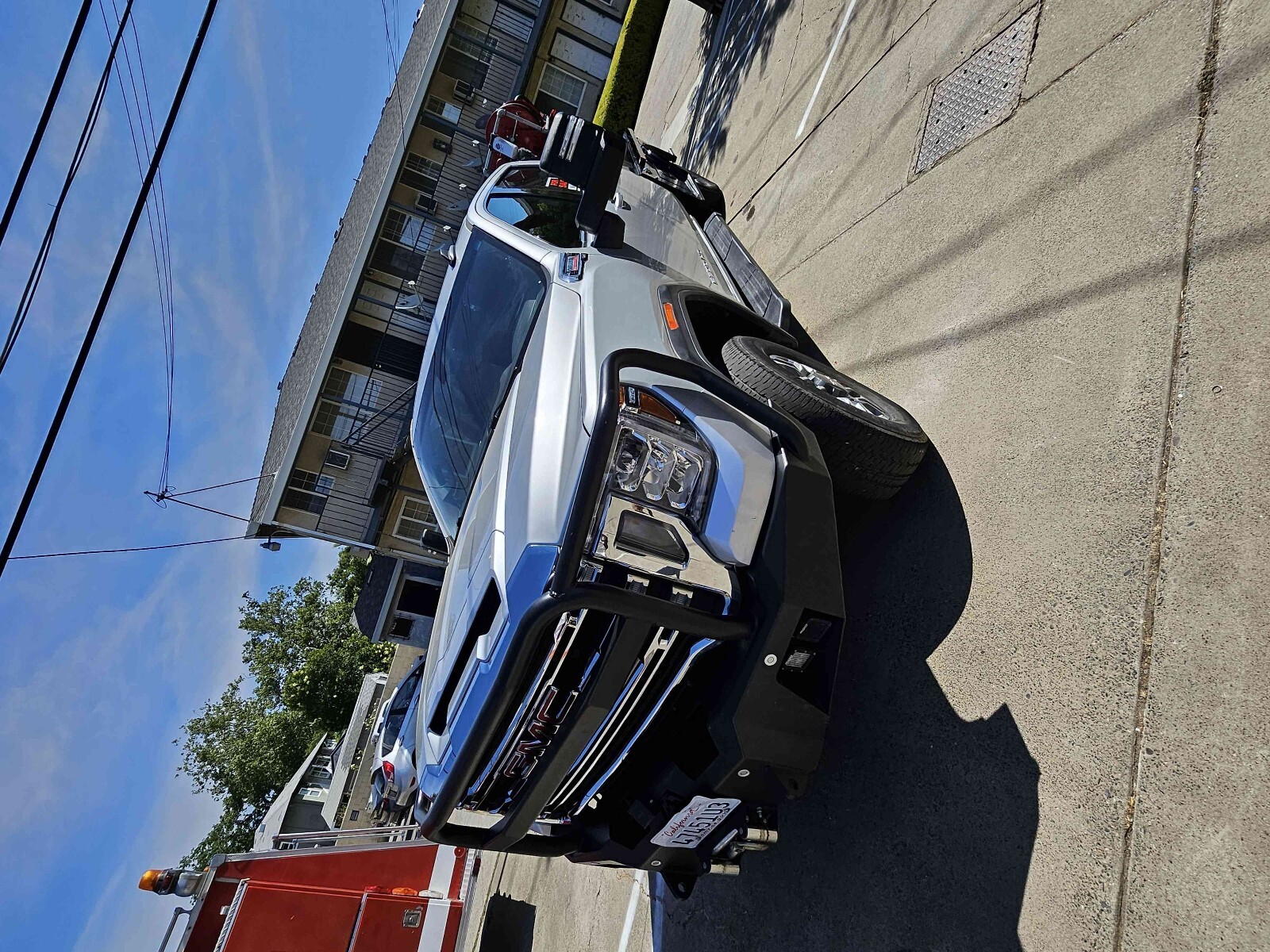 2022 GMC Sierra 3500 HD crew cab SLE pickup four-door 8 ft bed. Stable track, TNT steering wheel, exhaust brakes, traction control, Bluetooth wire less AM/FM stereo, OnStar keyless entry navigation system power door locks power seats cruise control power windows AC remote start, rear camera, f&r curtain airbags, daytime running lights, side airbags, rigid fog light lamps. To 100 gallon fuel tanks each tank has a fuel filter and 13 GPM fuel pump. Driver's tank has a fuel gallon regulator gauge. 150 ft 1 in hose on reel. Travelers winch with remote. Heavy duty front bumper. Will sell vehicle with or without fuel tanks.