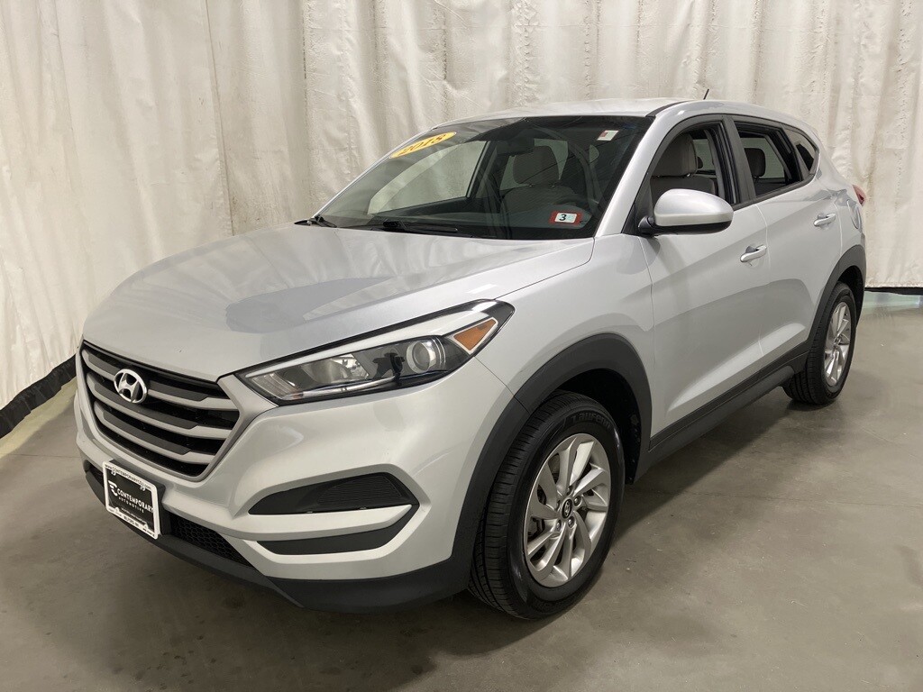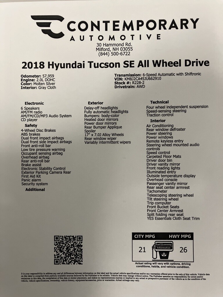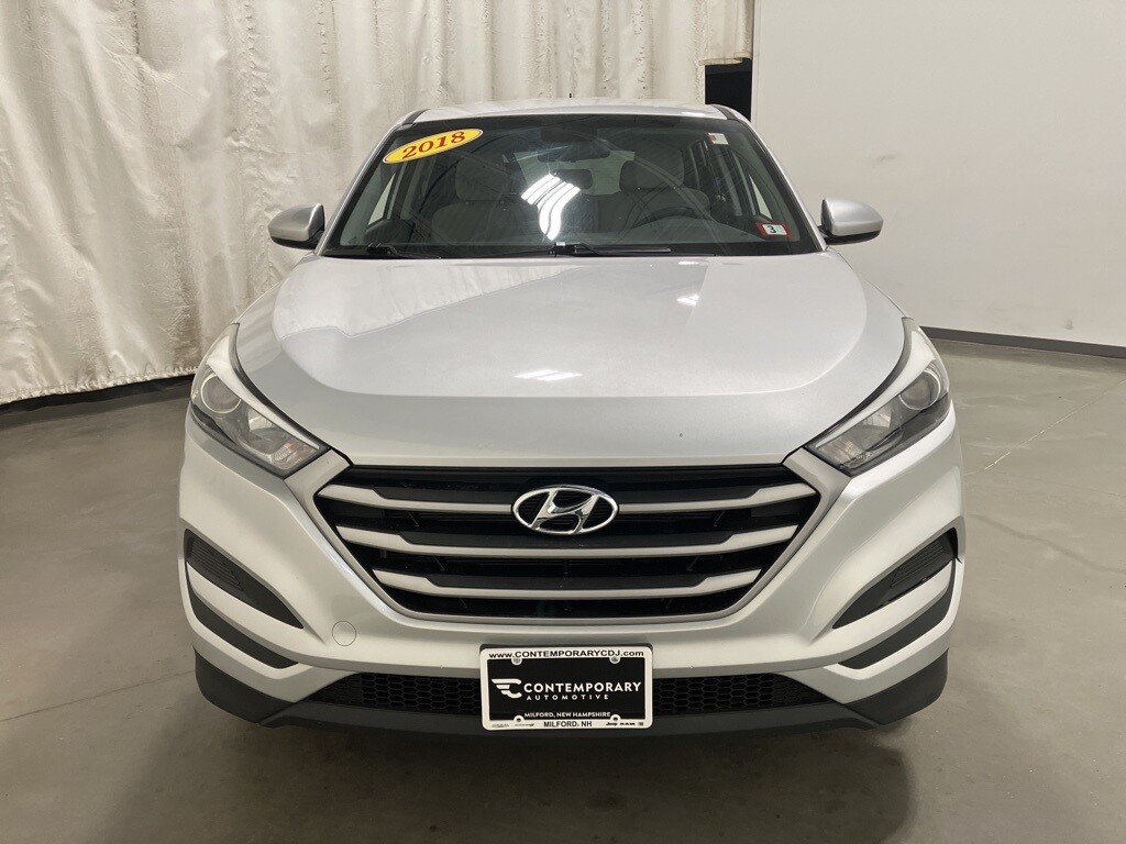 2018 Hyundai Tucson SE All Wheel Drive AWD, 17 x 7.0J Alloy Wheels, 4-Wheel Disc Brakes, 6 Speakers, ABS brakes, Air Conditioning, AM/FM radio, AM/FM/CD/MP3 Audio System, Axle Ratio: 3.648, Brake assist, Bumpers: body-color, Cargo Net, Carpeted Floor Mats, CD player, Delay-off headlights, Driver door bin, Driver vanity mirror, Dual front impact airbags, Dual front side impact airbags, Electronic Stability Control, Exterior Parking Camera Rear, First Aid Kit, Four wheel independent suspension, Front anti-roll bar, Front Bucket Seats, Front Center Armrest, Front reading lights, Fully automatic headlights, Heated door mirrors, Illuminated entry, Low tire pressure warning, Occupant sensing airbag, Outside temperature display, Overhead airbag, Overhead console, Panic alarm, Passenger door bin, Passenger vanity mirror, Power door mirrors, Power steering, Power windows, Rear anti-roll bar, Rear Bumper Applique, Rear seat center armrest, Rear window defroster, Rear window wiper, Remote keyless entry, Security system, Speed control, Speed-sensing steering, Split folding rear seat, Spoiler, Steering wheel mounted audio controls, Tachometer, Telescoping steering wheel, Tilt steering wheel, Traction control, Trip computer, Variably intermittent wipers, and YES Essentials Cloth Seat Trim.