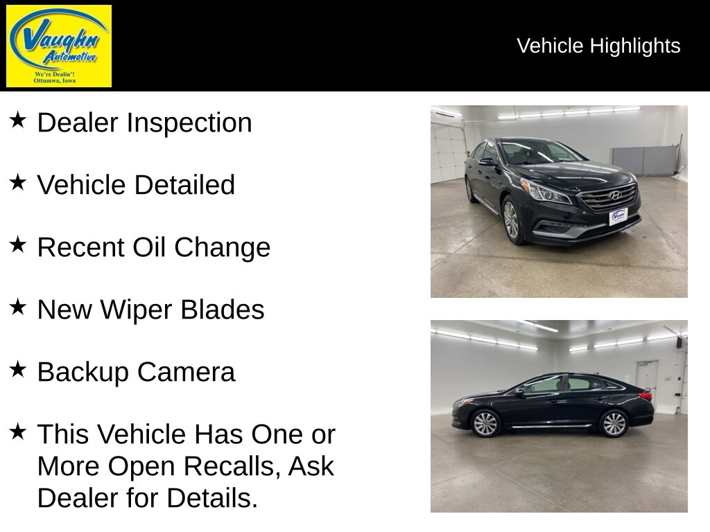 Dealer Inspection, Vehicle Detailed, Recent Oil Change, New Wiper Blades, Backup Camera, This Vehicle Has One or More Open Recalls, Ask Dealer for Details., 6-Speed Automatic with Shiftronic, FWD, Gray Cloth, Electronic Stability Control, Emergency communication system: Blue Link, Exterior Parking Camera Rear, Fully automatic headlights, Heated Front Bucket Seats, Power driver seat, Radio: AM/FM/SiriusXM/CD/MP3 Audio System, Remote keyless entry, Security system, Speed-Sensitive Wipers. 2.4L I4 DGI DOHC 16V ULEV II 185hp Phantom Black 2015 Hyundai Sonata Sport Odometer is 4715 miles below market average! 24/35 City/Highway MPG