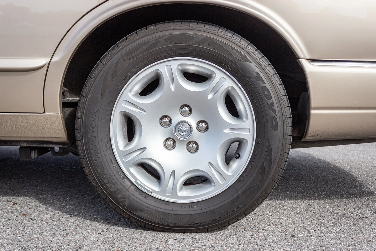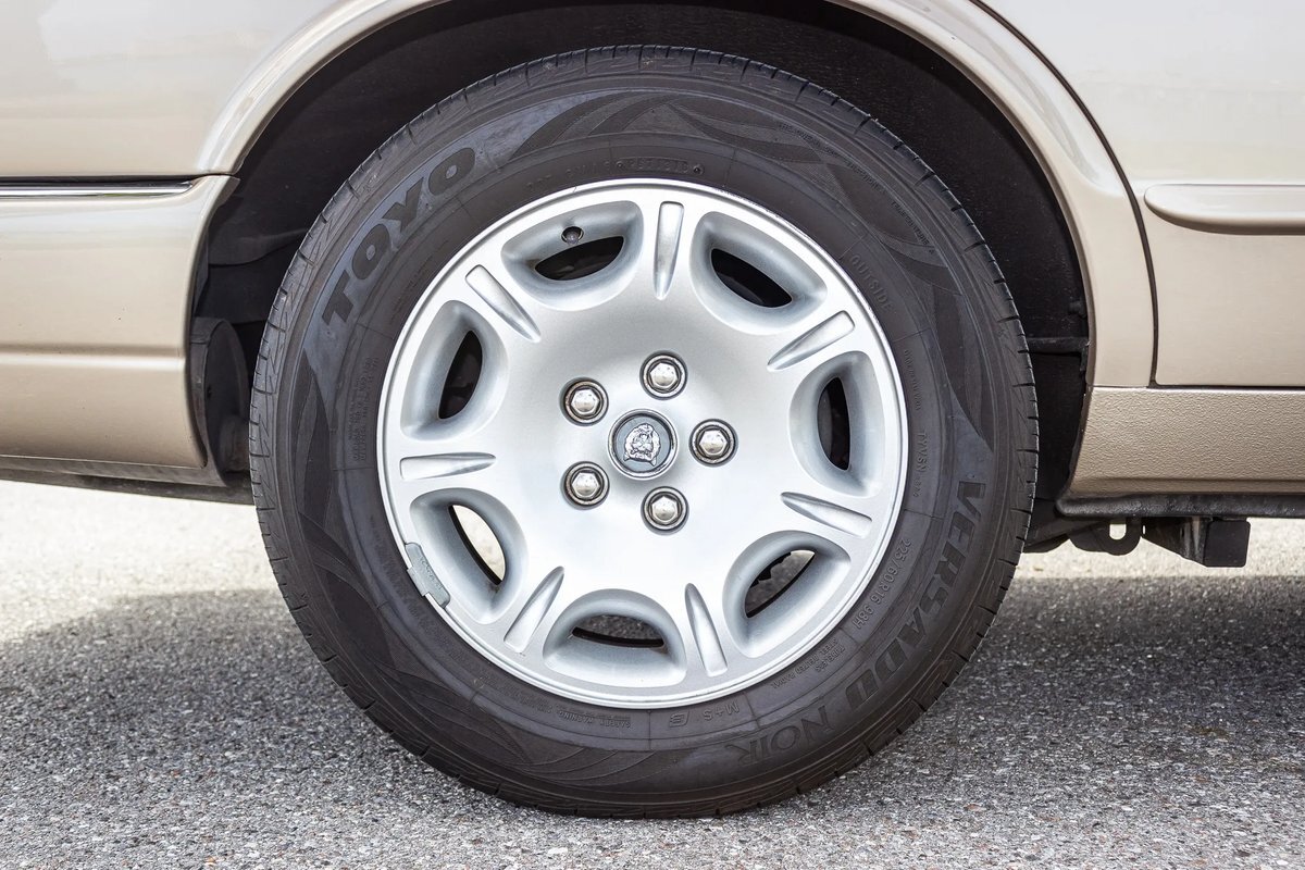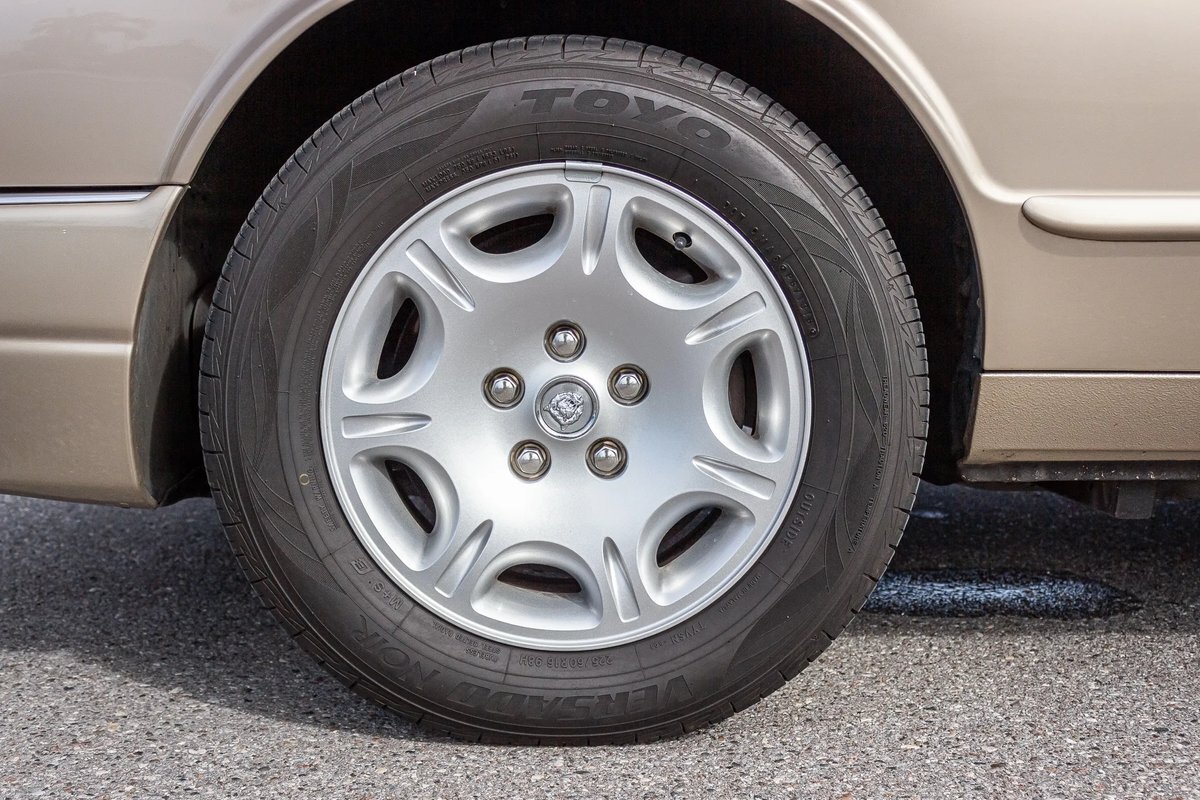 Silver-finished 16" alloy wheels are wrapped in 225/60 Toyo Versado Noir tires that show date codes from 2016. The car is equipped with four-wheel anti-lock disc brakes, a double-wishbone front suspension setup, and variable-boost power steering.