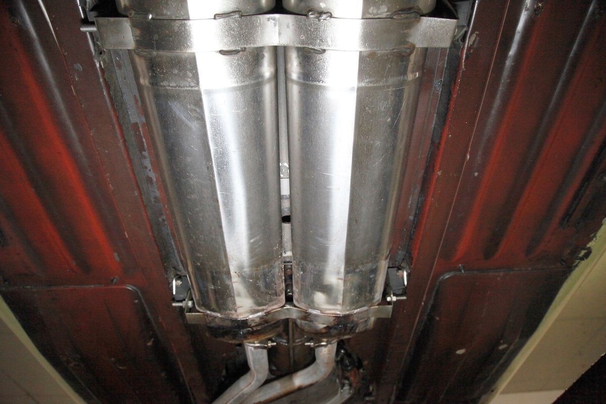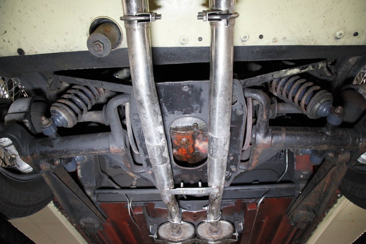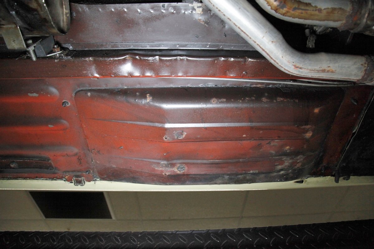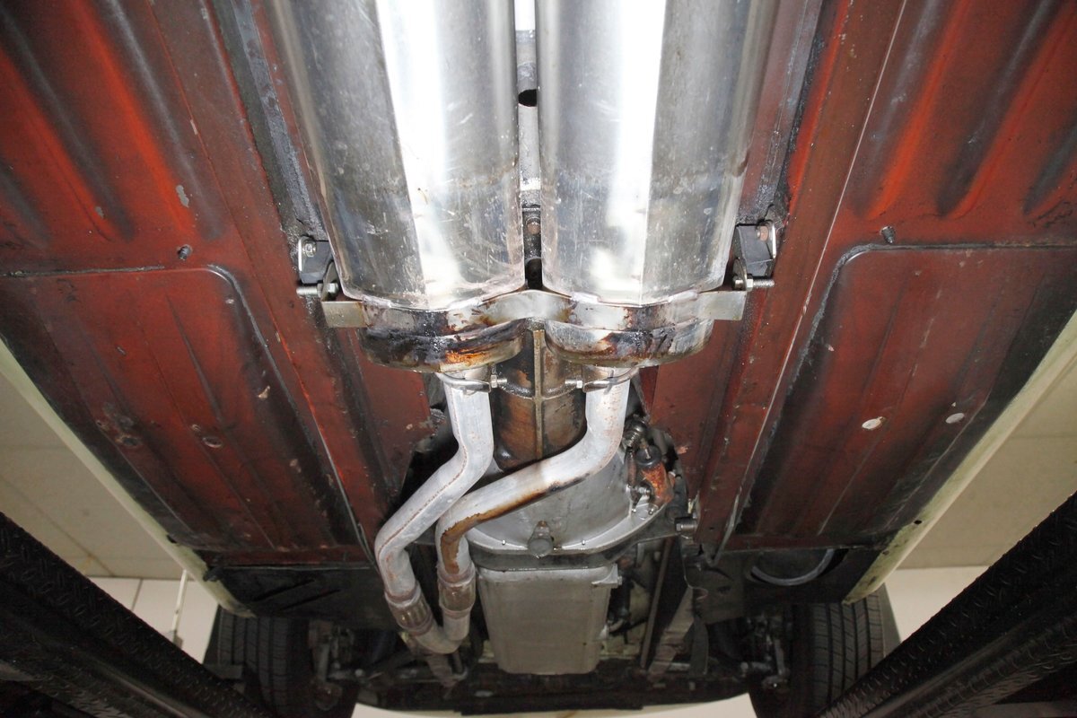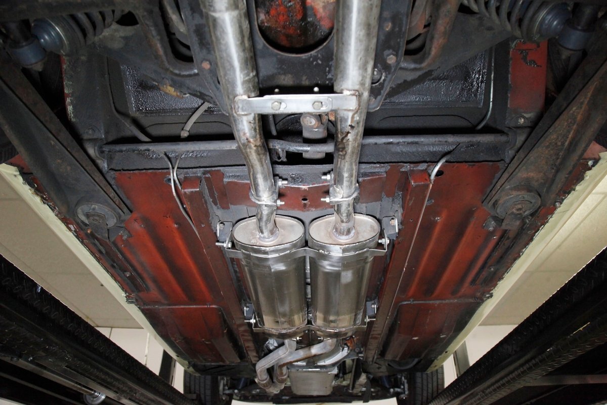 All clean and shiny underneath, reworked, and very clean independent torsion bar front suspension, and independent coil overs for the back. Disc brakes reside on all 4 corners and factory style dual exhaust is on the for exhale. No structural problems, and a very sturdy and clean frame.