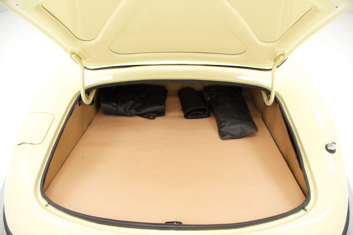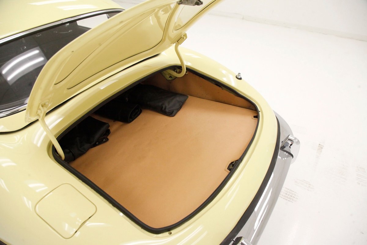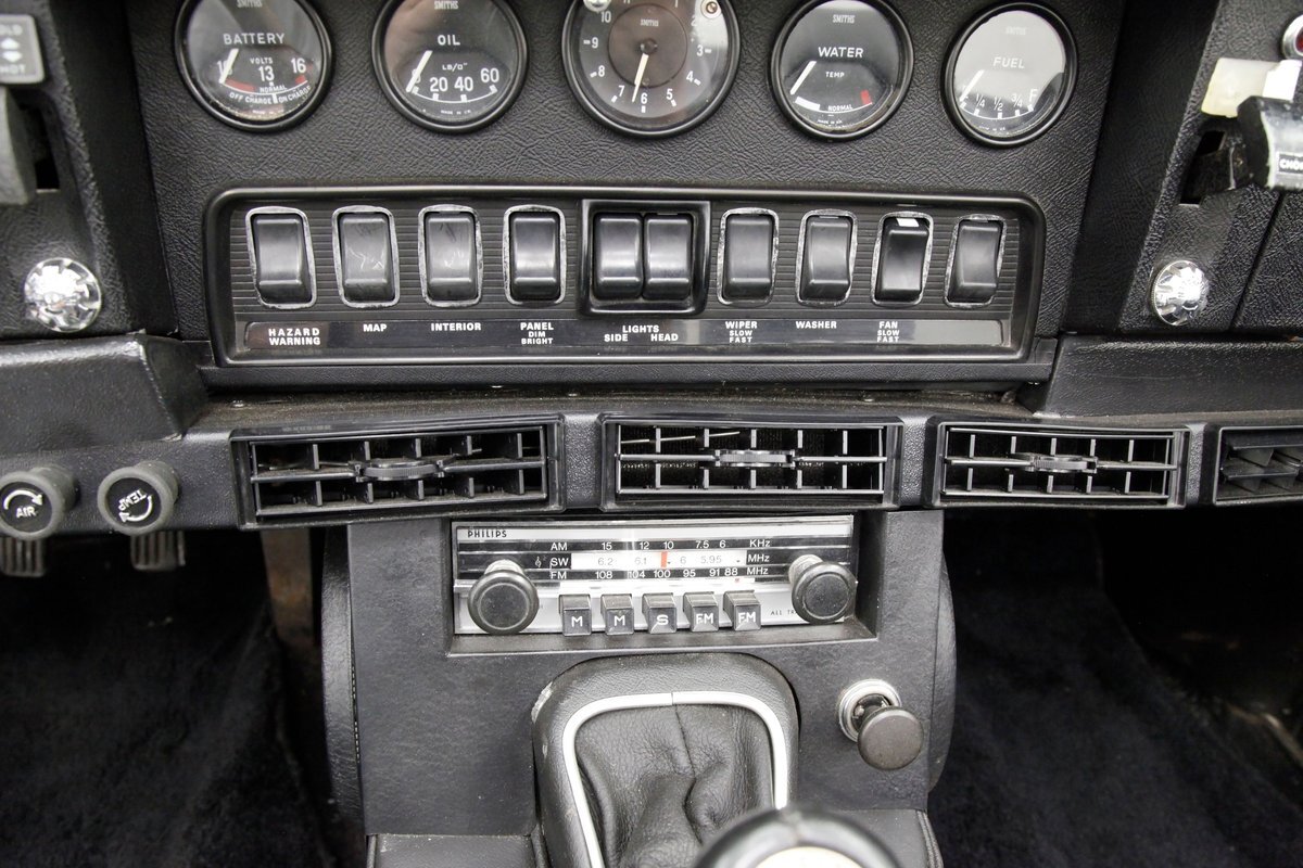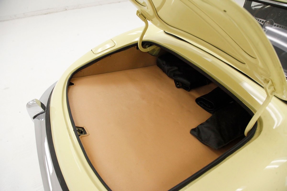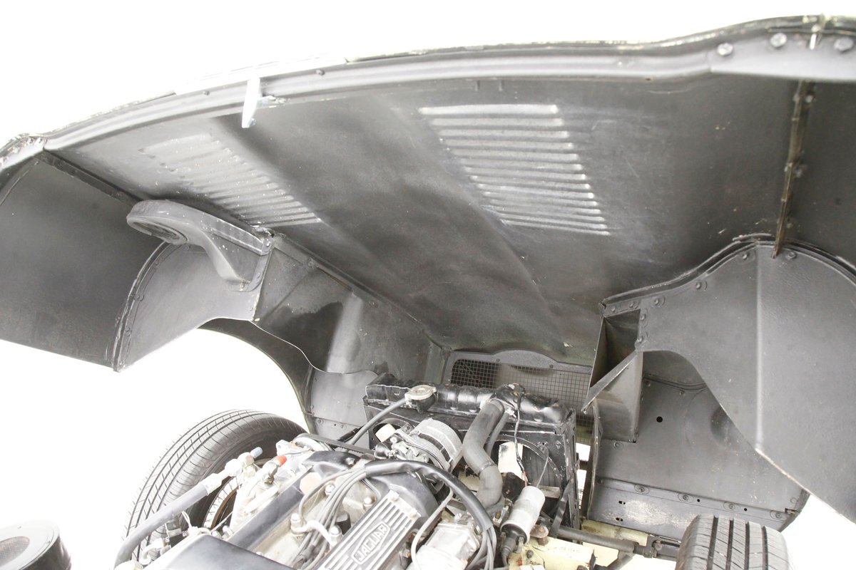 Yards of mostly original black leather cover the bomber style with headrests, bucket seats, door panels, and dash top, and it's all very nice. The dash is peppered with numerous Smiths gauges, and a full lineup of toggle switches. An original wood steering wheel fronts the dash, which holds the factory AM/FM radio as well as the controls for the rarely seen factory air conditioning. Racing between the seats, a recovered with replaced Hardura matting console holds the ash receptacle and chrome and black shift lever. Black carpet in very nice condition is covering the floor and small rear stowage area. The trunk is nearly perfect and covered in tan vinyl and holding the tool rolls with no damage here.