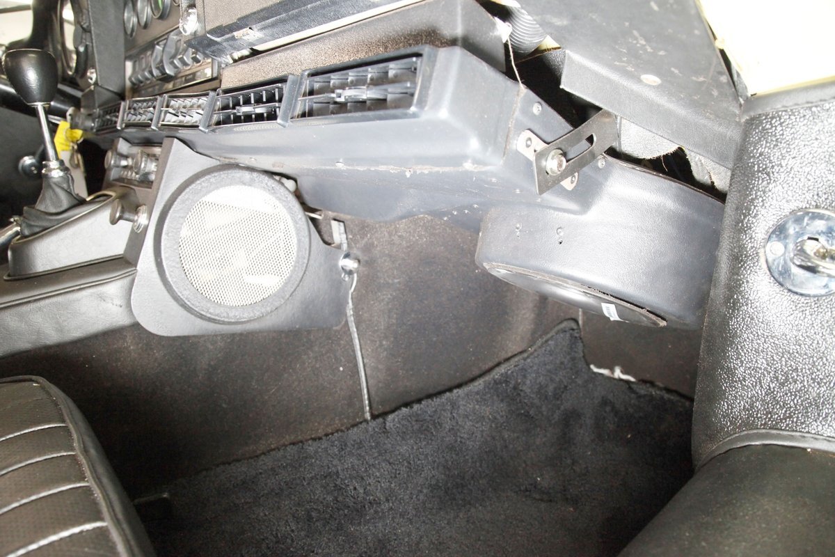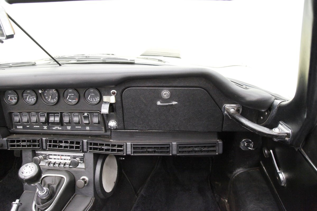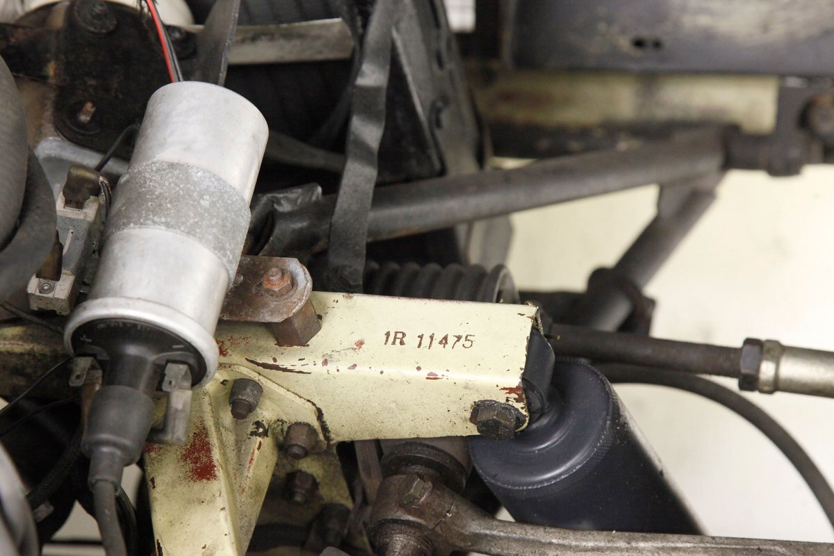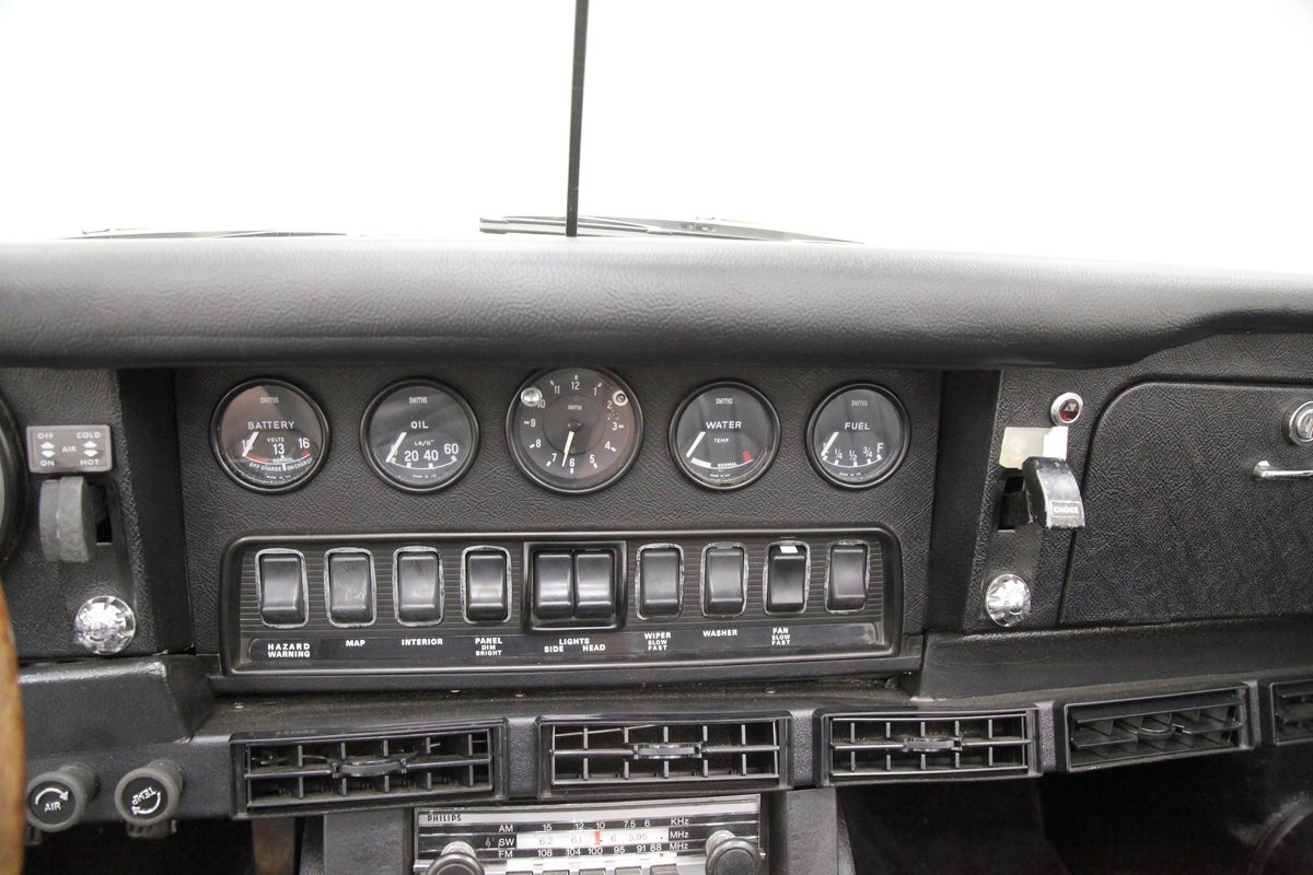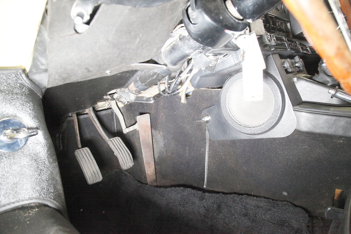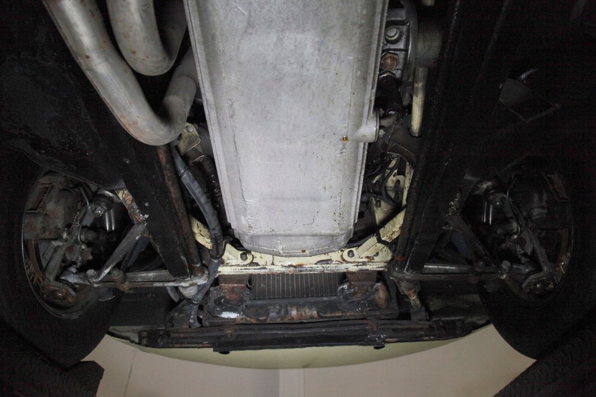 Yards of mostly original black leather cover the bomber style with headrests, bucket seats, door panels, and dash top, and it's all very nice. The dash is peppered with numerous Smiths gauges, and a full lineup of toggle switches. An original wood steering wheel fronts the dash, which holds the factory AM/FM radio as well as the controls for the rarely seen factory air conditioning. Racing between the seats, a recovered with replaced Hardura matting console holds the ash receptacle and chrome and black shift lever. Black carpet in very nice condition is covering the floor and small rear stowage area. The trunk is nearly perfect and covered in tan vinyl and holding the tool rolls with no damage here.