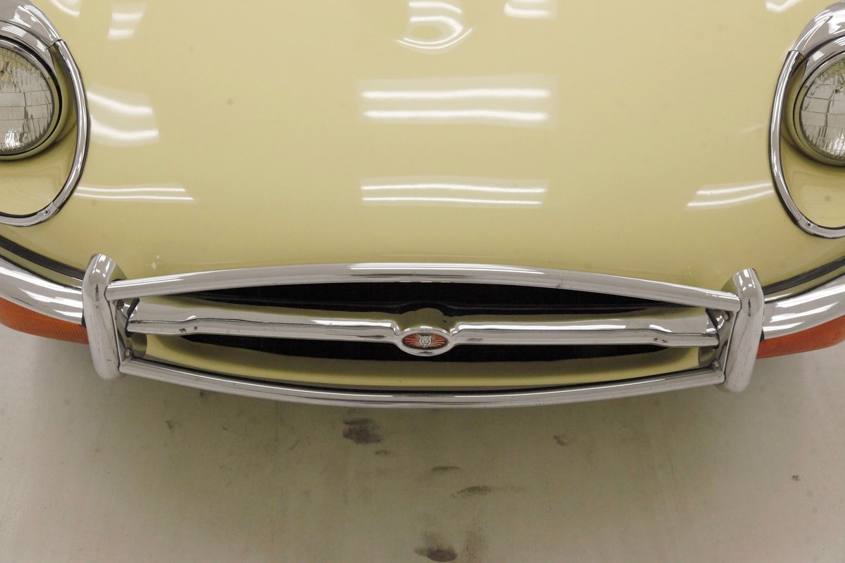 Jaguar motors nailed it when they penned this design which utilizes a long long bulbous bonnet, curvaceous fenders which wrap chrome wire knockoff wheels, and a curved to a pinched boot, framed by a chrome wrap around bumper. These bumpers are pre large rubber government mandated crash pads so they look great. The paint on this car is very good with only a few minor inclusions and dings. This is due to the 2007 restoration that took the rust free body down to bare metal, all panels repaired and some prior accident damage fixed on the passengers rear quarter panel. This has left us with a wonderfully consistent miles deep finish. The chrome and badging are all original as well as trim is all gleaming and nary any faults. Convertible top is very nicely preserved, and presents in a slightly faded black canvas with a lightly yellowed plastic window. A black tonneau cover wraps up the top nicely when it is in the down position and a rarely seen factory Pale Primrose Yellow hardtop can be installed for inclement weather driving. Chromed 15-inch wire wheels with knockoff hubs are seen on all 4 corners and these are wrapped in 205/70R15's in the front and 195/75R15 in the rear. No more Avons!!