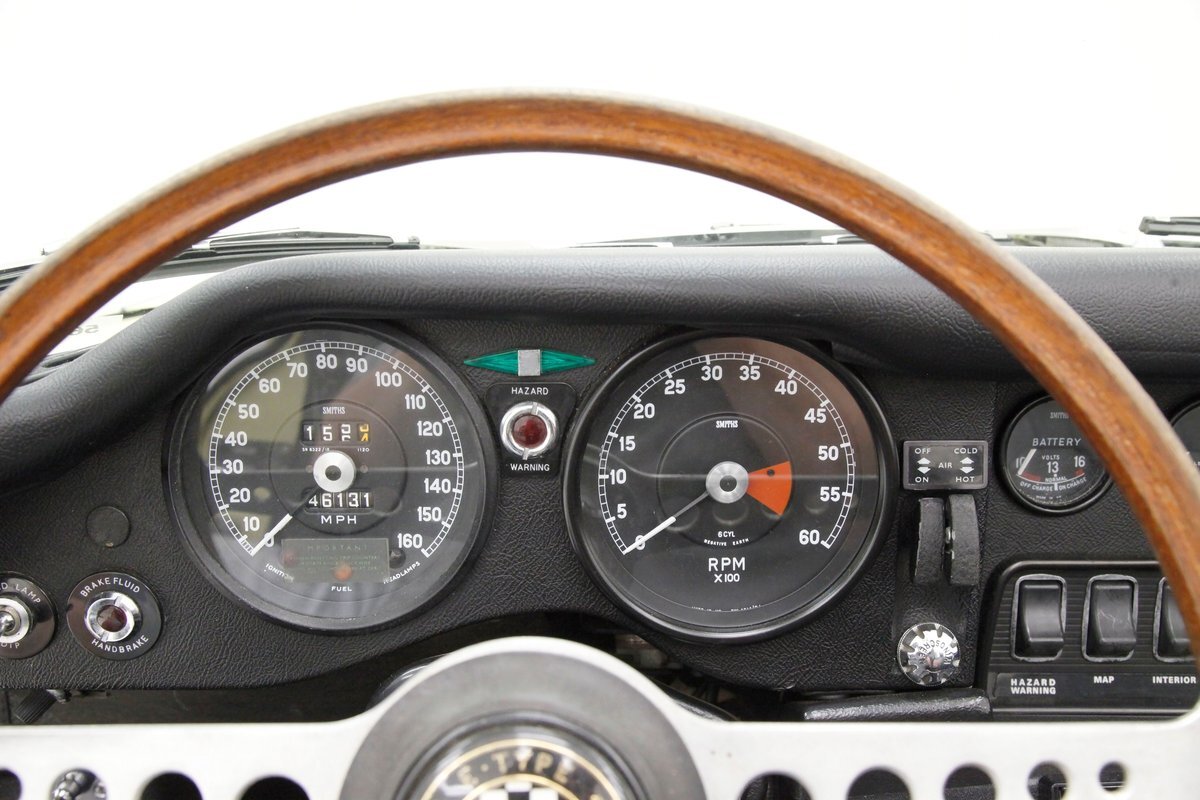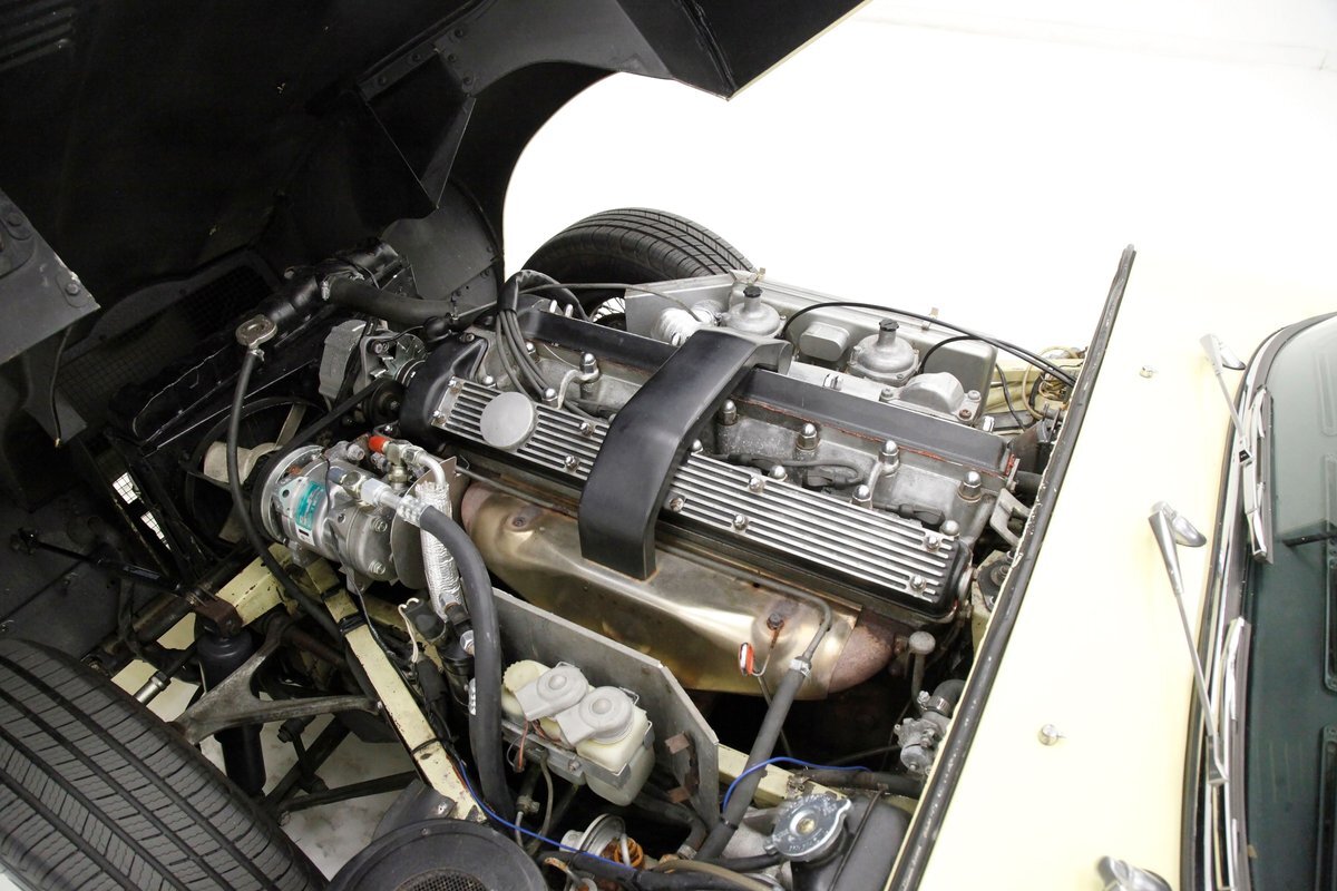 A flip forward of the bonnet reveals the factory original 4.2 liter DOHC Inline 6 cylinder, and the original dual Su carbs. The original 4-speed manual transmission is attached. The rear axle is a 3.54 version. A nice and clean well maintained mill and with a lightly patinaed engine bay looking all good.