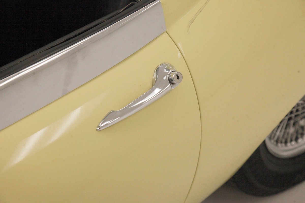 Jaguar motors nailed it when they penned this design which utilizes a long long bulbous bonnet, curvaceous fenders which wrap chrome wire knockoff wheels, and a curved to a pinched boot, framed by a chrome wrap around bumper. These bumpers are pre large rubber government mandated crash pads so they look great. The paint on this car is very good with only a few minor inclusions and dings. This is due to the 2007 restoration that took the rust free body down to bare metal, all panels repaired and some prior accident damage fixed on the passengers rear quarter panel. This has left us with a wonderfully consistent miles deep finish. The chrome and badging are all original as well as trim is all gleaming and nary any faults. Convertible top is very nicely preserved, and presents in a slightly faded black canvas with a lightly yellowed plastic window. A black tonneau cover wraps up the top nicely when it is in the down position and a rarely seen factory Pale Primrose Yellow hardtop can be installed for inclement weather driving. Chromed 15-inch wire wheels with knockoff hubs are seen on all 4 corners and these are wrapped in 205/70R15's in the front and 195/75R15 in the rear. No more Avons!!