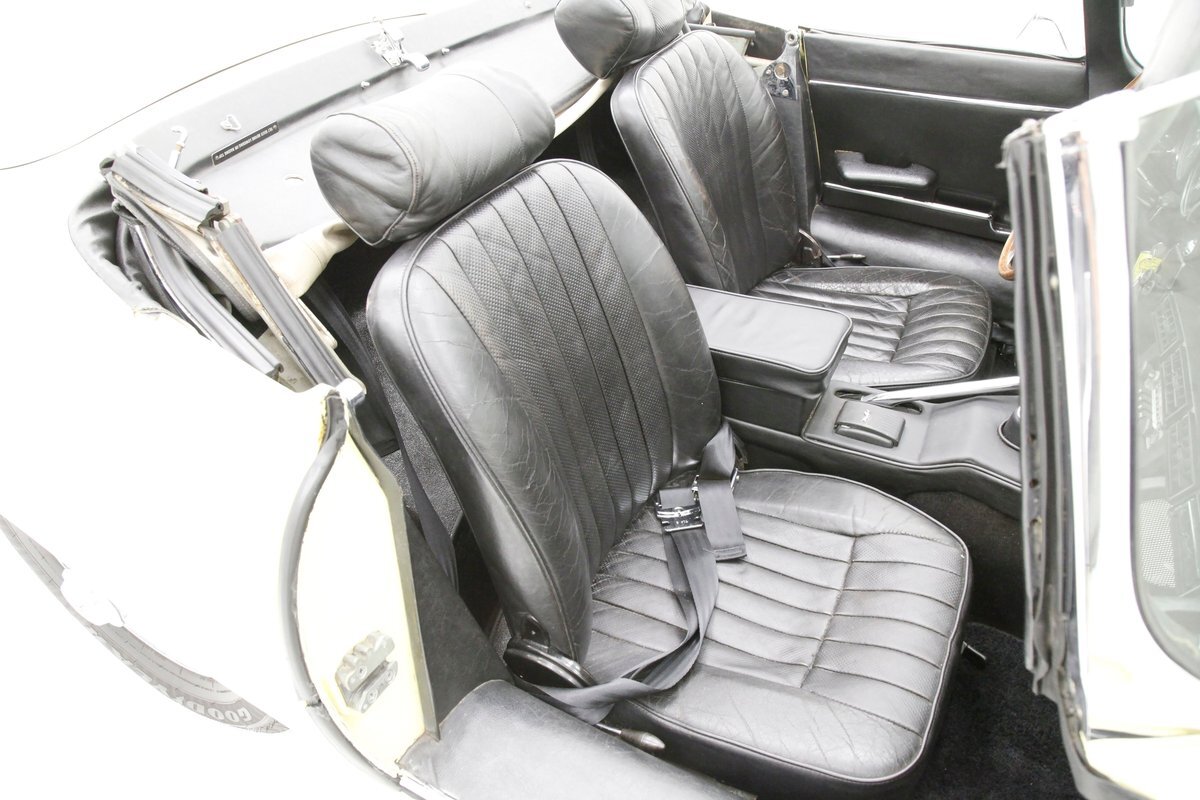 Jaguar motors nailed it when they penned this design which utilizes a long long bulbous bonnet, curvaceous fenders which wrap chrome wire knockoff wheels, and a curved to a pinched boot, framed by a chrome wrap around bumper. These bumpers are pre large rubber government mandated crash pads so they look great. The paint on this car is very good with only a few minor inclusions and dings. This is due to the 2007 restoration that took the rust free body down to bare metal, all panels repaired and some prior accident damage fixed on the passengers rear quarter panel. This has left us with a wonderfully consistent miles deep finish. The chrome and badging are all original as well as trim is all gleaming and nary any faults. Convertible top is very nicely preserved, and presents in a slightly faded black canvas with a lightly yellowed plastic window. A black tonneau cover wraps up the top nicely when it is in the down position and a rarely seen factory Pale Primrose Yellow hardtop can be installed for inclement weather driving. Chromed 15-inch wire wheels with knockoff hubs are seen on all 4 corners and these are wrapped in 205/70R15's in the front and 195/75R15 in the rear. No more Avons!!
