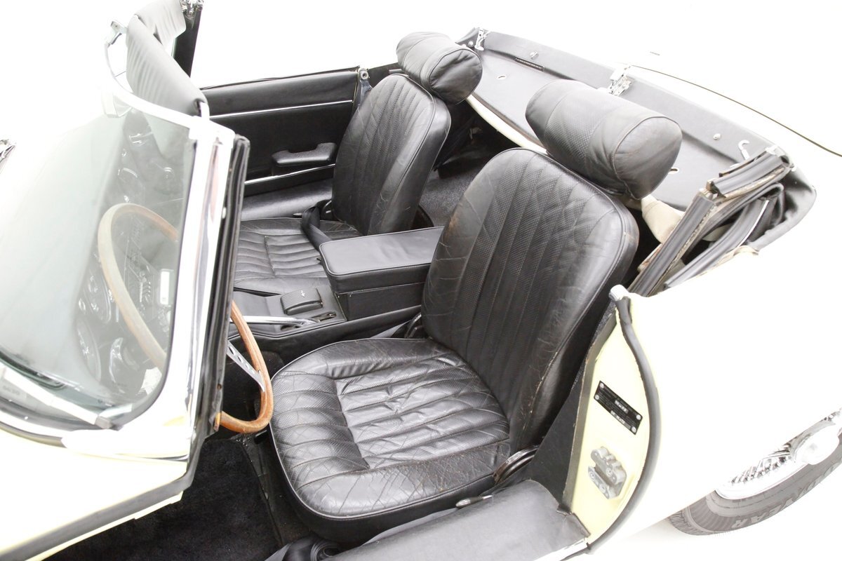 Jaguar motors nailed it when they penned this design which utilizes a long long bulbous bonnet, curvaceous fenders which wrap chrome wire knockoff wheels, and a curved to a pinched boot, framed by a chrome wrap around bumper. These bumpers are pre large rubber government mandated crash pads so they look great. The paint on this car is very good with only a few minor inclusions and dings. This is due to the 2007 restoration that took the rust free body down to bare metal, all panels repaired and some prior accident damage fixed on the passengers rear quarter panel. This has left us with a wonderfully consistent miles deep finish. The chrome and badging are all original as well as trim is all gleaming and nary any faults. Convertible top is very nicely preserved, and presents in a slightly faded black canvas with a lightly yellowed plastic window. A black tonneau cover wraps up the top nicely when it is in the down position and a rarely seen factory Pale Primrose Yellow hardtop can be installed for inclement weather driving. Chromed 15-inch wire wheels with knockoff hubs are seen on all 4 corners and these are wrapped in 205/70R15's in the front and 195/75R15 in the rear. No more Avons!!