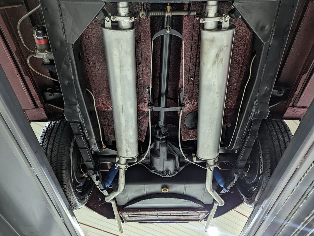 UNDERSIDE: This car was rotisserie restored. The entire underbody is rust free and undercoated then painted the matching Opalescent color. The MC models came with larger torsion bars, a better drum brake system than lower trim models, dual exhaust and rack and pinion steering. The suspension and steering were completely rebuilt. The brakes were rebuilt. Fuel system was replaced, it has an electric fuel pump. Looking up at the motor and trans they are clean. This was the first year Jaguar offered an auto trans; the trans was bought from the U.S by Borg Warner and put installed in these cars. This has the original #'s matching trans as well! The rear end was serviced and has a polished cover.