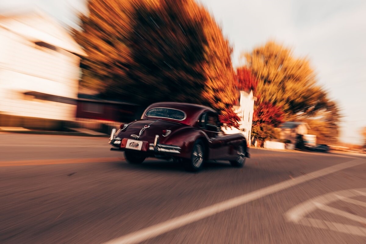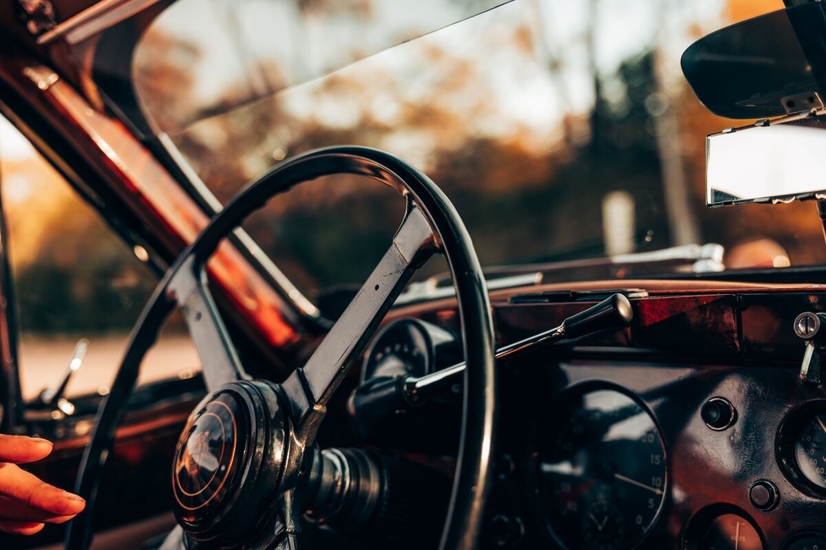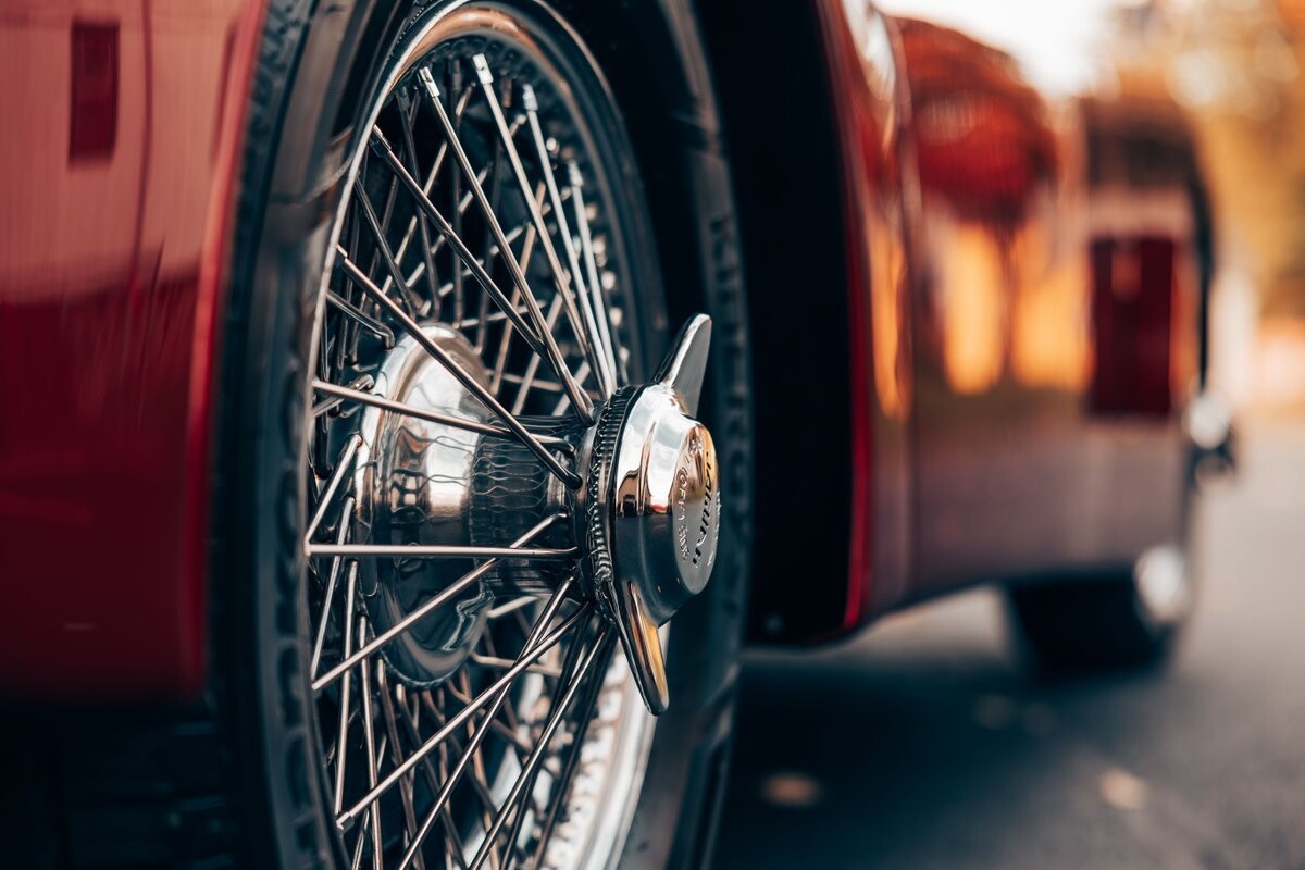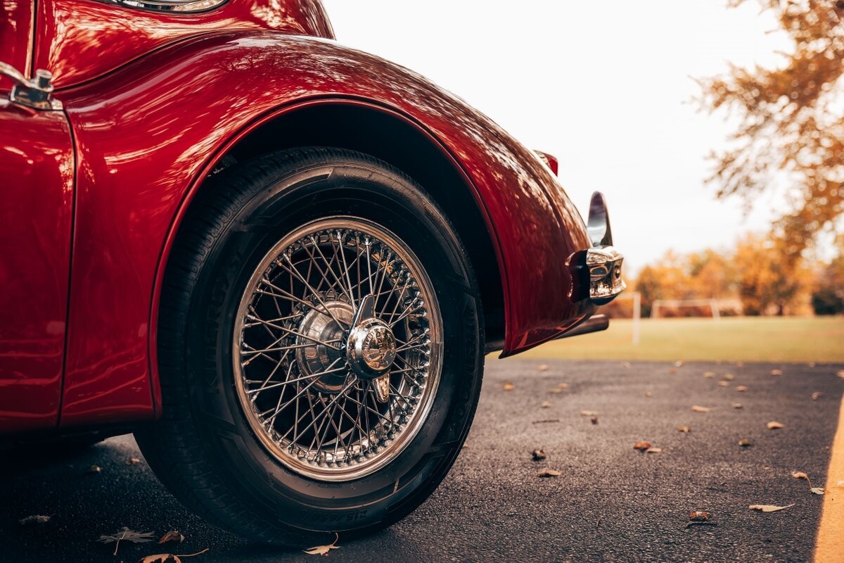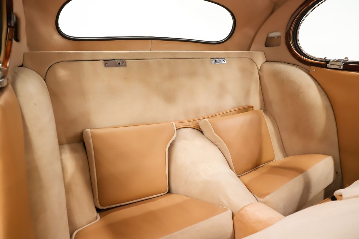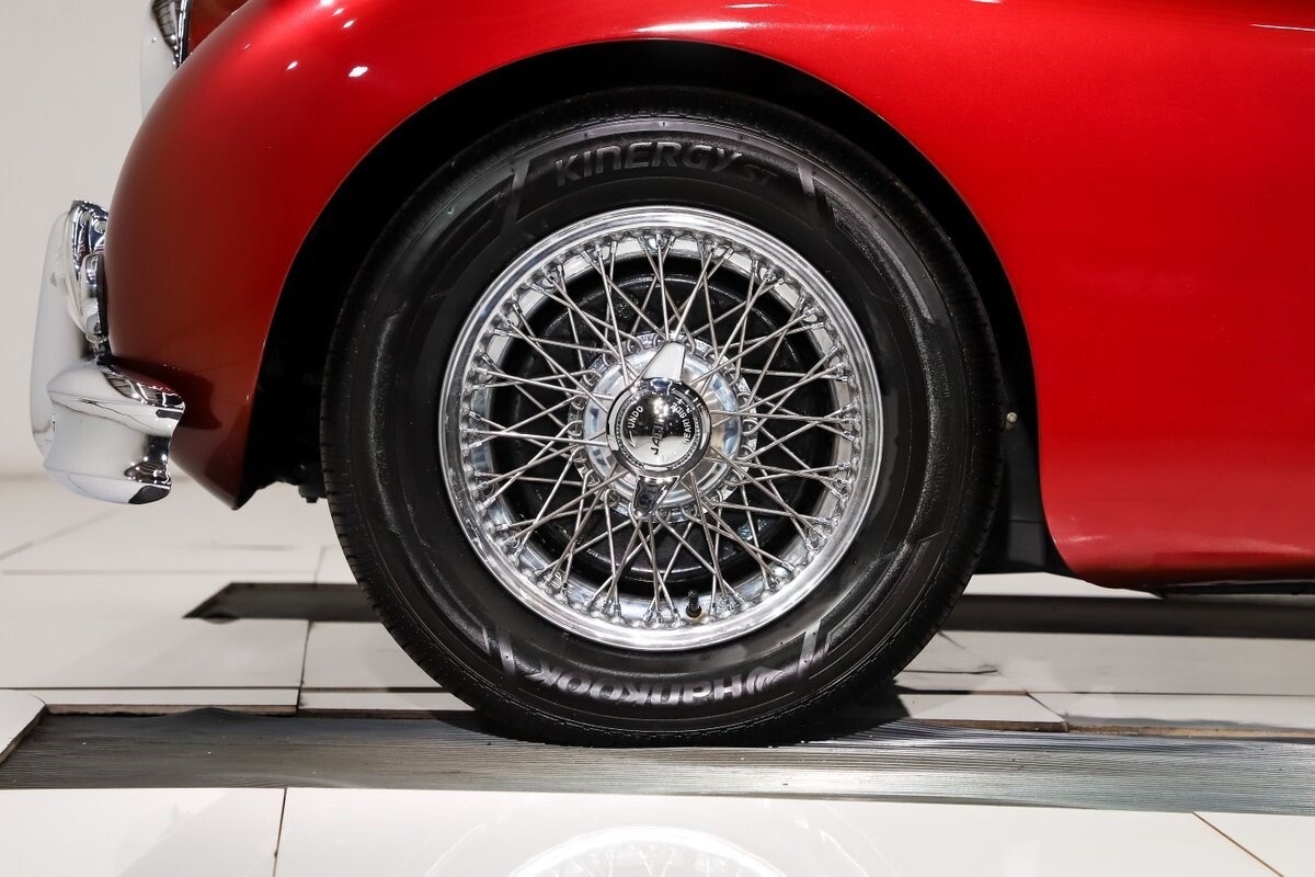 EXTERIOR: The fit and finish is amazing. The Opalescent paint is gorgeous, and compliments the body lines, curves, and angles of the car. It has a wide spaced grill, full width bumpers, Lucas lights, and larger turn signals on fenders. Correct 16 inch chrome wire knock off wheels are wrapped in radial tires. The extruded fog lights and dual tipped exhaust are part of the MC package. Our favorite part might be the fresh air vents that pop open or the race style mirrors that sit on top of the long front fenders.