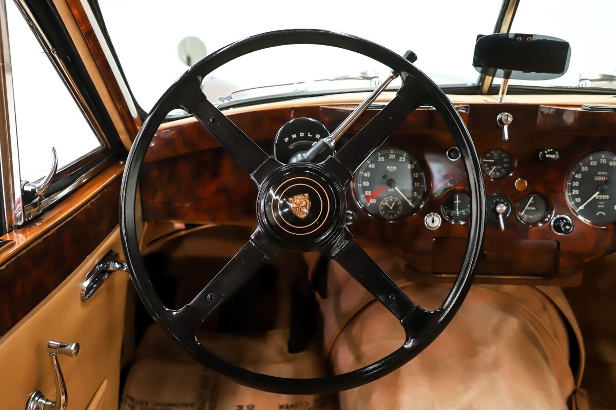 INTERIOR: The high class continues inside, and it's been completely redone. The biscuit is a perfect complement to the paint. The first thing I noticed was the soft leather upholstery. Door panels look new, the walnut wood trim is outstanding. The Smiths gauges all match and include a 140mph Speedo, reverse sweep tachometer, and auxiliary gauges. The 4 spoke wheel w/ Jaguar horn has been refinished and sits on a telescoping column. The walnut wood dash is very classy and offers a velvet lined storage box and glove compartment. All the carpeting is matching with nice bound edges. The review mirror sits atop the dash and has a tinted flip up visor that matches the sun visors.