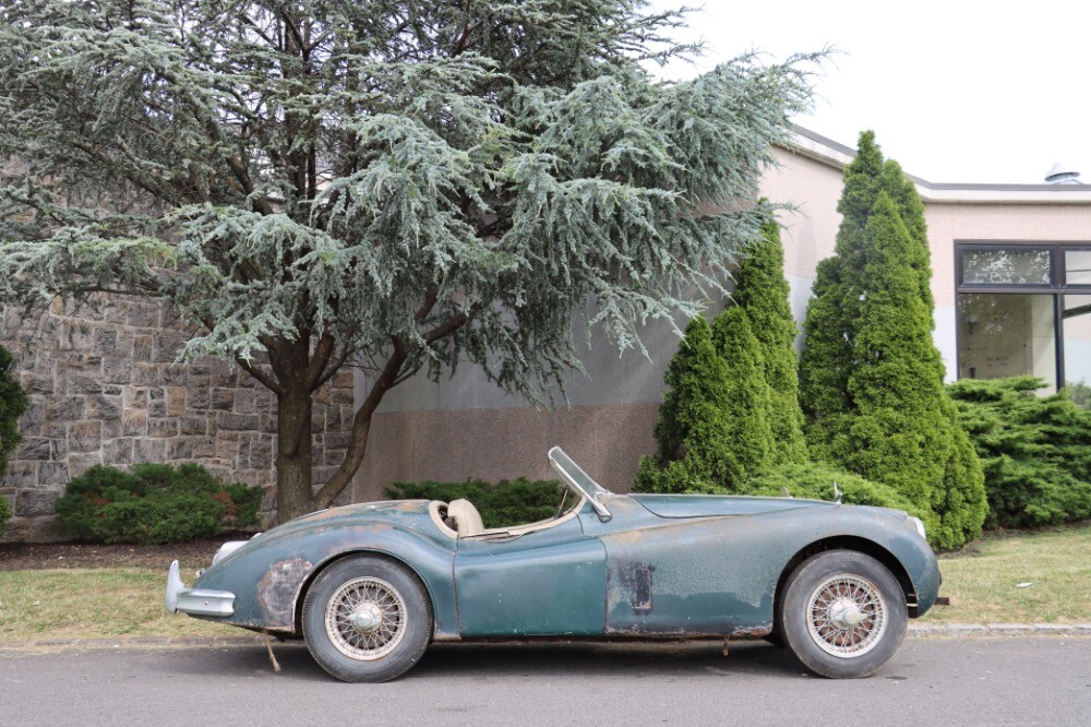 This matching numbers 1957 Jaguar XK140 MC Roadster is the ideal candidate for straightforward restoration. Green with cream interior. Just out of long-term ownership and storage, this barn-find is a non-running project. Its special C-Type performance head makes it well worth the effort to restore. These cars are nearly impossible to find and this particular example comes complete and extremely original. A wonderful opportunity to own and restore an MC performance model XK140 with C-Type cylinder head.