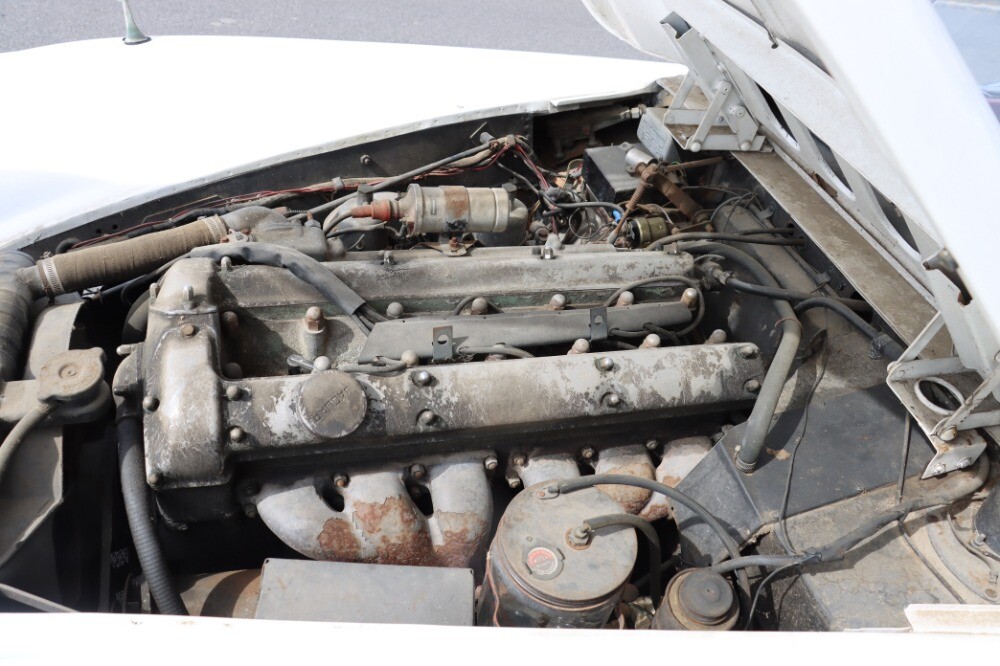This 1959 Jaguar XK150 Roadster is a matching numbers example with a rare factory automatic transmission. White with red interior. A solid, original, and straight car overall. It's not currently running as it has been off the road and in storage for the last several years. It comes complete and is very honest throughout. Just out of long-term ownership, this XK150 Roadster retains its original engine and is an excellent original car to restore.