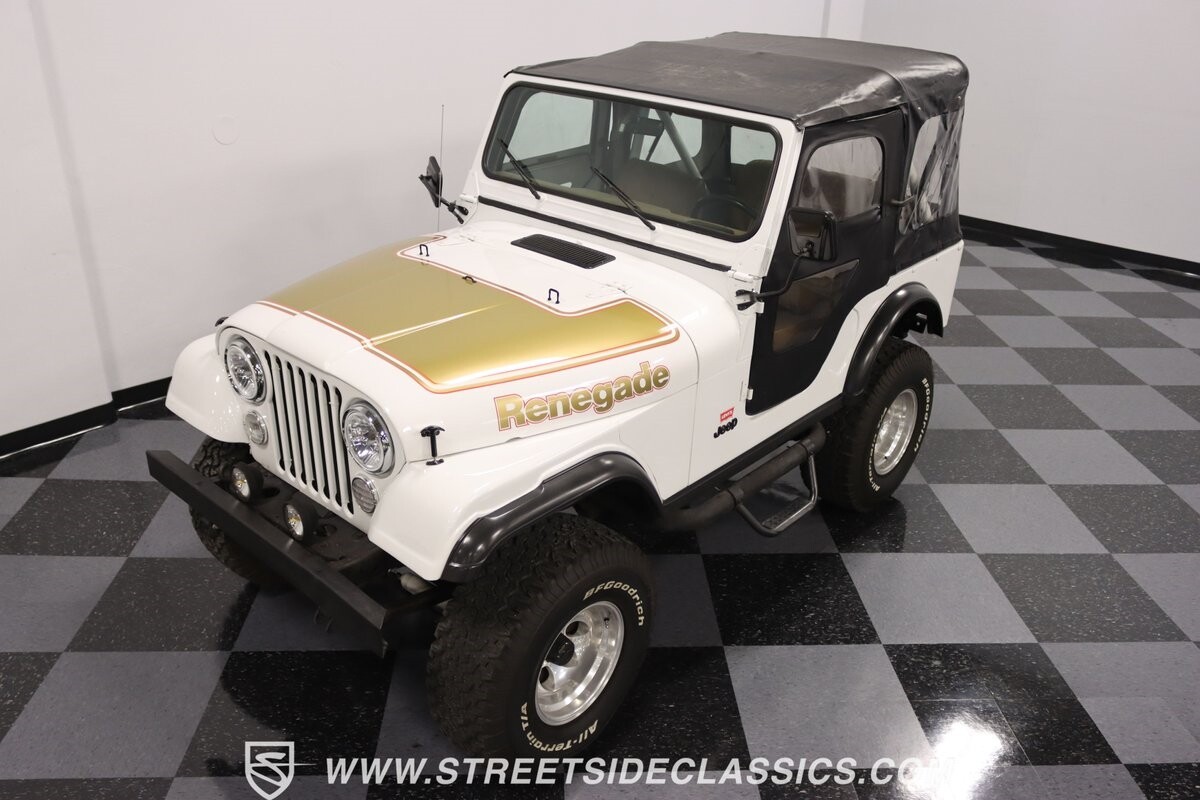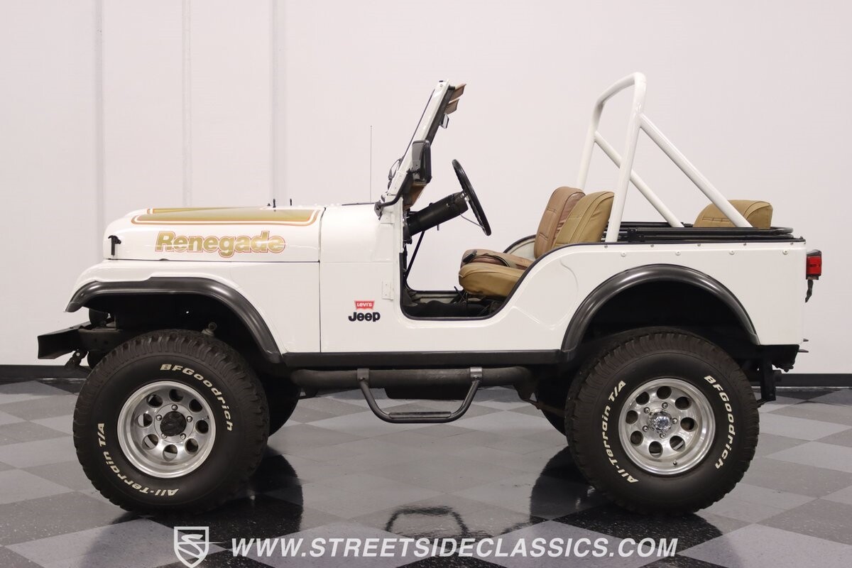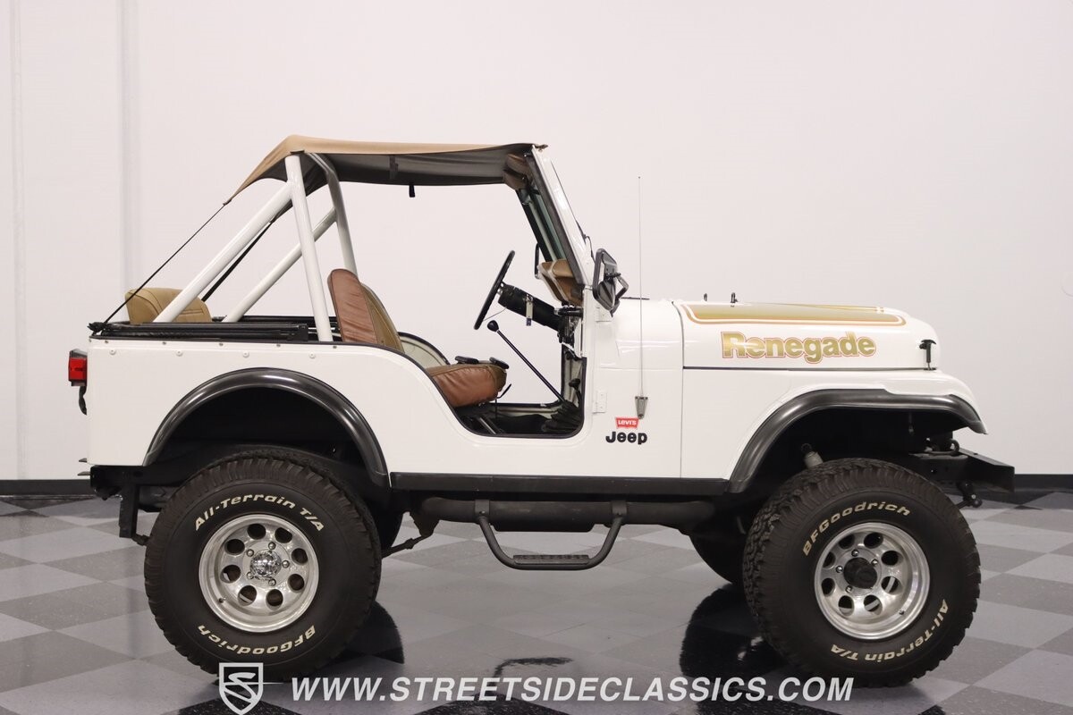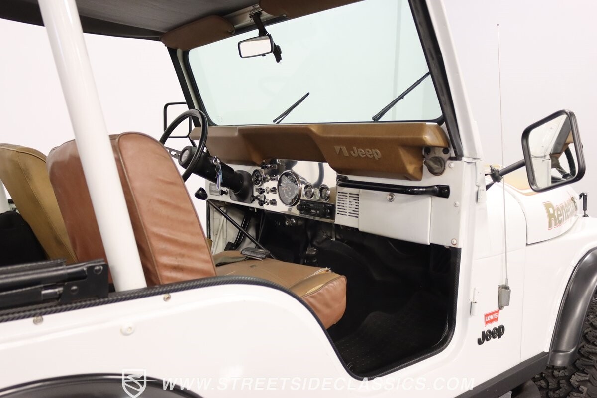 Just like the perfect pair of Levi jeans, the 1978 Jeep CJ5 Renegade Levi Edition embodies the spirit of American freedom and adventure. This rugged white warrior, wearing its factory original color, pays homage to the great outdoors with its gold decals, including the iconic "RENEGADE" on the hood. This CJ5 is equipped with 15" Pacer wheels wrapped in bold 33X12.50R15 BF Goodrich All-Terrain tires, ready to conquer any terrain. It comes with both a tan bikini top and a black soft top with doors, while the front fog lights are ready to pierce through the misty trails. The black steel bumpers and step ladder add to its rugged charm, making it the ultimate companion for your off-road escapades.