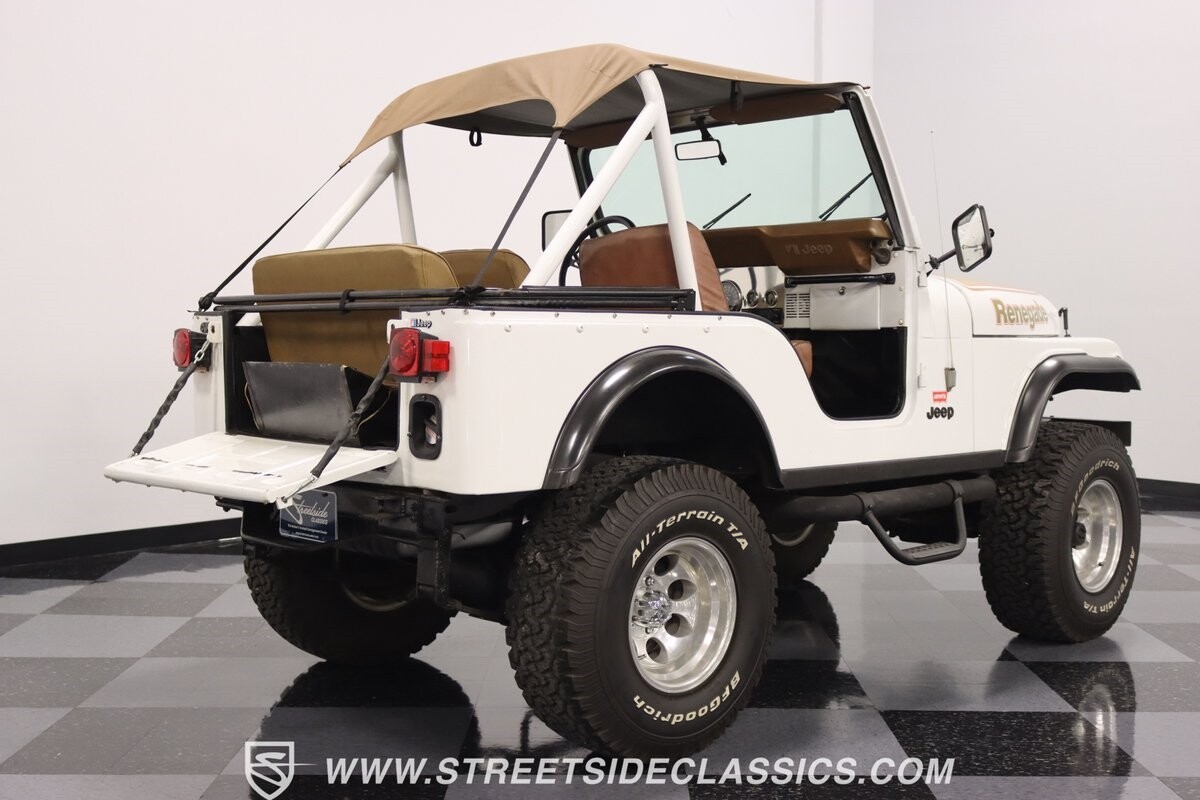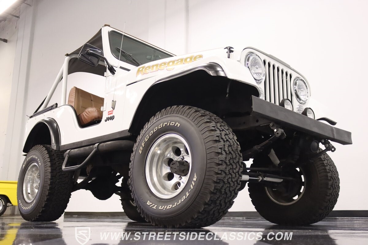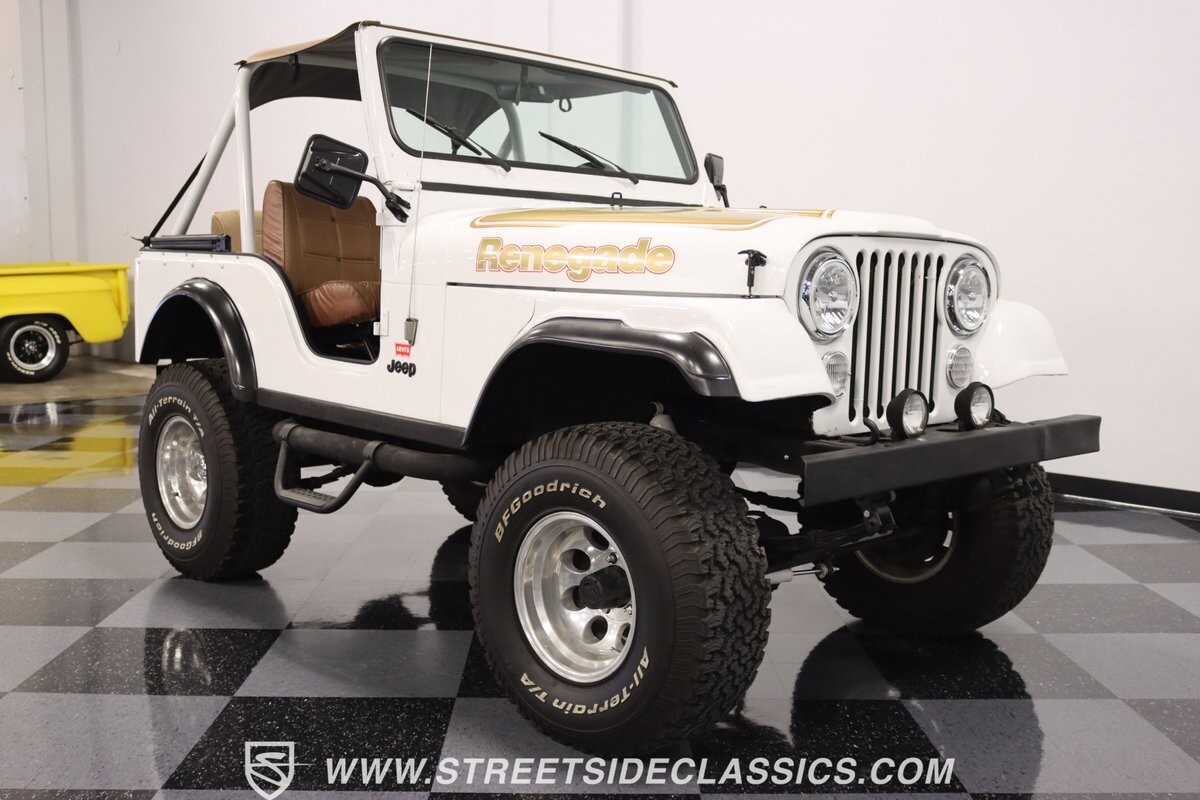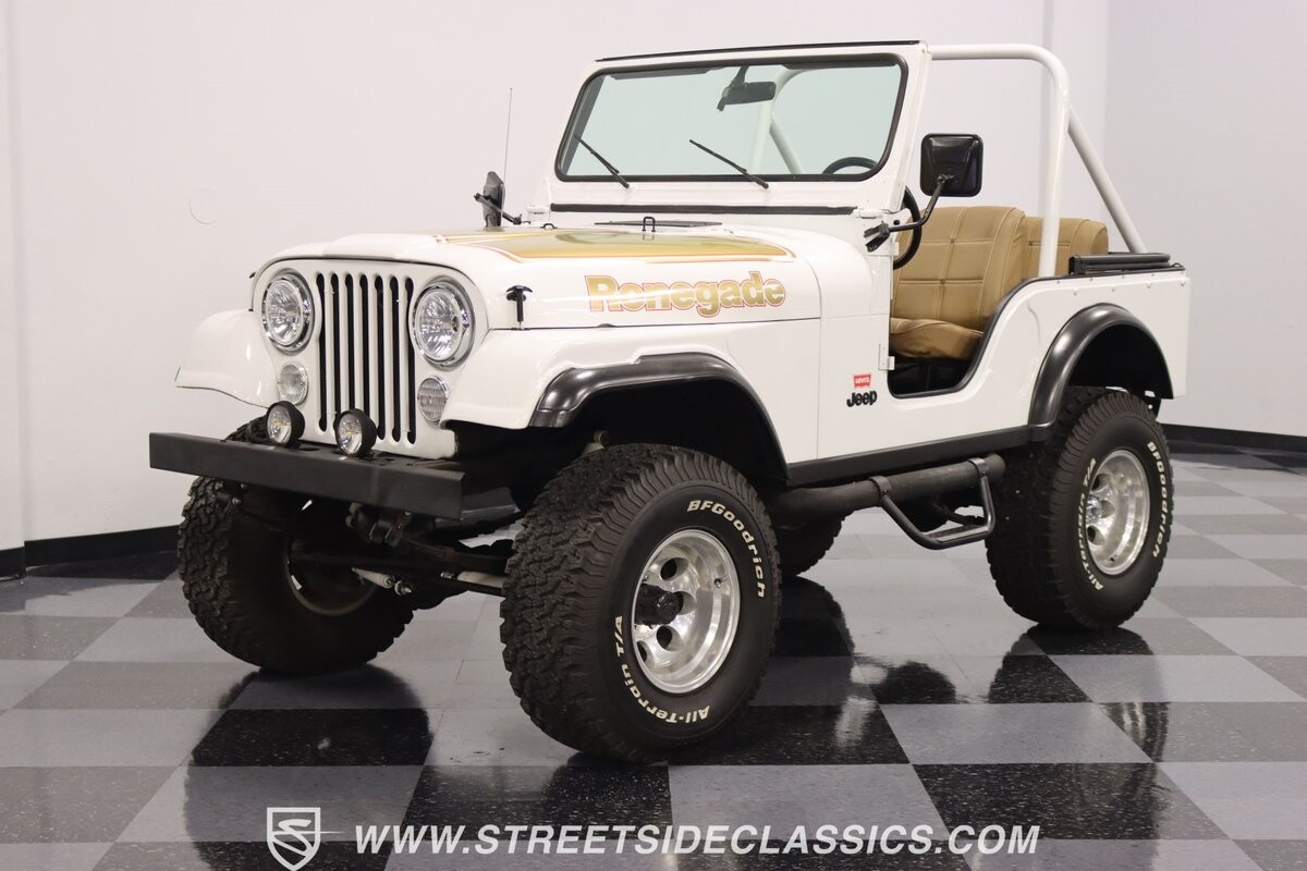 Just like the perfect pair of Levi jeans, the 1978 Jeep CJ5 Renegade Levi Edition embodies the spirit of American freedom and adventure. This rugged white warrior, wearing its factory original color, pays homage to the great outdoors with its gold decals, including the iconic "RENEGADE" on the hood. This CJ5 is equipped with 15" Pacer wheels wrapped in bold 33X12.50R15 BF Goodrich All-Terrain tires, ready to conquer any terrain. It comes with both a tan bikini top and a black soft top with doors, while the front fog lights are ready to pierce through the misty trails. The black steel bumpers and step ladder add to its rugged charm, making it the ultimate companion for your off-road escapades.