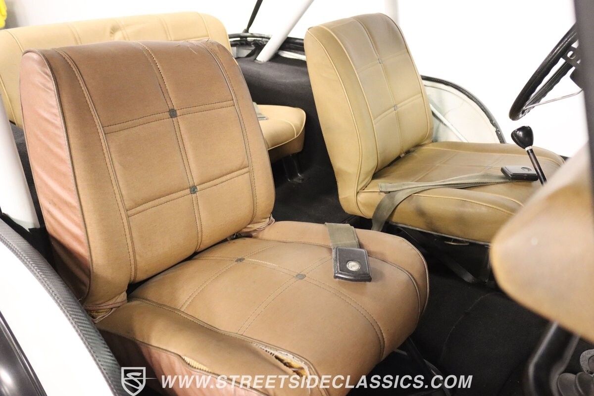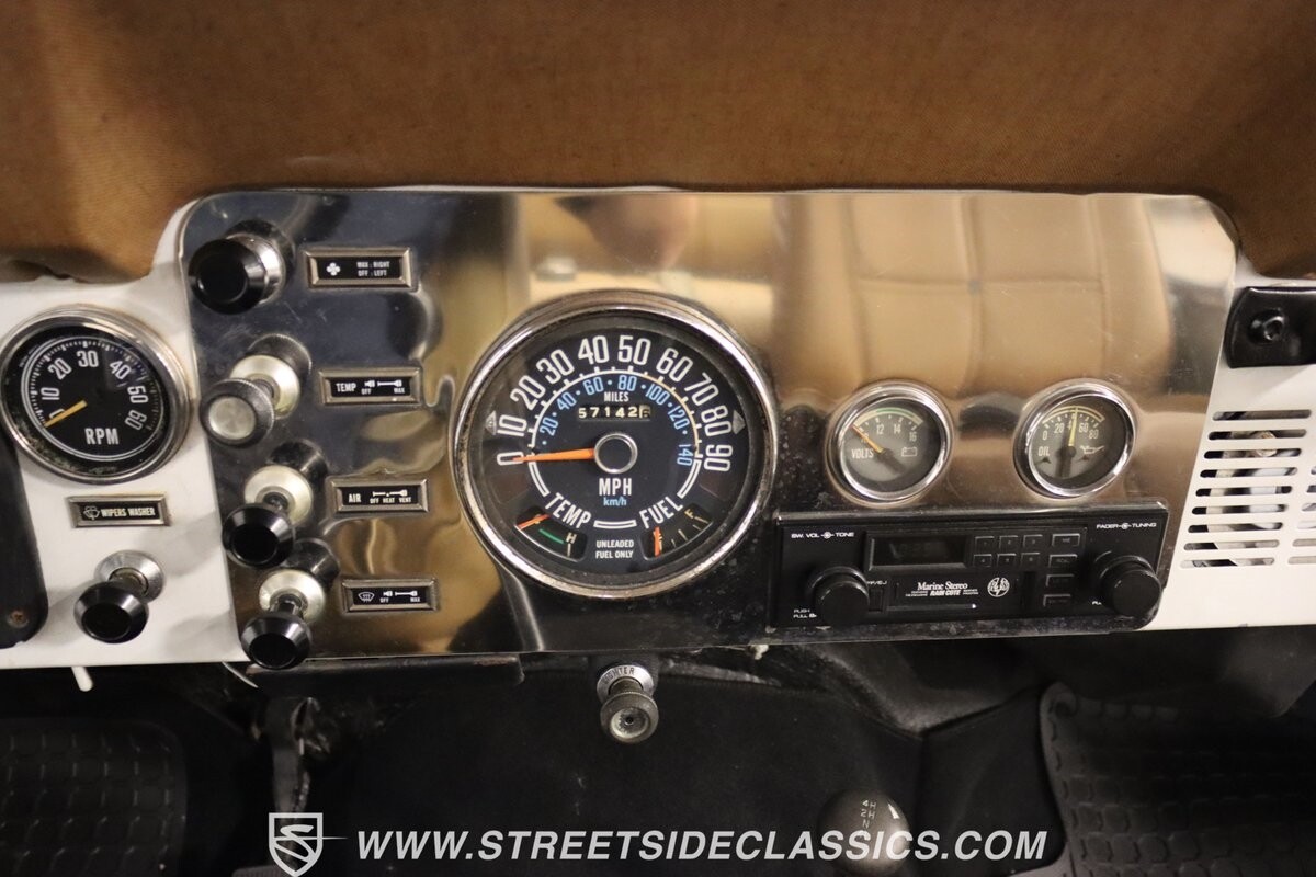 Step inside, and you're greeted by the original tan Levi vinyl bucket seats, providing comfort and durability as timeless as those iconic jeans. Featuring a Jeep steering wheel, black carpet flooring, a newer dash pad, an AM/FM/Cassette player, and an external speaker box in the trunk area for impromptu wilderness parties. The black billet knobs add a modern touch to the stock gauges.