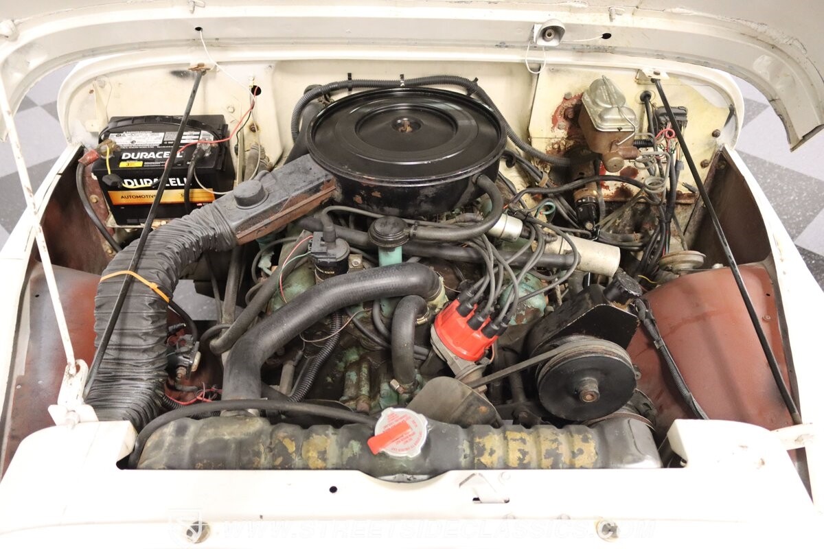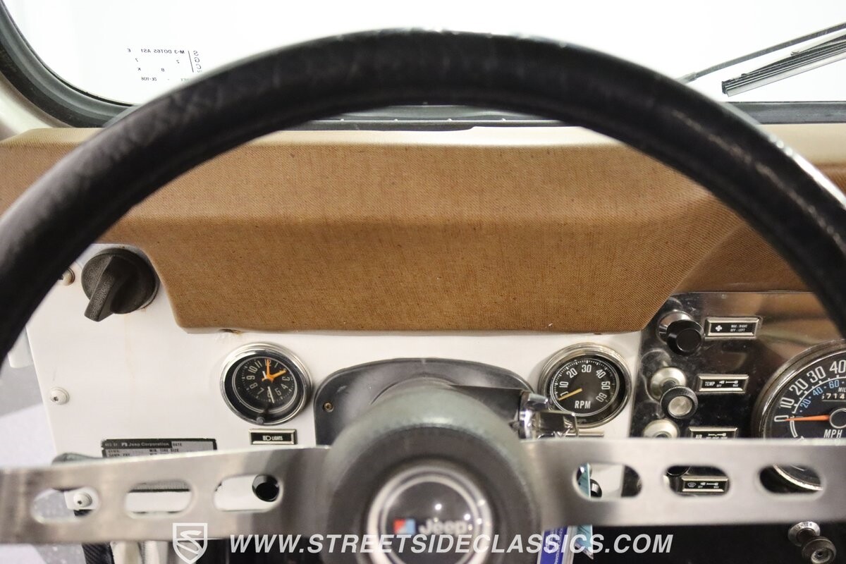 This Jeep derives its power from the 304 V8 engine, paired with a 3-speed manual transmission, ready to tackle untamed paths. With power steering for smooth navigation and a solid axle suspension with leaf springs and shocks, Dana 30 front axle and AMC 20 rear axle, coupled with the front disc brakes, provide reliability and control, essential for any adventure seeker.
