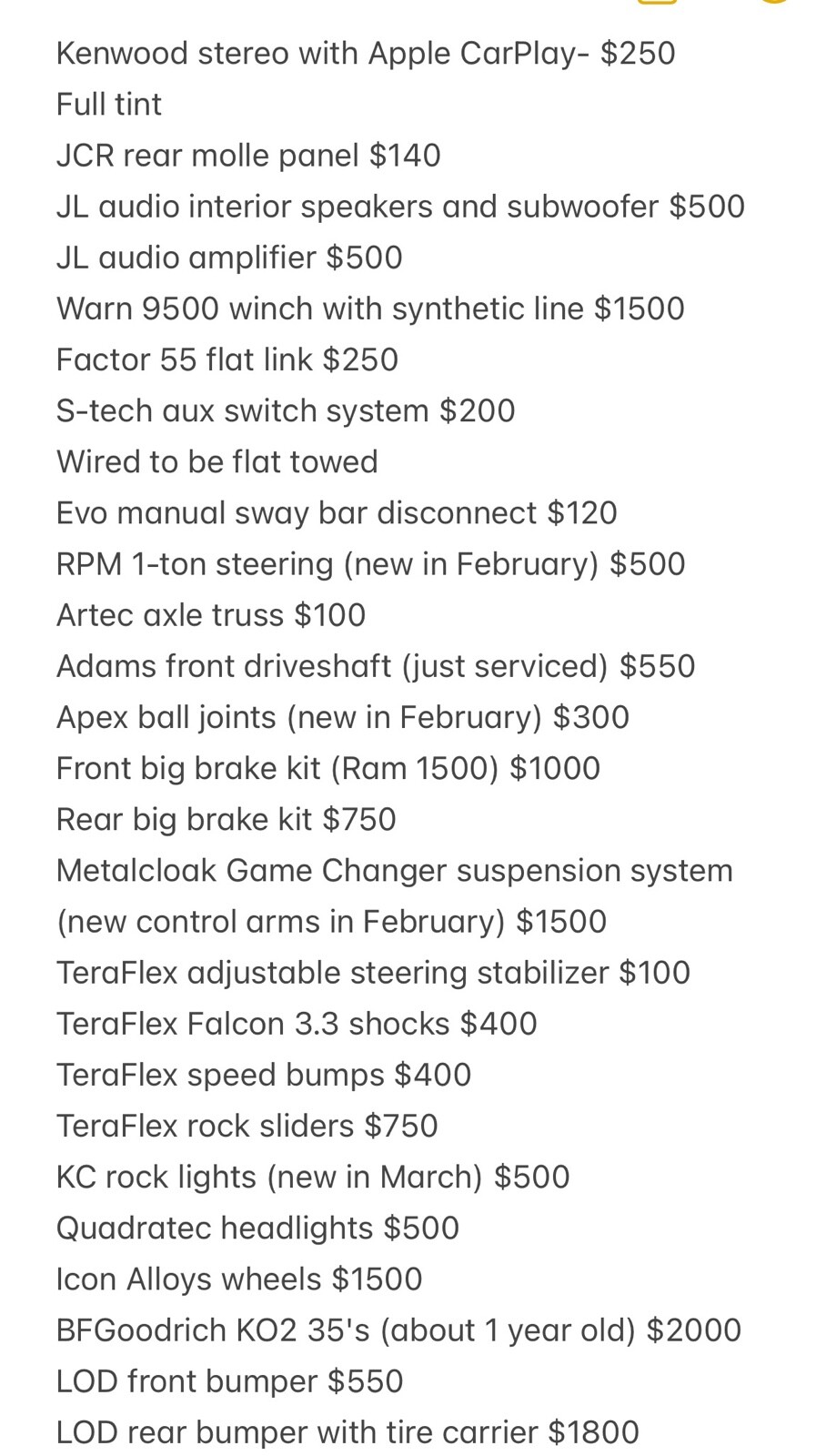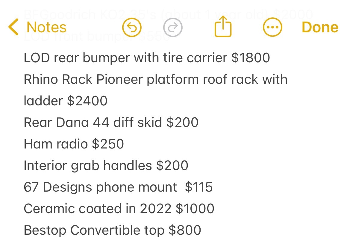 Fully loaded, power everything, heated leather seats, power inverter. Power steering pump, tensioner, idler pulleys, oil cooler, timing chain and drive shaft all replaced in the last couple of years. Tires were replaced 2k miles ago and come with discount tire certificates. Full body Ceramic coating done in 2022. Also have freedom panels, bestop convertible top is currently on the Jeep.