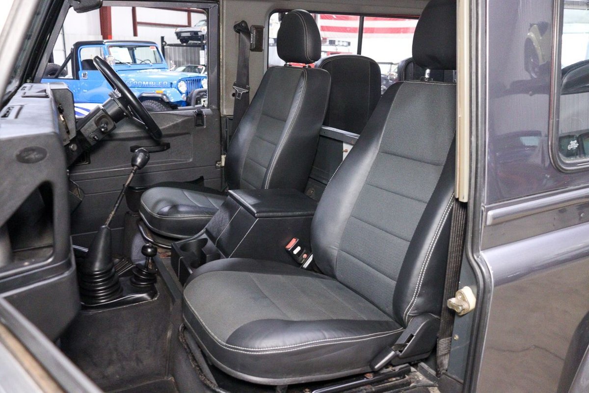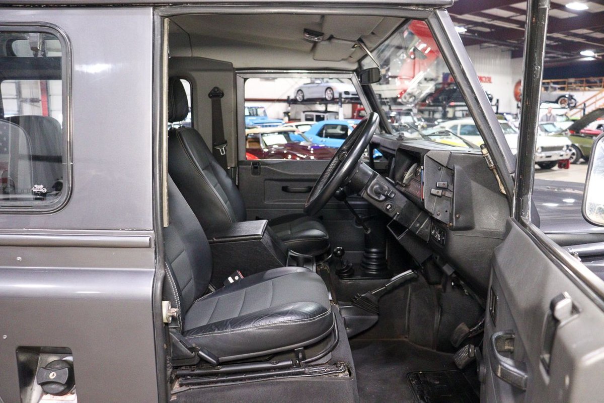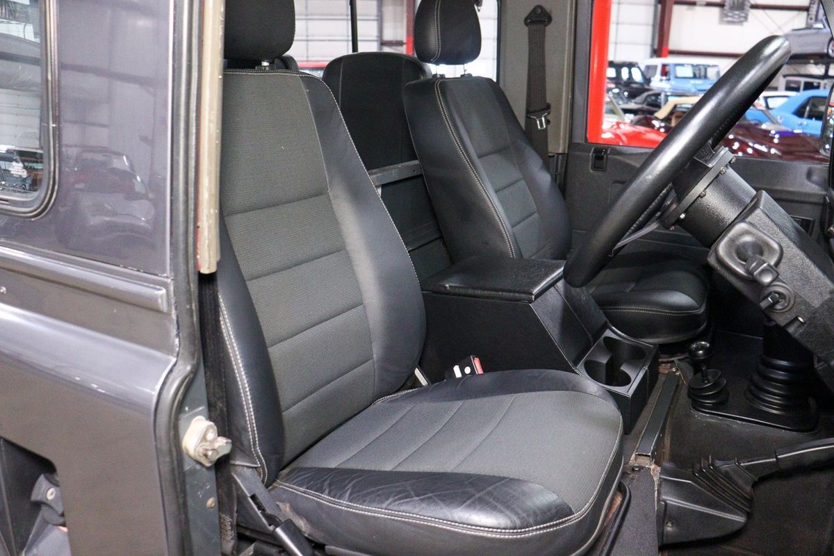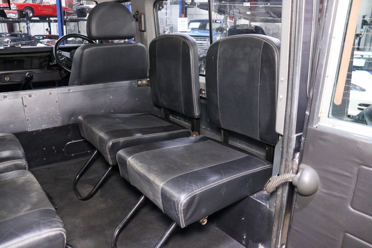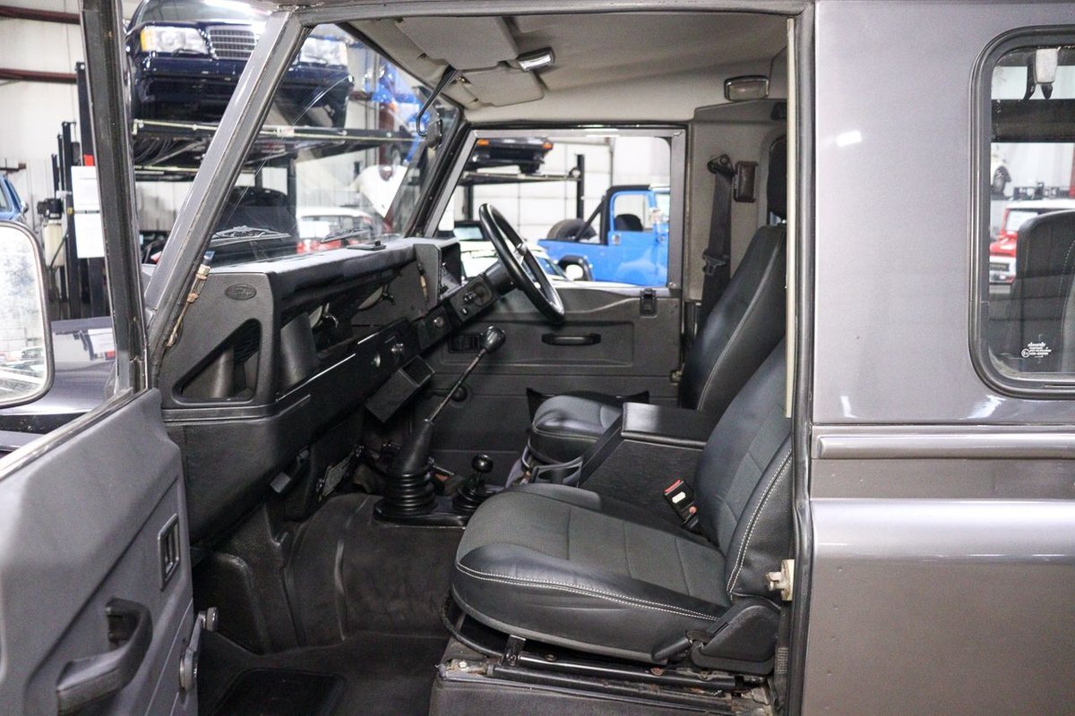 The Land Rover offered here is ready for anything you decide to throw at it. The Gray paint job shows very well and the body is straight and the gap fitment and doors alignment is good. The Defender has 4 rear jump seats allowing for more passengers. The SUV also has a rear spare tire, center console, power brakes.