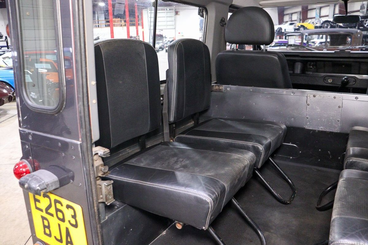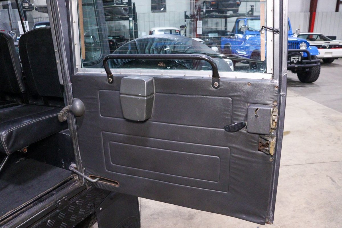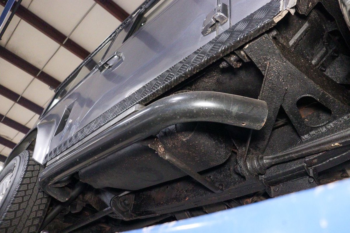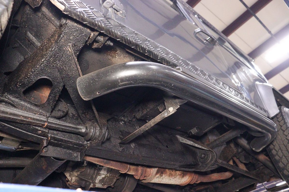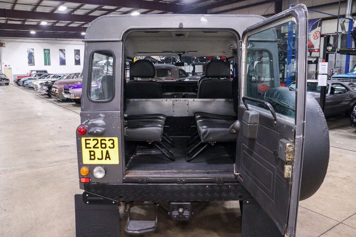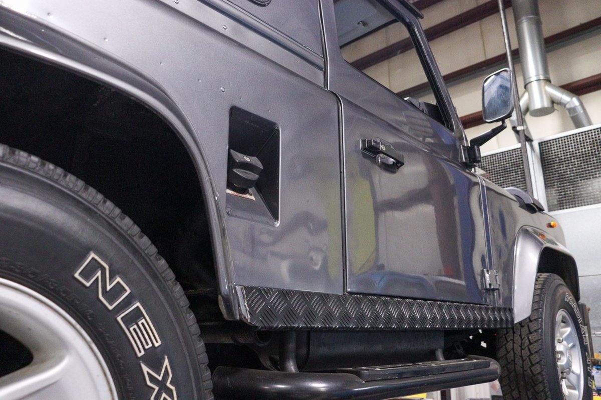 The Land Rover offered here is ready for anything you decide to throw at it. The Gray paint job shows very well and the body is straight and the gap fitment and doors alignment is good. The Defender has 4 rear jump seats allowing for more passengers. The SUV also has a rear spare tire, center console, power brakes.
