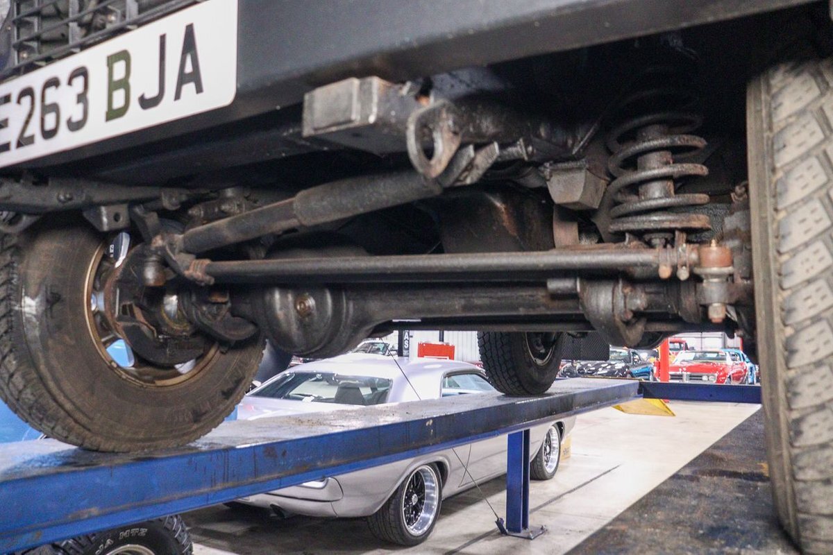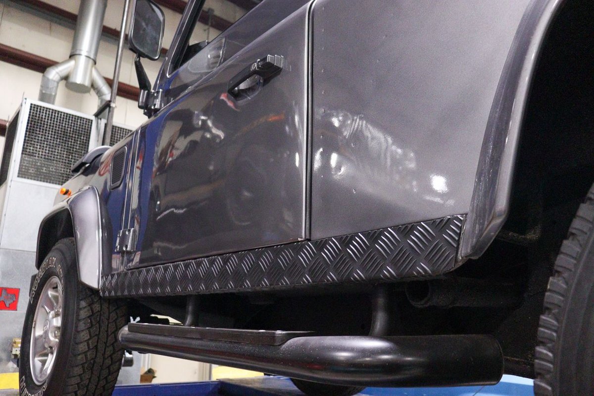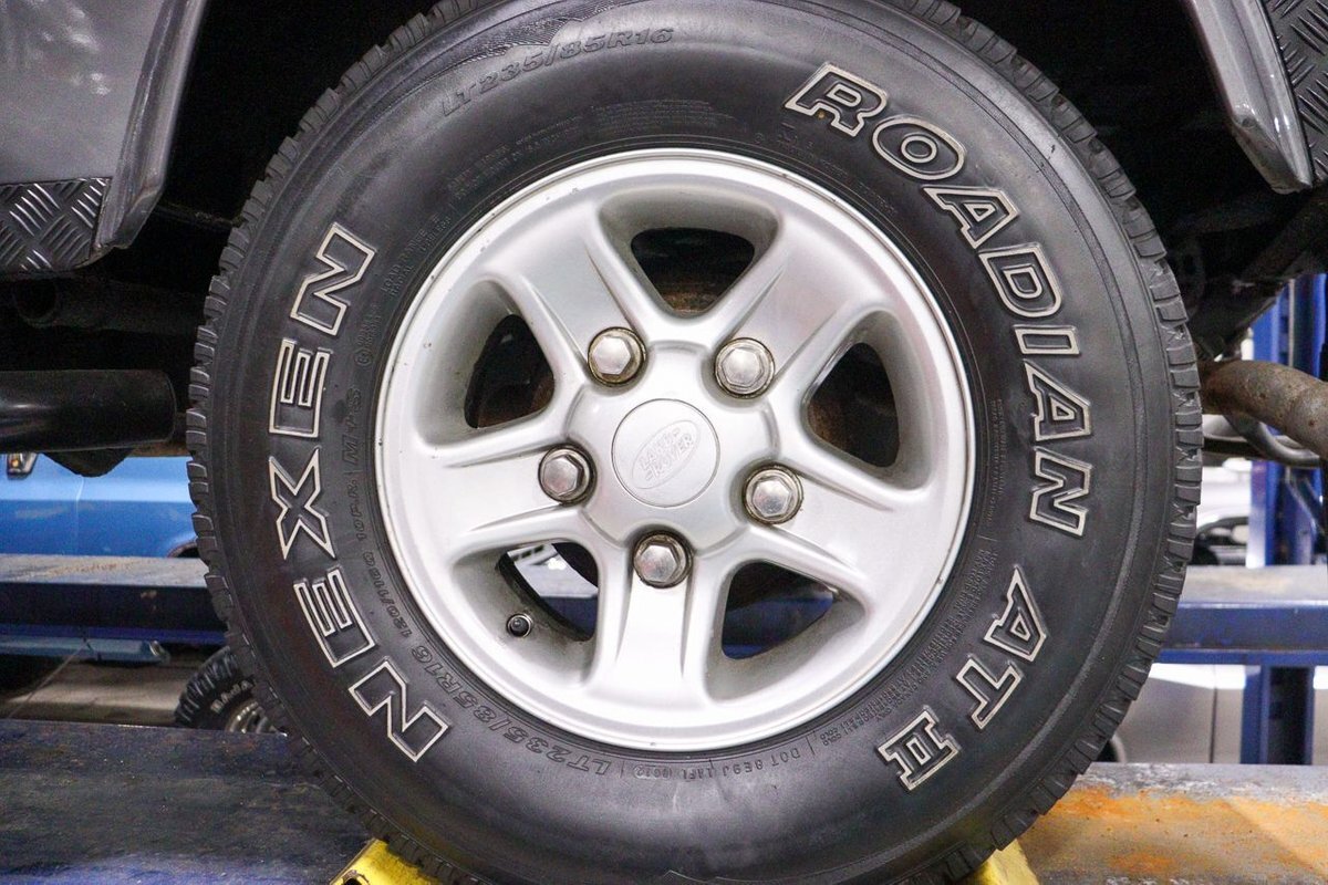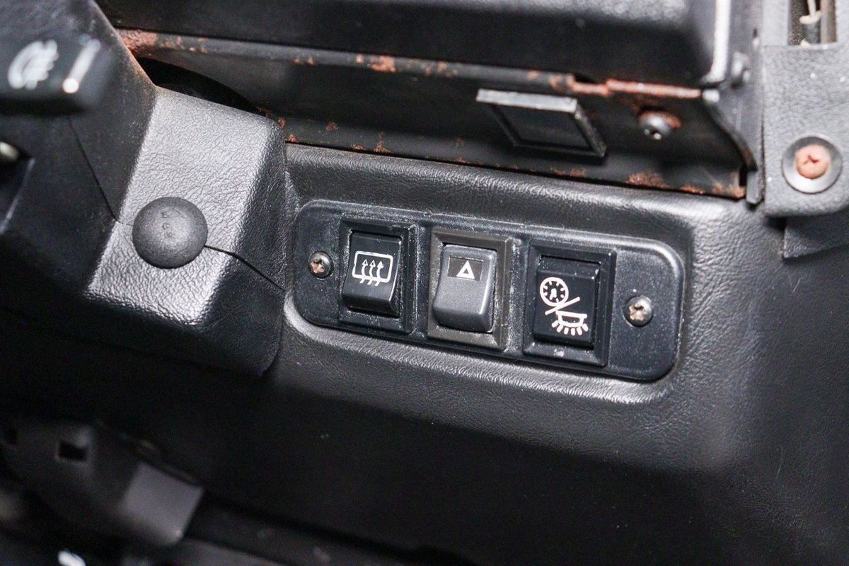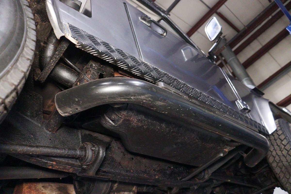 The Land Rover offered here is ready for anything you decide to throw at it. The Gray paint job shows very well and the body is straight and the gap fitment and doors alignment is good. The Defender has 4 rear jump seats allowing for more passengers. The SUV also has a rear spare tire, center console, power brakes.
