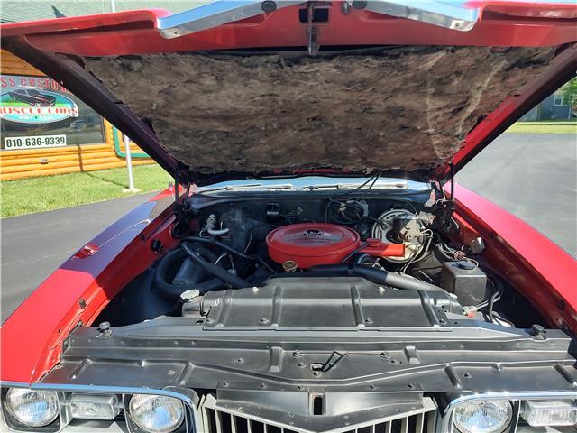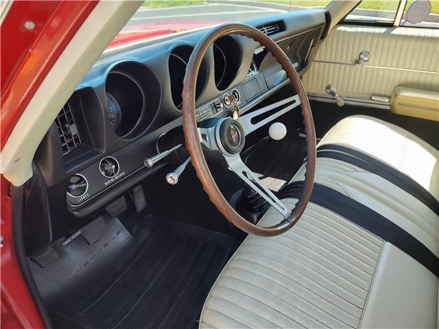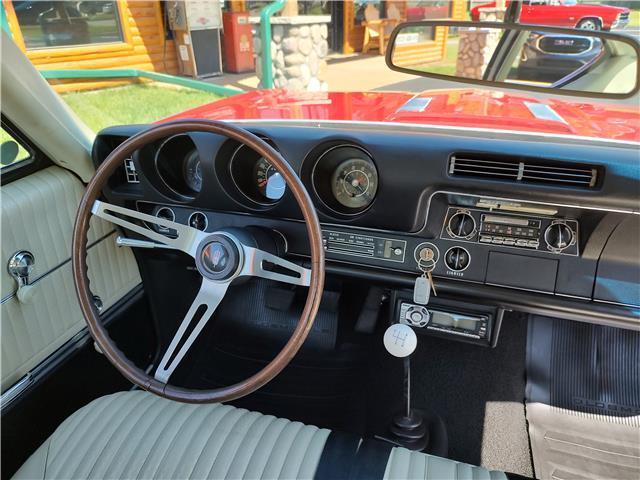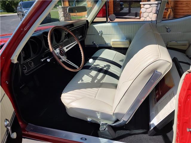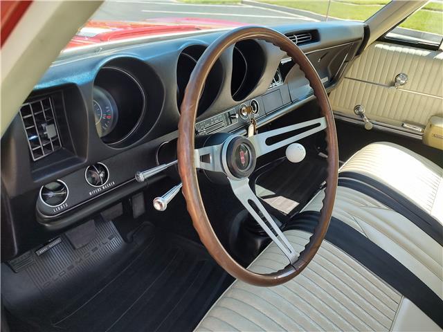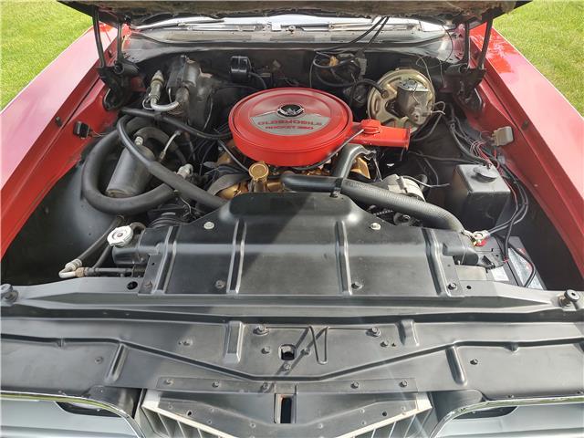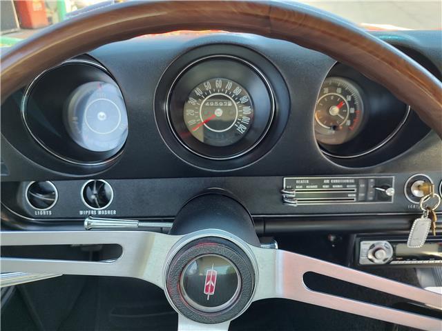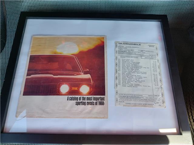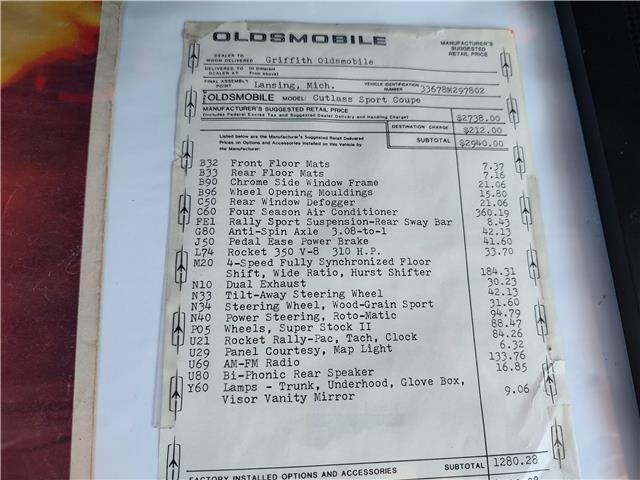 Factory original Parchment interior, original dash in excellent condition; showing 49,000 miles, Rocket Rally gauge package, tach clock which is very rare, tilt steering, factory wood grain sport wheel, factory AM/FM radio; also has updated AM/FM/CD stereo nicely mounted under dash, Bi-Phonic rear speaker, courtesy map light package, rear defogger, Four Season Air Conditioning, also has optional lamp package which included truck, under hood, glove box and visor vanity mirror, original headliner in excellent condition; as well as visors, original front and rear door panels in excellent condition, original front and rear seat covers in excellent condition - no tares, factory front and rear seat belts with optional shoulder straps, appears carpet has been replaced, factory Hurst shifter and boot, factory deluxe Oldsmobile floor mats.