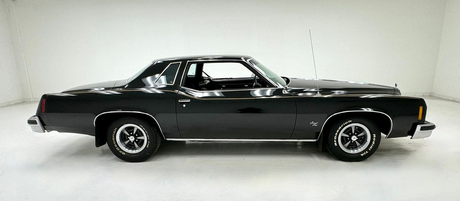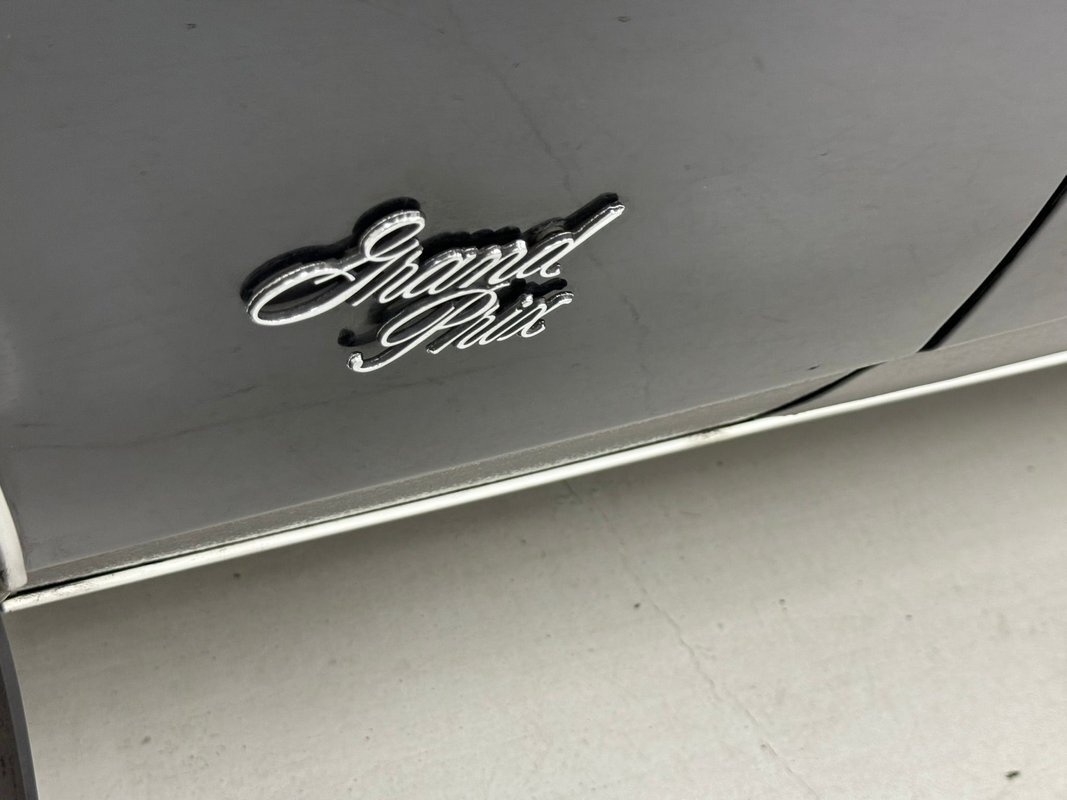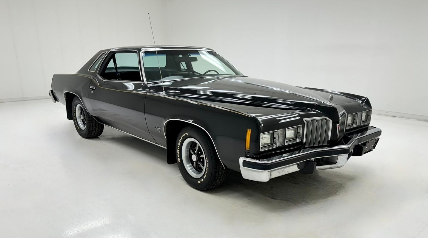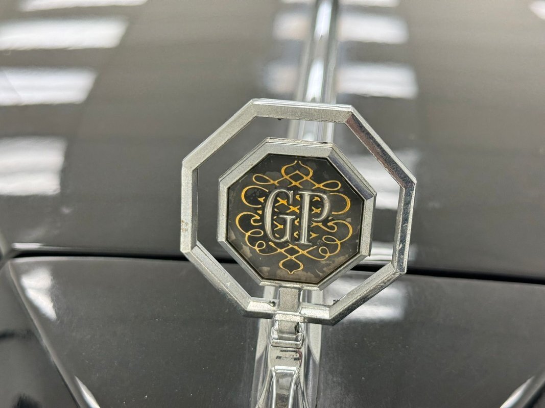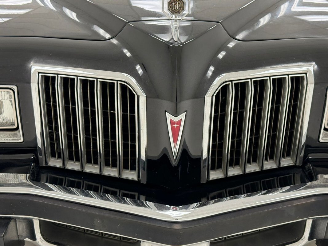 A complete reworking of the front header and bumper highlights this 1977 Grand Prix, which was the final year for the 1973-vintage body shell that was set to be replaced by a downsized GP for 1978. Up front the parking lamps are positioned between the quad headlamps and the previous year's waterfall grille was replaced by a narrower one that extends into the lower portion of the bumper. These grilles flank a traditional Pontiac beak and down low a clean and shiny chrome bumper splits the twin grilles just perfectly. A trim tag matching coating of Starlite Black lusciously covers this steel slab sided car which appears to have been dipped in it. Some light hazing of the finish is noted but no rust or rot is seen. Arrow-like pointed body lines are abundant on the top surfaces, like the sharply pointed hood and veed rear glass, to the trunk deck which follows suit and takes cues from the front with another V pointed rear panel, with underlying bumper. The taillights are neatly embedded above the rear bumper and the styling is like nothing to ever be duplicated by an auto manufacturer. A shiny rocker trim runs from well to well, and the wells take from it and are surrounded by thin chromed trim. Just above on the beltline we note gold pinstriping that follows the undulating body sides nicely. Pontiac Rally II wheels in 15-inch format are wrapped in staggered width BF Goodrich raised white letter radials for that period perfect look.