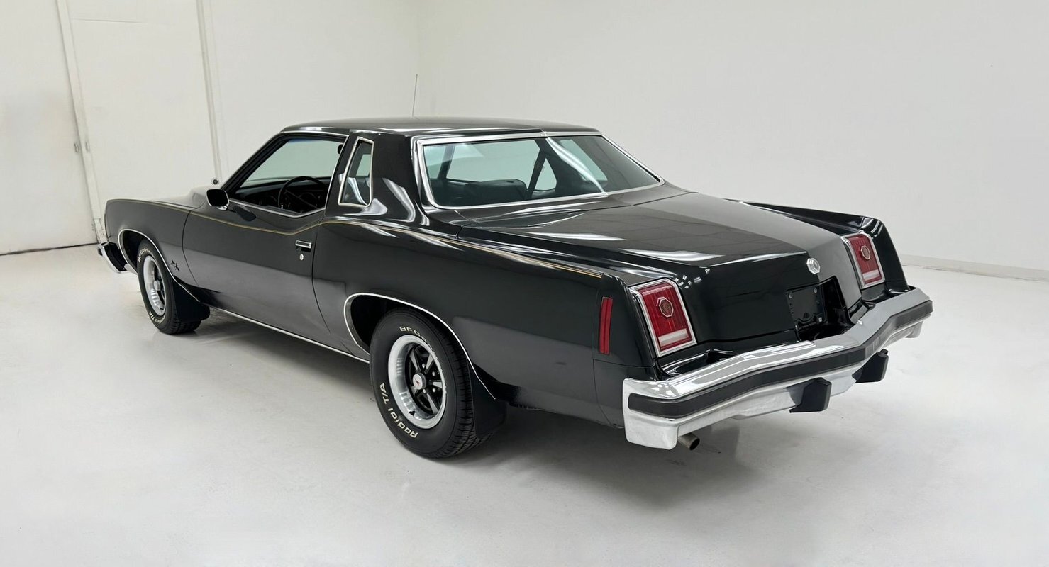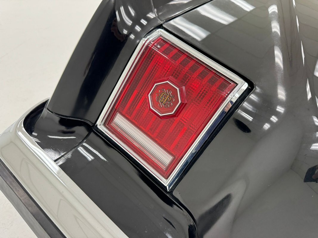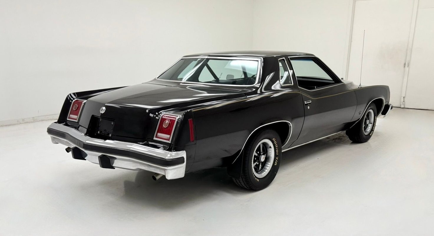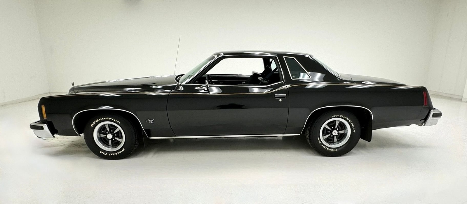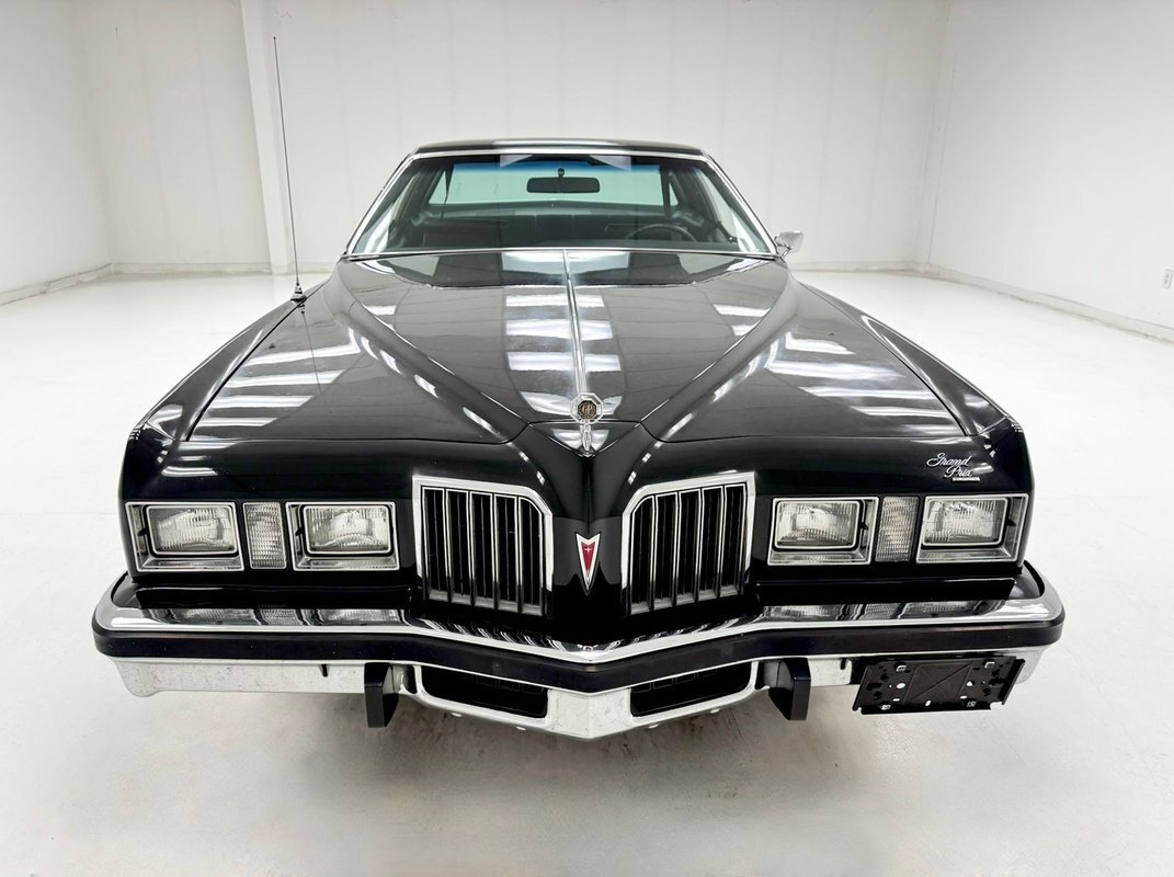 A complete reworking of the front header and bumper highlights this 1977 Grand Prix, which was the final year for the 1973-vintage body shell that was set to be replaced by a downsized GP for 1978. Up front the parking lamps are positioned between the quad headlamps and the previous year's waterfall grille was replaced by a narrower one that extends into the lower portion of the bumper. These grilles flank a traditional Pontiac beak and down low a clean and shiny chrome bumper splits the twin grilles just perfectly. A trim tag matching coating of Starlite Black lusciously covers this steel slab sided car which appears to have been dipped in it. Some light hazing of the finish is noted but no rust or rot is seen. Arrow-like pointed body lines are abundant on the top surfaces, like the sharply pointed hood and veed rear glass, to the trunk deck which follows suit and takes cues from the front with another V pointed rear panel, with underlying bumper. The taillights are neatly embedded above the rear bumper and the styling is like nothing to ever be duplicated by an auto manufacturer. A shiny rocker trim runs from well to well, and the wells take from it and are surrounded by thin chromed trim. Just above on the beltline we note gold pinstriping that follows the undulating body sides nicely. Pontiac Rally II wheels in 15-inch format are wrapped in staggered width BF Goodrich raised white letter radials for that period perfect look.