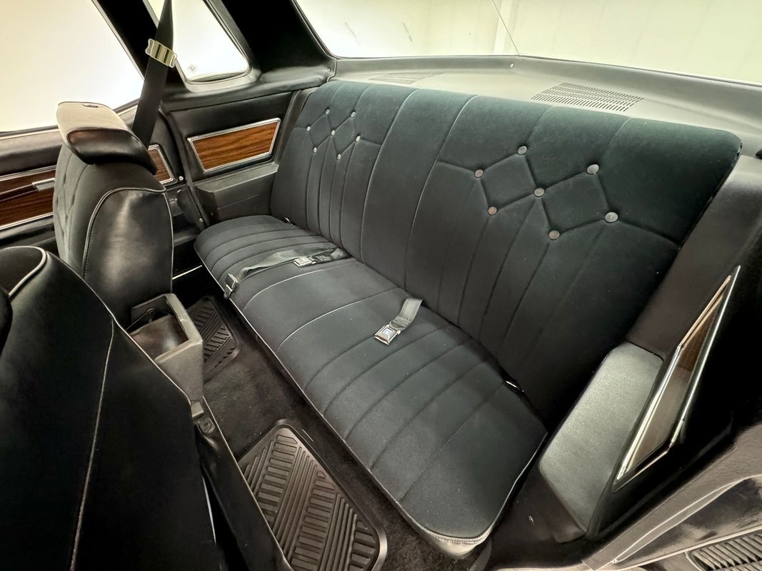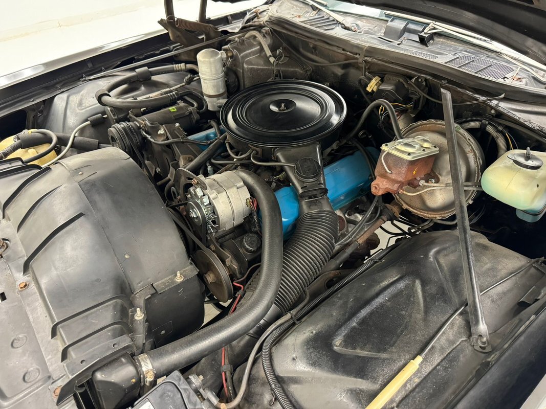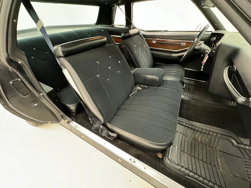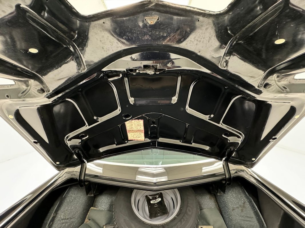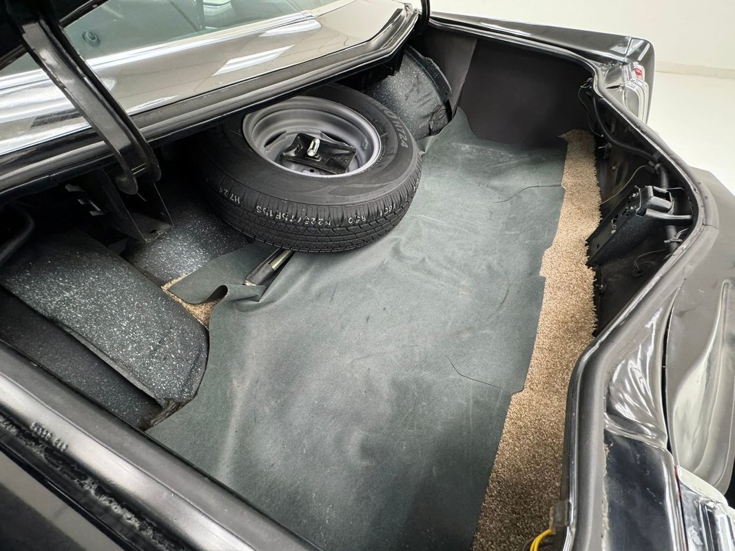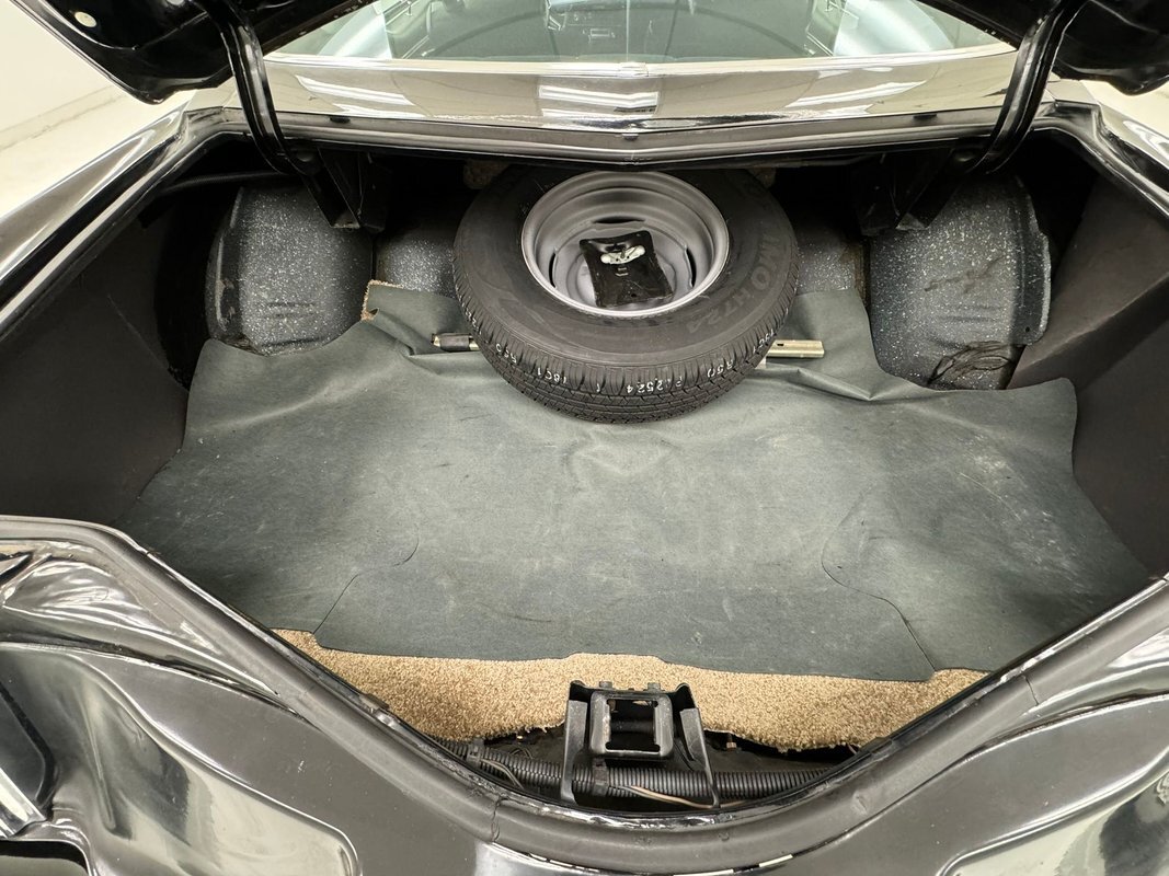 Looking into a very clean and well-preserved interior wrapped in clean and mean black with plenty of factory options. The driver's door panel is near showroom and contains a chrome actuator, window crank and rear seat ashtray along with a black leather pull and some wood applique dressing up the padded black vinyl. Seating also in black and has a mixture of tuck and broadcloth inserts and smooth broadcloth bolsters complete with pristine piping and very little fading of the bolsters. Some buttoning is on the upper back of the split front bench and in the rear is a matching pattern bench. The dash is all original and very clean with a bevy of gauges and warning lamps added in at the factory all within a clean applique backdrop. Sitting below the dash in more applique is the factory AM stereo and above are the round vents and the "Radial Tuned Suspension" plaque. Clean deep pile black carpet floods the floors and a tight puffy headliner hangs above. Not to be left out is the V-shaped trunk with its factory splatter paint and vinyl liner.