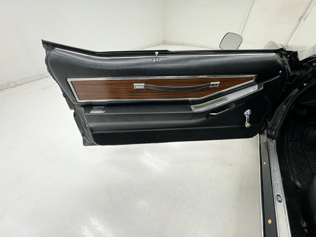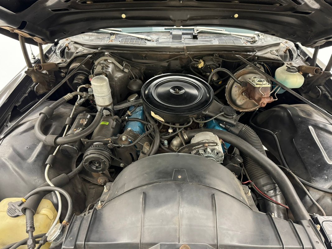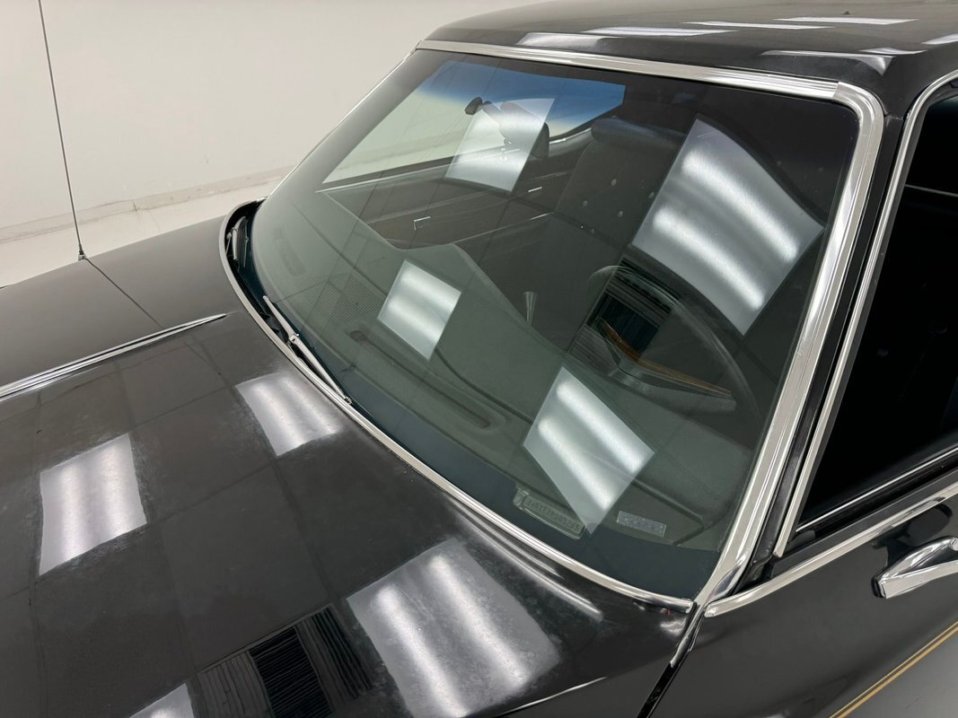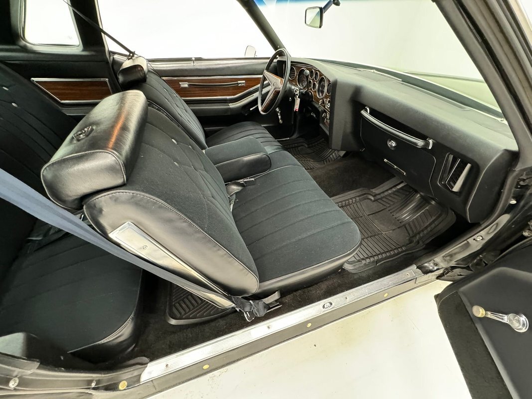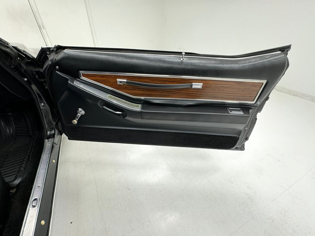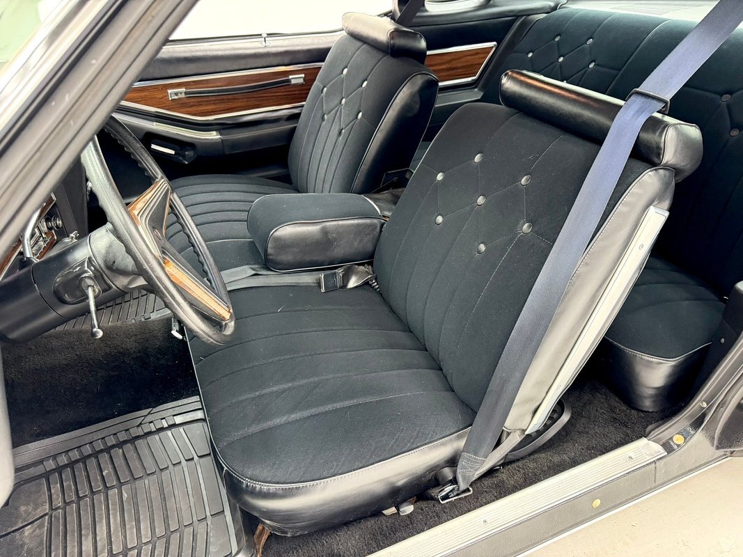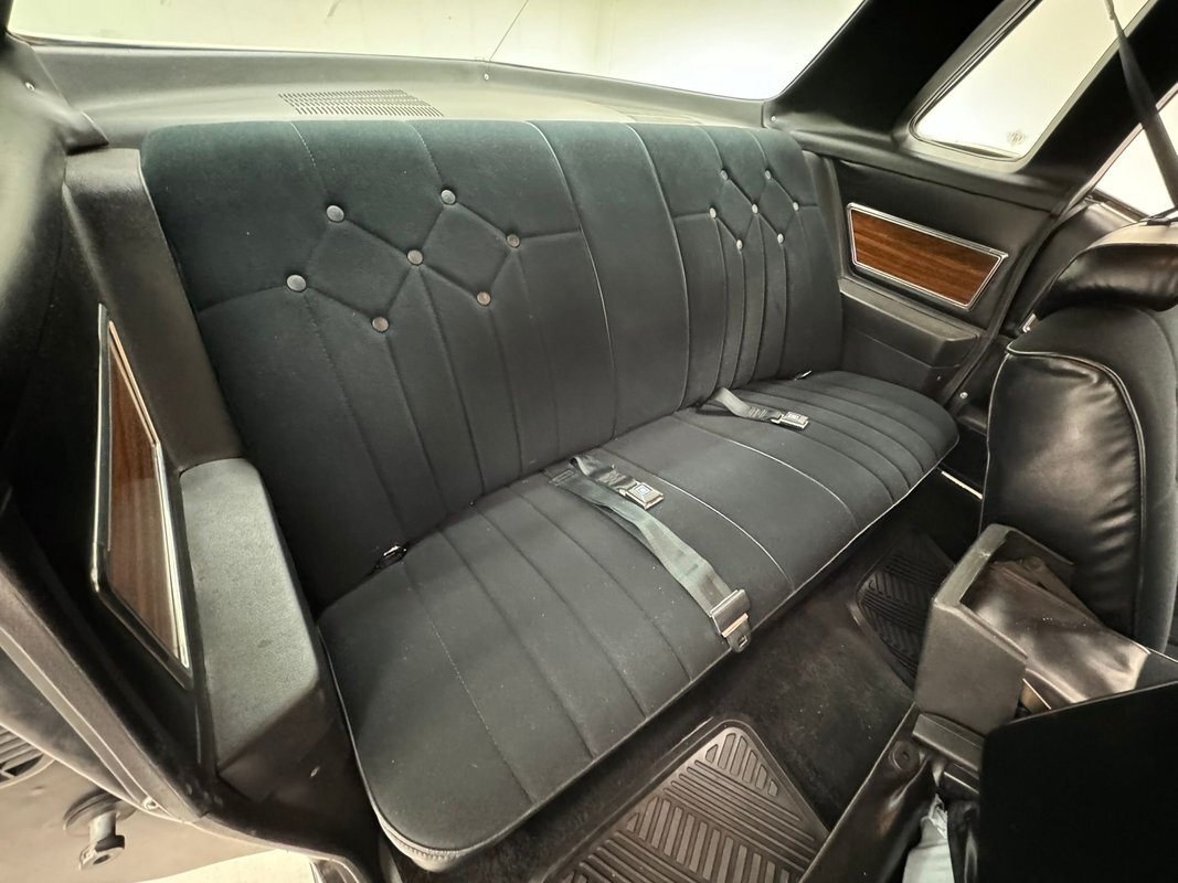 Looking into a very clean and well-preserved interior wrapped in clean and mean black with plenty of factory options. The driver's door panel is near showroom and contains a chrome actuator, window crank and rear seat ashtray along with a black leather pull and some wood applique dressing up the padded black vinyl. Seating also in black and has a mixture of tuck and broadcloth inserts and smooth broadcloth bolsters complete with pristine piping and very little fading of the bolsters. Some buttoning is on the upper back of the split front bench and in the rear is a matching pattern bench. The dash is all original and very clean with a bevy of gauges and warning lamps added in at the factory all within a clean applique backdrop. Sitting below the dash in more applique is the factory AM stereo and above are the round vents and the "Radial Tuned Suspension" plaque. Clean deep pile black carpet floods the floors and a tight puffy headliner hangs above. Not to be left out is the V-shaped trunk with its factory splatter paint and vinyl liner.