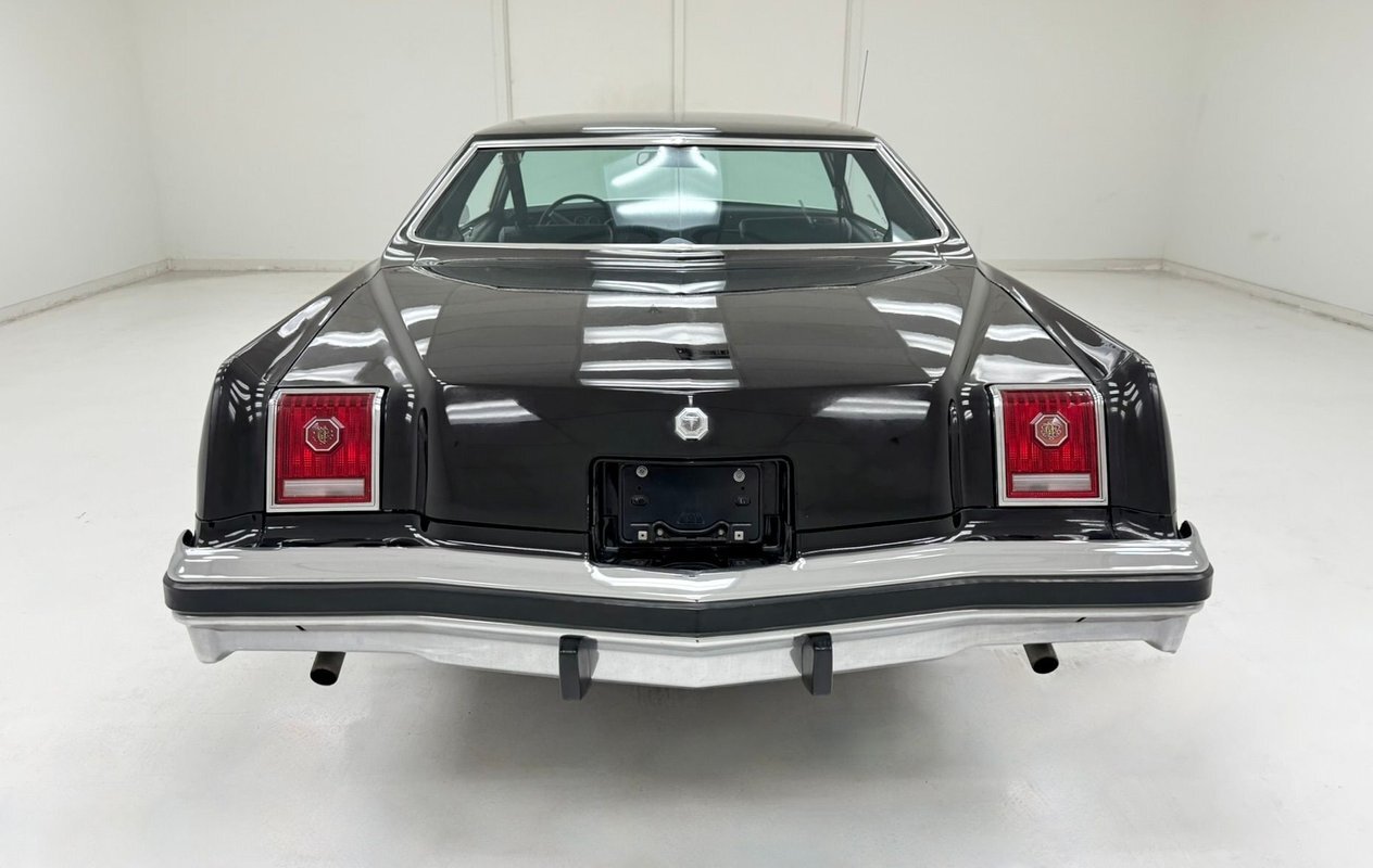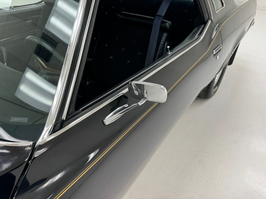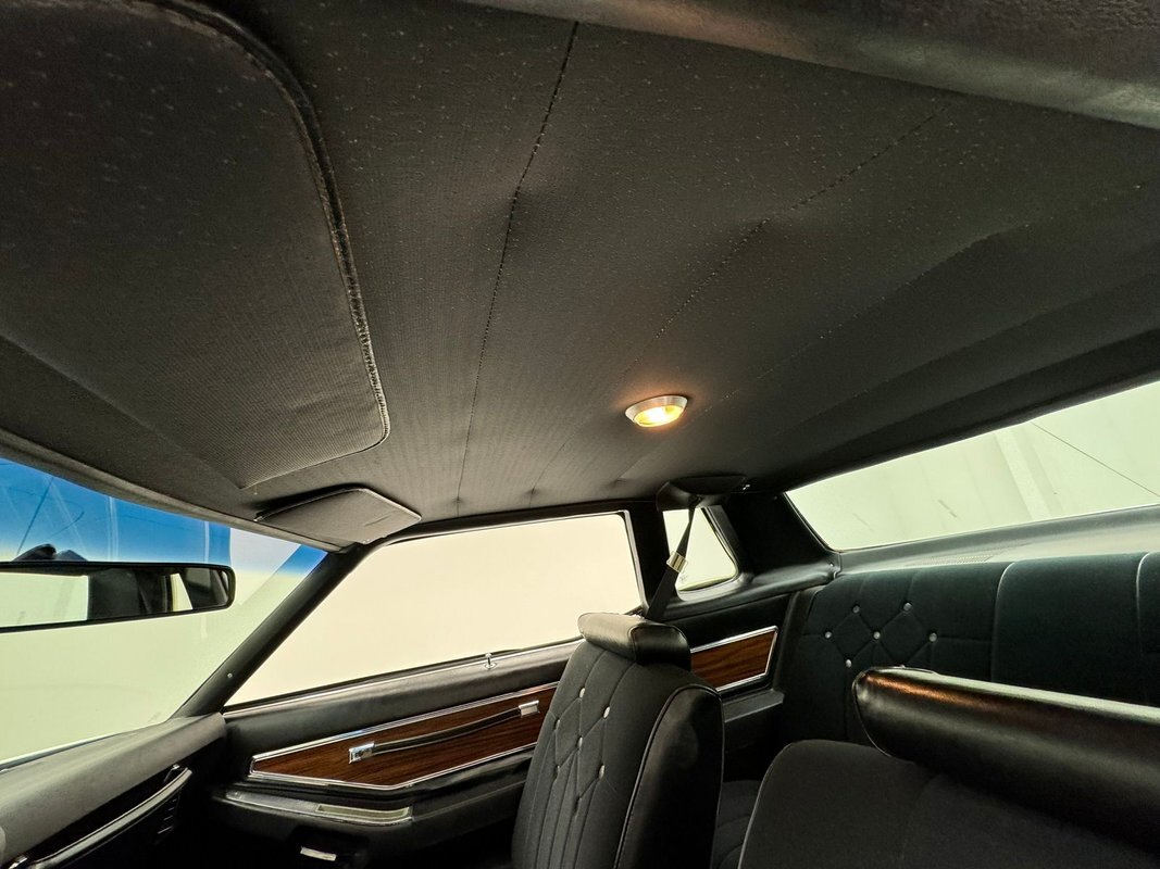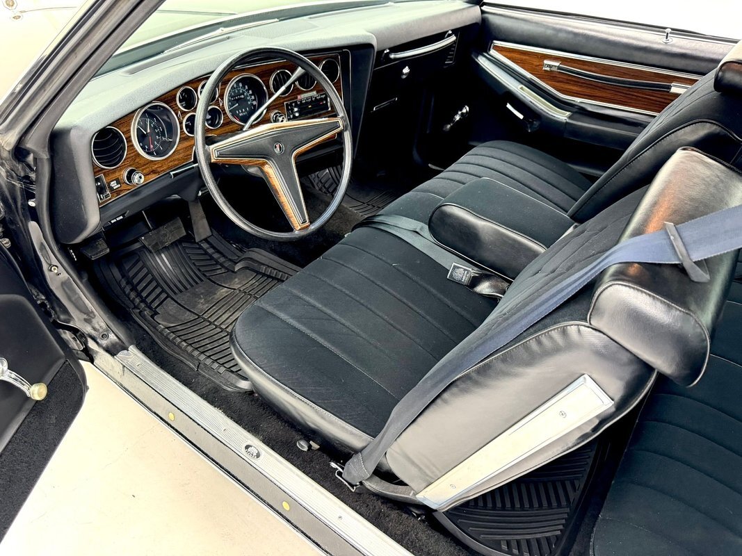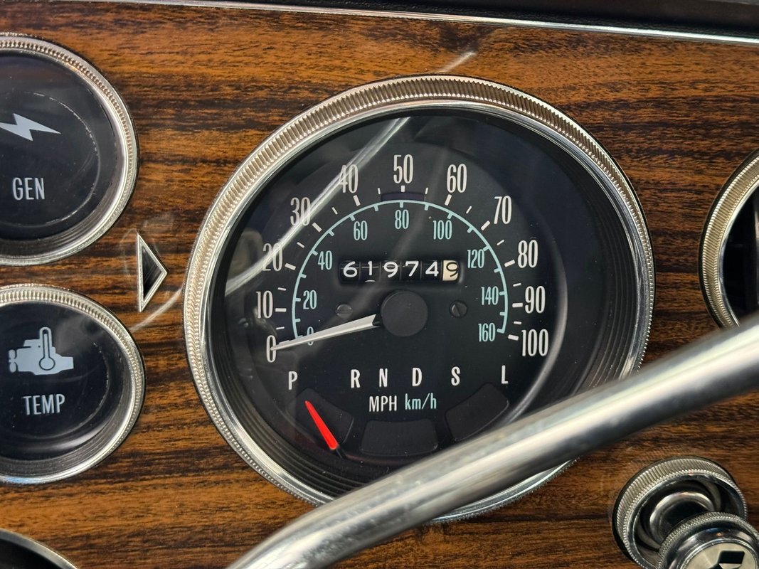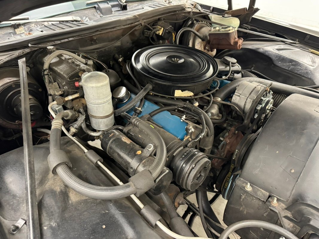 Looking into a very clean and well-preserved interior wrapped in clean and mean black with plenty of factory options. The driver's door panel is near showroom and contains a chrome actuator, window crank and rear seat ashtray along with a black leather pull and some wood applique dressing up the padded black vinyl. Seating also in black and has a mixture of tuck and broadcloth inserts and smooth broadcloth bolsters complete with pristine piping and very little fading of the bolsters. Some buttoning is on the upper back of the split front bench and in the rear is a matching pattern bench. The dash is all original and very clean with a bevy of gauges and warning lamps added in at the factory all within a clean applique backdrop. Sitting below the dash in more applique is the factory AM stereo and above are the round vents and the "Radial Tuned Suspension" plaque. Clean deep pile black carpet floods the floors and a tight puffy headliner hangs above. Not to be left out is the V-shaped trunk with its factory splatter paint and vinyl liner.