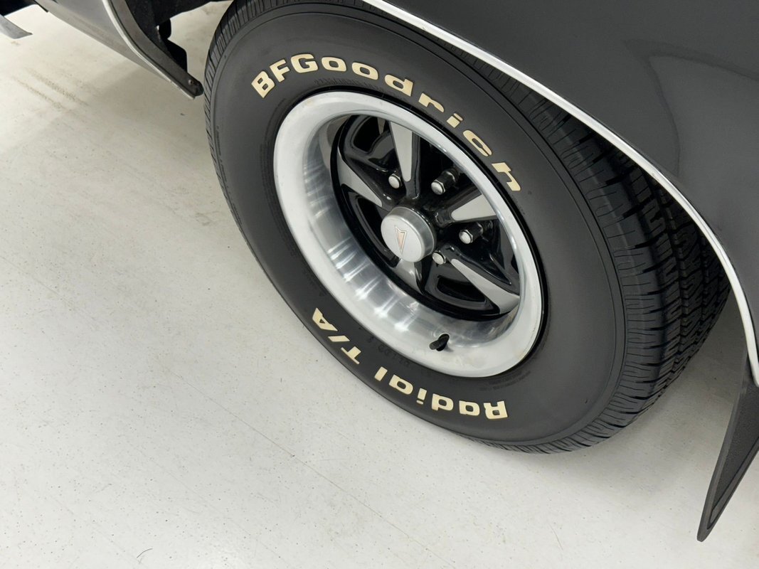 Lifting the long steel hood reveals the factory correct and numbers matching 301ci V8 sitting within a very clean engine bay. This is topped with a 2-barrel carburetor, and backed by the correct and numbers matching TH400 3-speed automatic transmission. A 10-bolt rear axle is on the way back. Hints of Pontiac blue shine through in the bay under all the soft and supple hoses, wiring and ducting.