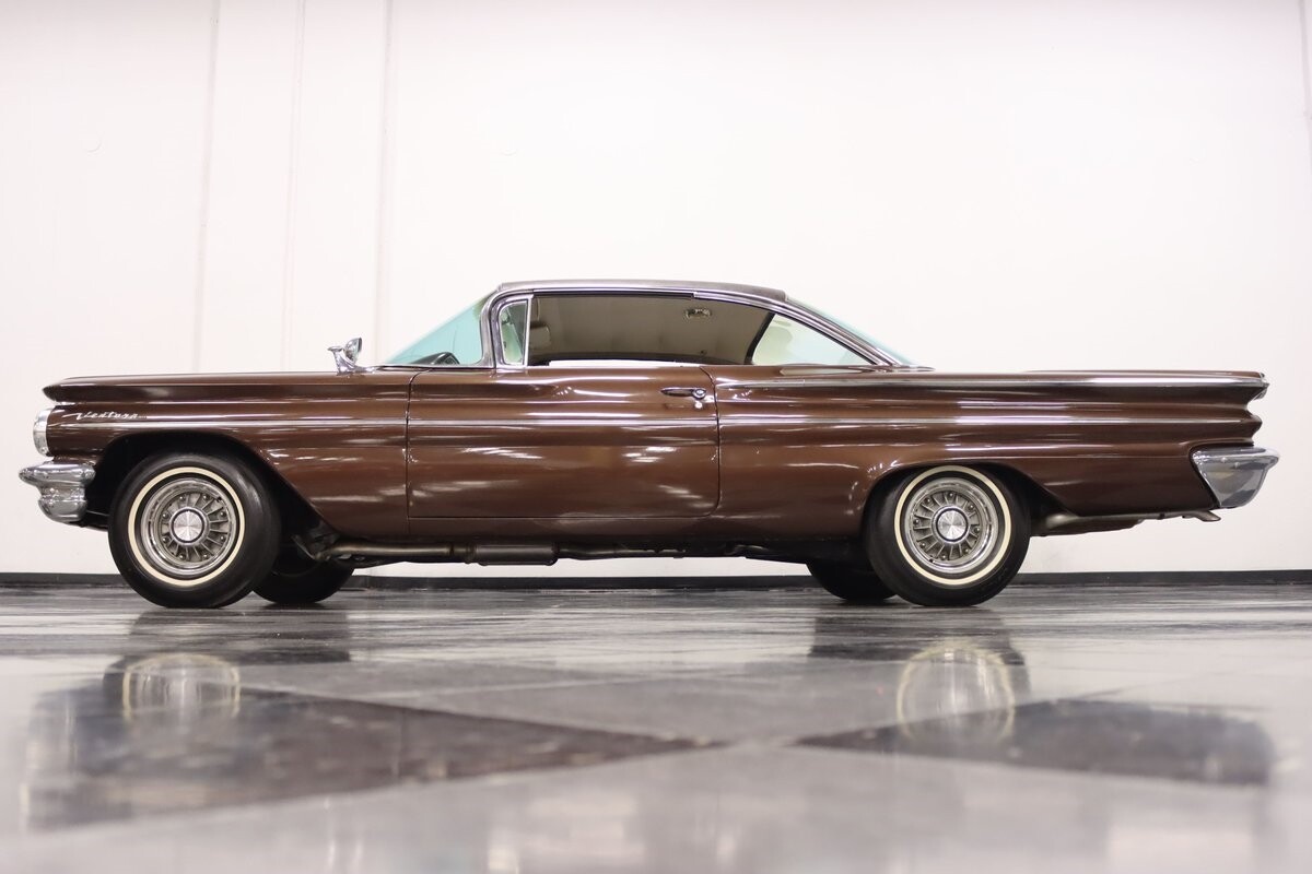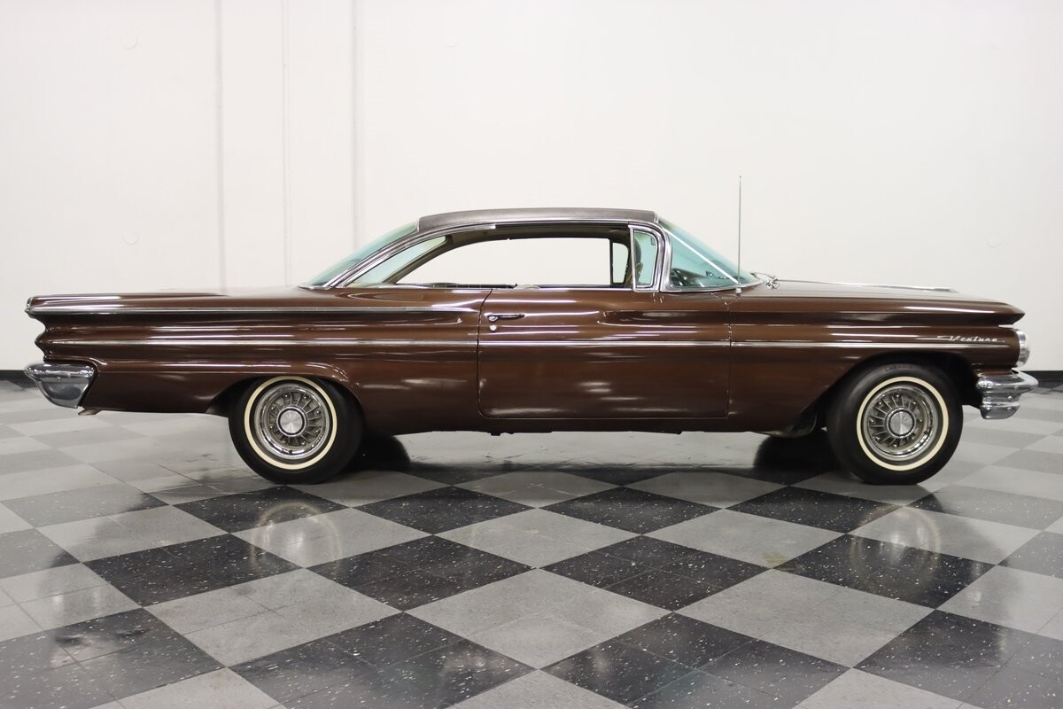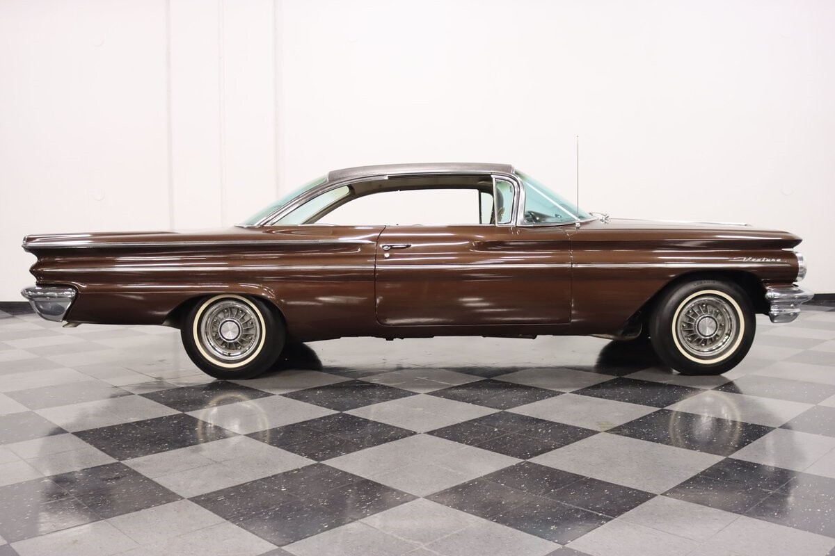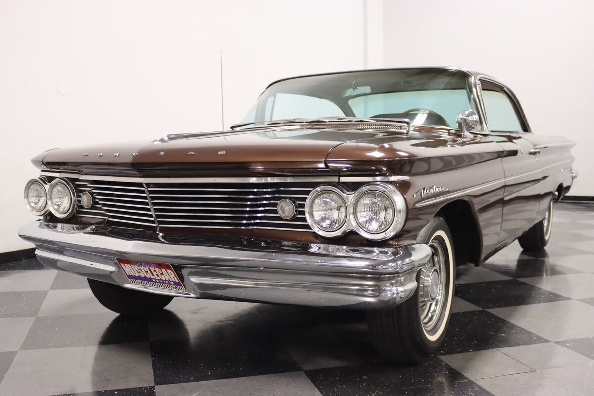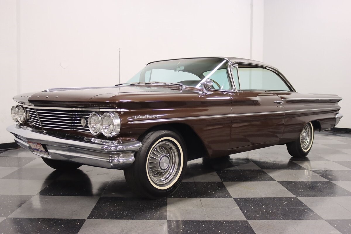 Refinished in Code N Mahogany Metallic, this stunning bubble-top coupe doesn't need a bunch of chrome or a convertible top to stop traffic wherever it goes. Freshly designed for the 1960 model year, the look is pure satellite-era Pontiac all around (the profile practically looks like a spaceship dome atop a flat platform), but one can also see the hints of the GTO to come in the front end. The aforementioned flat hood and decklid make the car look gigantic, even though it's actually built on GM smaller 122-inch wheelbase. It's obvious that the car was painted not terribly long ago, as the finish still has a very fresh look, and although it's certainly a driver, it's a top-end driver with deep, lustrous paint that has very few imperfections to speak of. In fact, take a couple steps back and you likely won't spot a demerit, and a professional buff-and-wax would only further improve things. Undivided horizontal bars in the unique front grille were actually quite revolutionary for the year, and that trim styling continues on the hood trim and profile moldings, which do a great job breaking up all that Mahogany finish. In back, the cool 'rocket' taillights are surrounded by plenty of chrome trim as well, and those have to be the biggest (and coolest) turn signals ever incorporated into such an ornate rear end. There's a lot of sheetmetal all in great condition and the gaps are uniform as well, which is especially critical thanks to that arrow-like side trim. A matching Mahogany vinyl roof adds a touch of sophistication to this Pontiac's already off-the-charts curb appeal, and it helps draw attention to the incredibly cool bubble top – with those incredibly thin pillars and awesome curved E-Z-Eye glass.