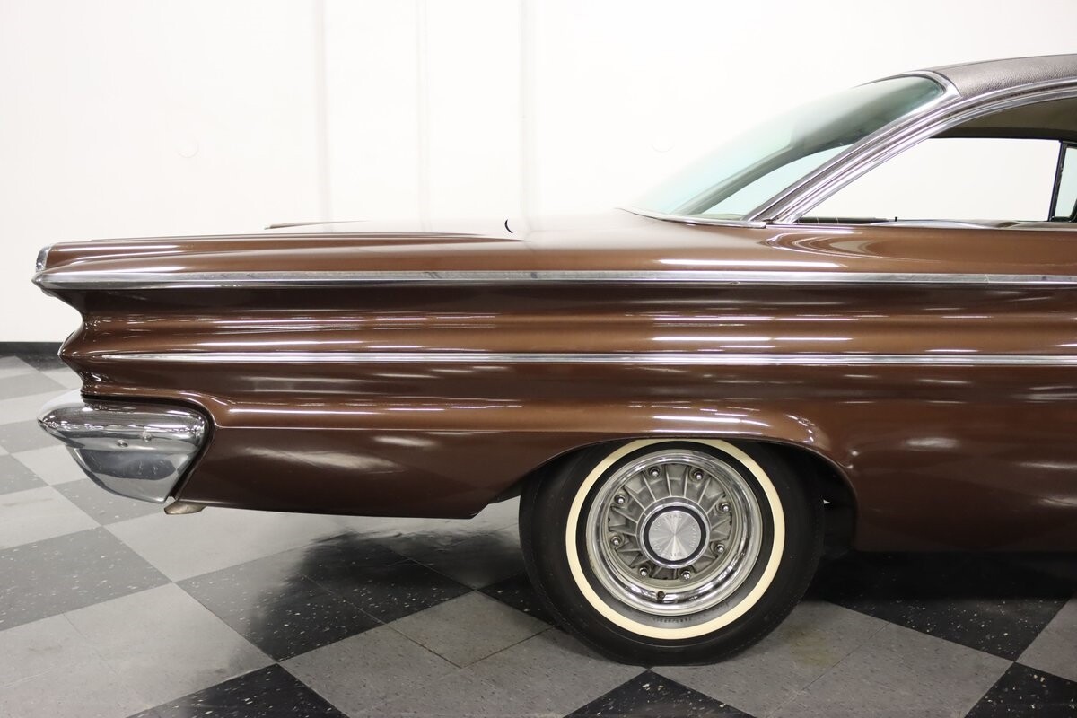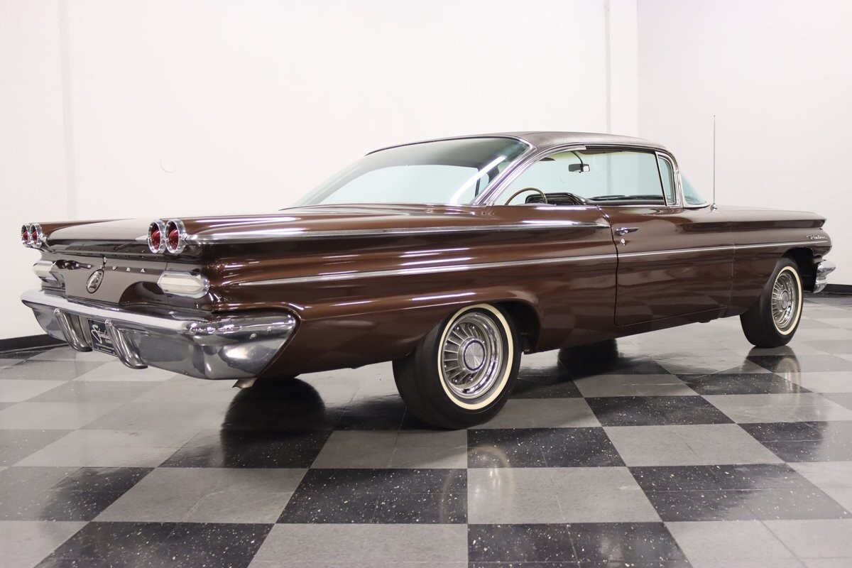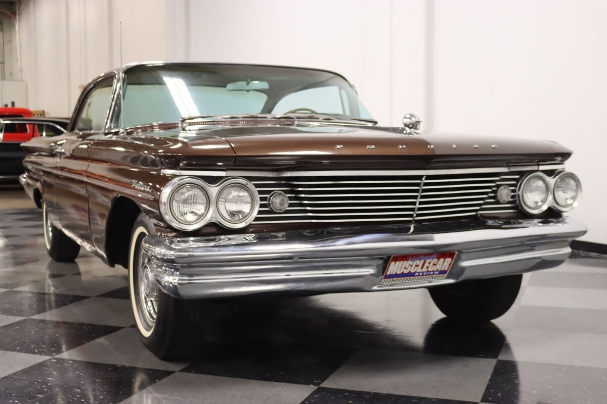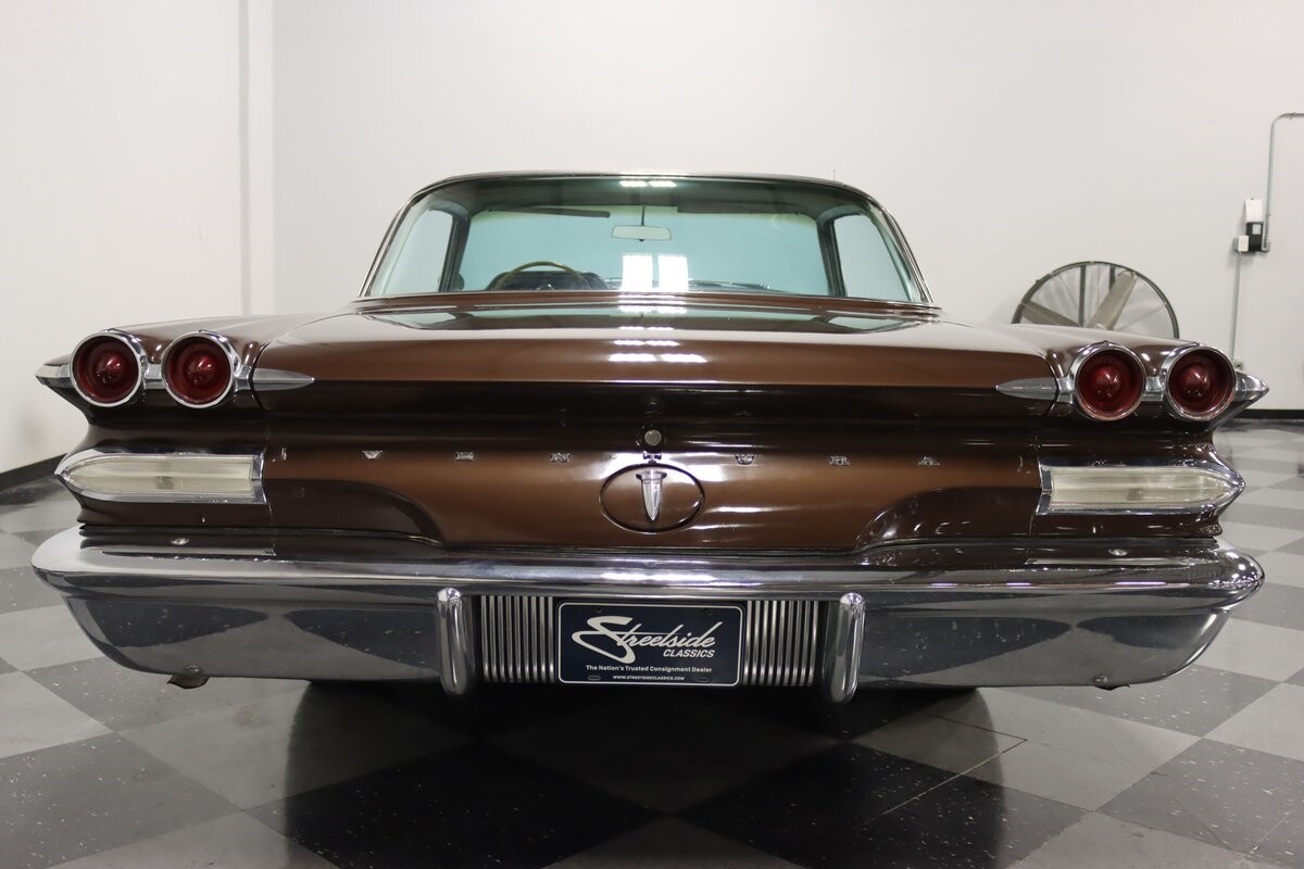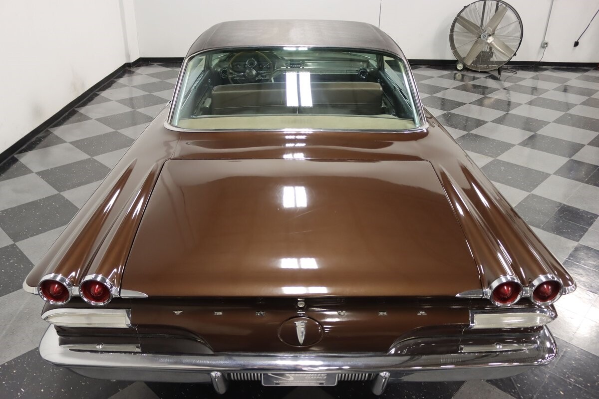 Refinished in Code N Mahogany Metallic, this stunning bubble-top coupe doesn't need a bunch of chrome or a convertible top to stop traffic wherever it goes. Freshly designed for the 1960 model year, the look is pure satellite-era Pontiac all around (the profile practically looks like a spaceship dome atop a flat platform), but one can also see the hints of the GTO to come in the front end. The aforementioned flat hood and decklid make the car look gigantic, even though it's actually built on GM smaller 122-inch wheelbase. It's obvious that the car was painted not terribly long ago, as the finish still has a very fresh look, and although it's certainly a driver, it's a top-end driver with deep, lustrous paint that has very few imperfections to speak of. In fact, take a couple steps back and you likely won't spot a demerit, and a professional buff-and-wax would only further improve things. Undivided horizontal bars in the unique front grille were actually quite revolutionary for the year, and that trim styling continues on the hood trim and profile moldings, which do a great job breaking up all that Mahogany finish. In back, the cool 'rocket' taillights are surrounded by plenty of chrome trim as well, and those have to be the biggest (and coolest) turn signals ever incorporated into such an ornate rear end. There's a lot of sheetmetal all in great condition and the gaps are uniform as well, which is especially critical thanks to that arrow-like side trim. A matching Mahogany vinyl roof adds a touch of sophistication to this Pontiac's already off-the-charts curb appeal, and it helps draw attention to the incredibly cool bubble top – with those incredibly thin pillars and awesome curved E-Z-Eye glass.
